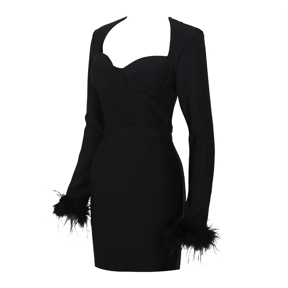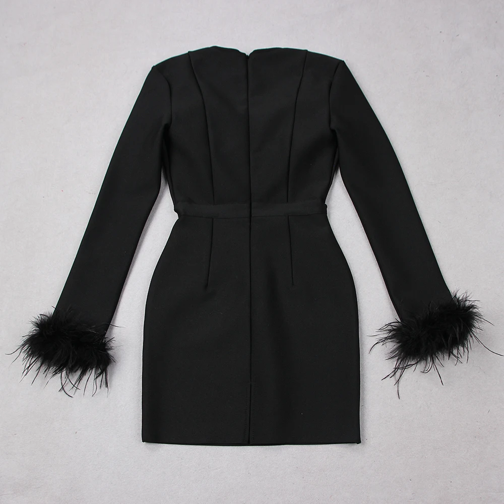 High Quality Feather Bandage Bodycon Long Sleeve Mini Dress Women Ladies Bandage Dresses