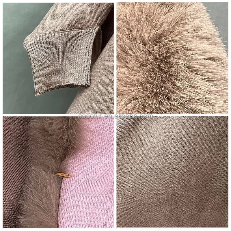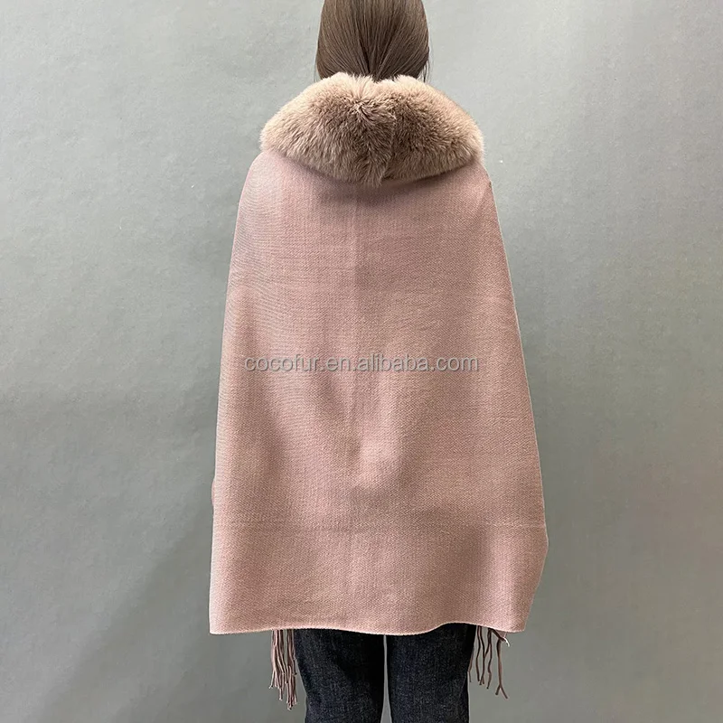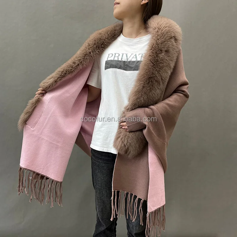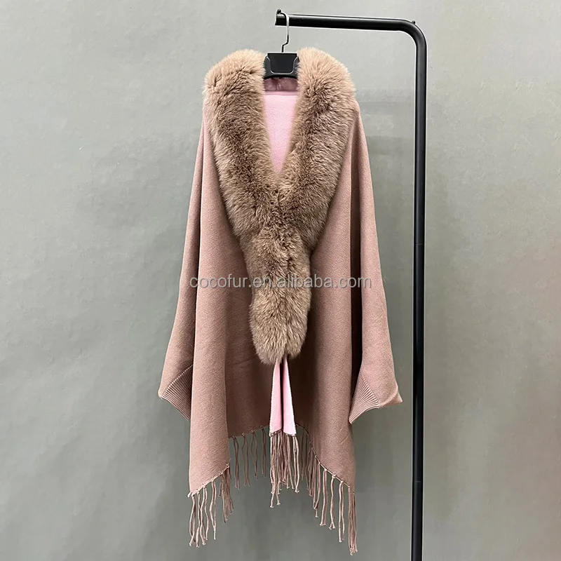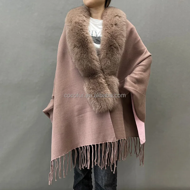 High Quality Luxury Fringe Knitted Poncho Shawl Cape Women with Fox Fur Collar