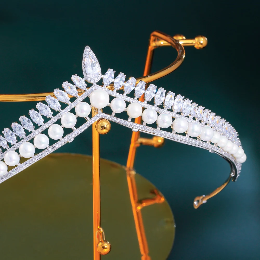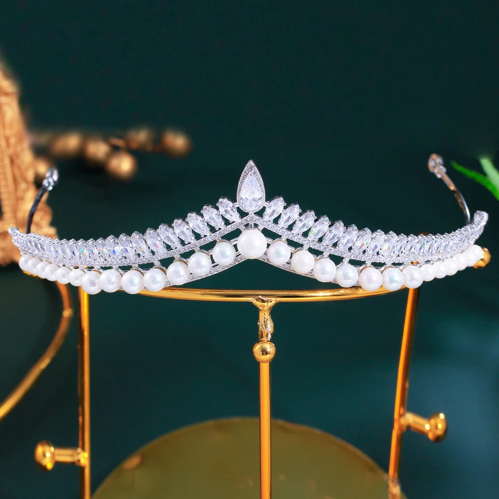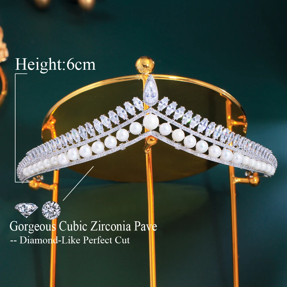 High Quality Queens Headpiece Shiny Cubic Zirconia CZ Wedding Bridal Pearl Hair Tiaras Crown for Bride Hair Accessories