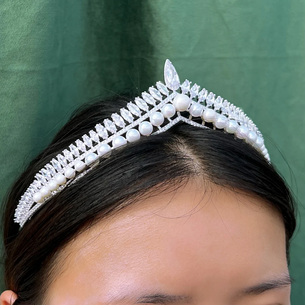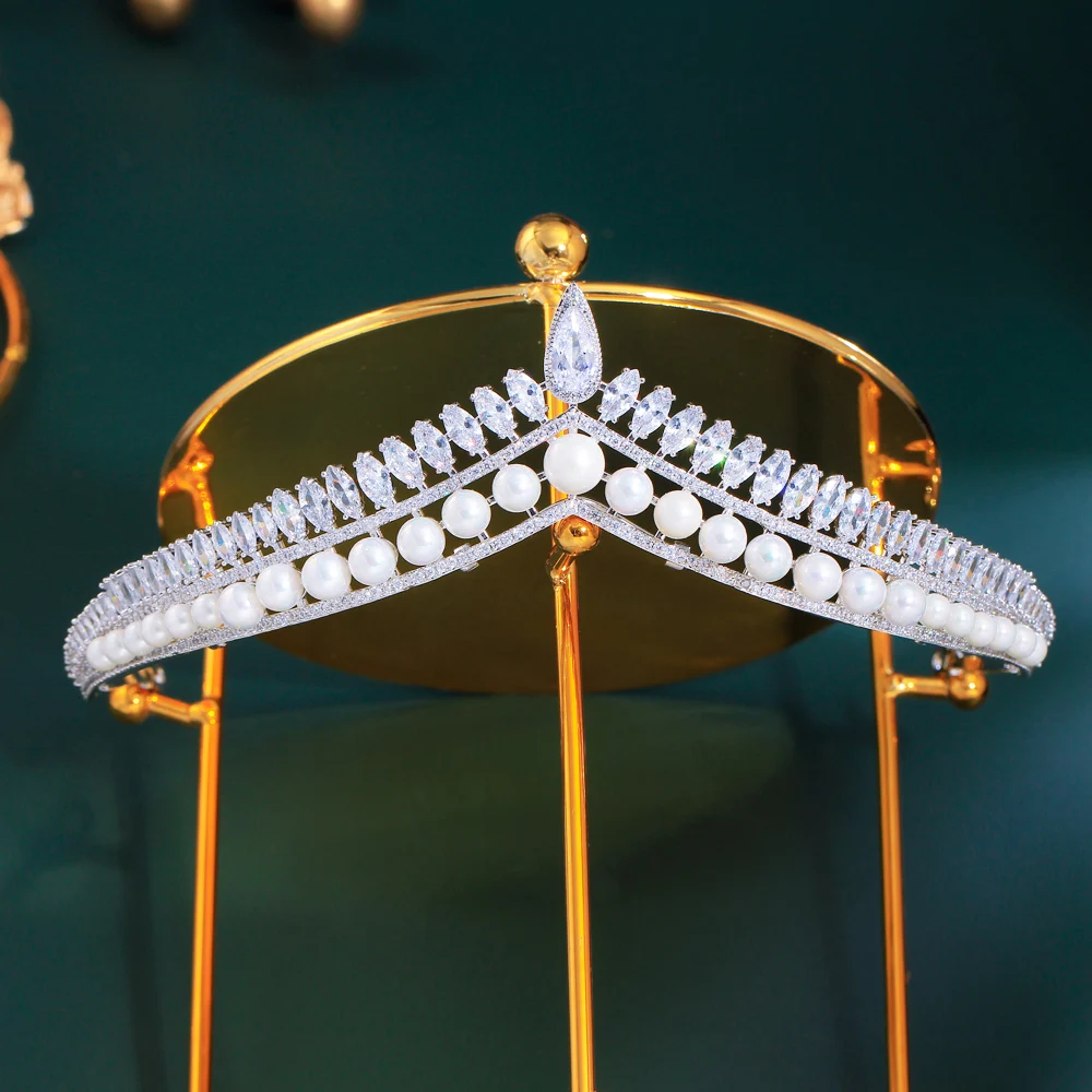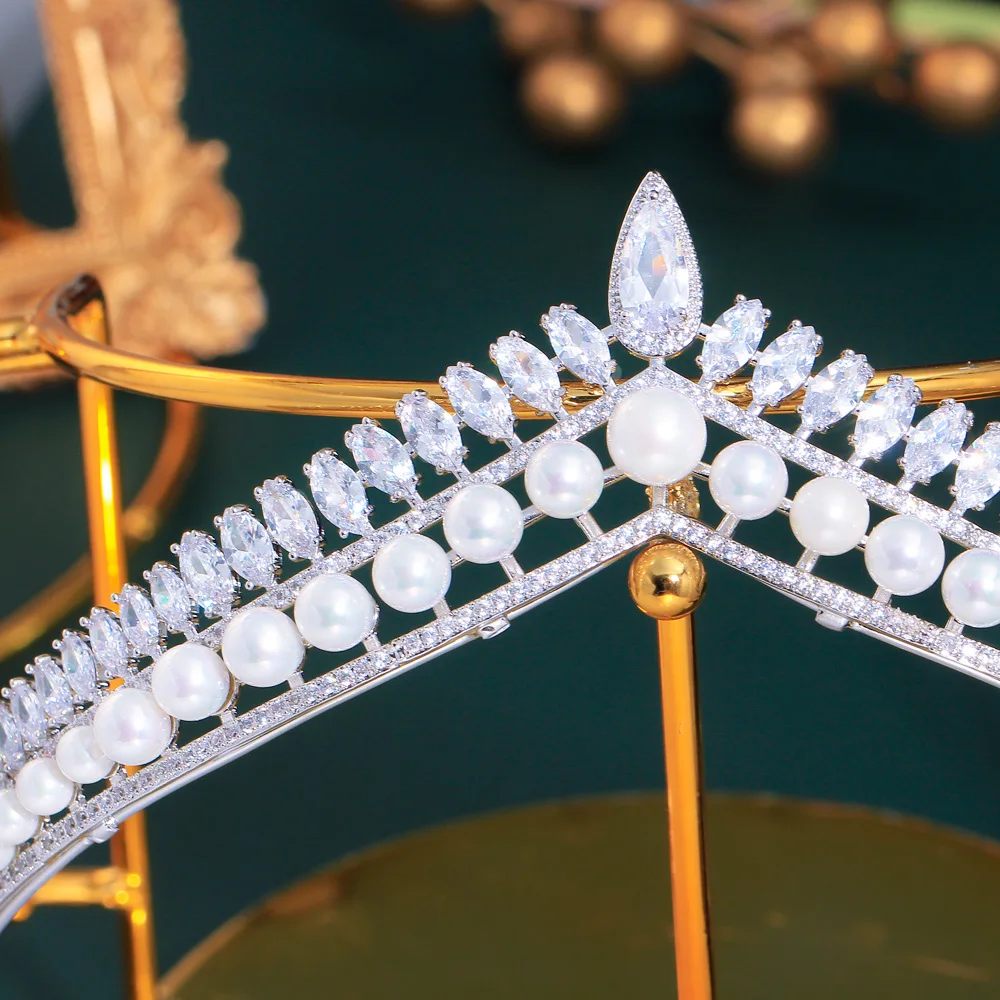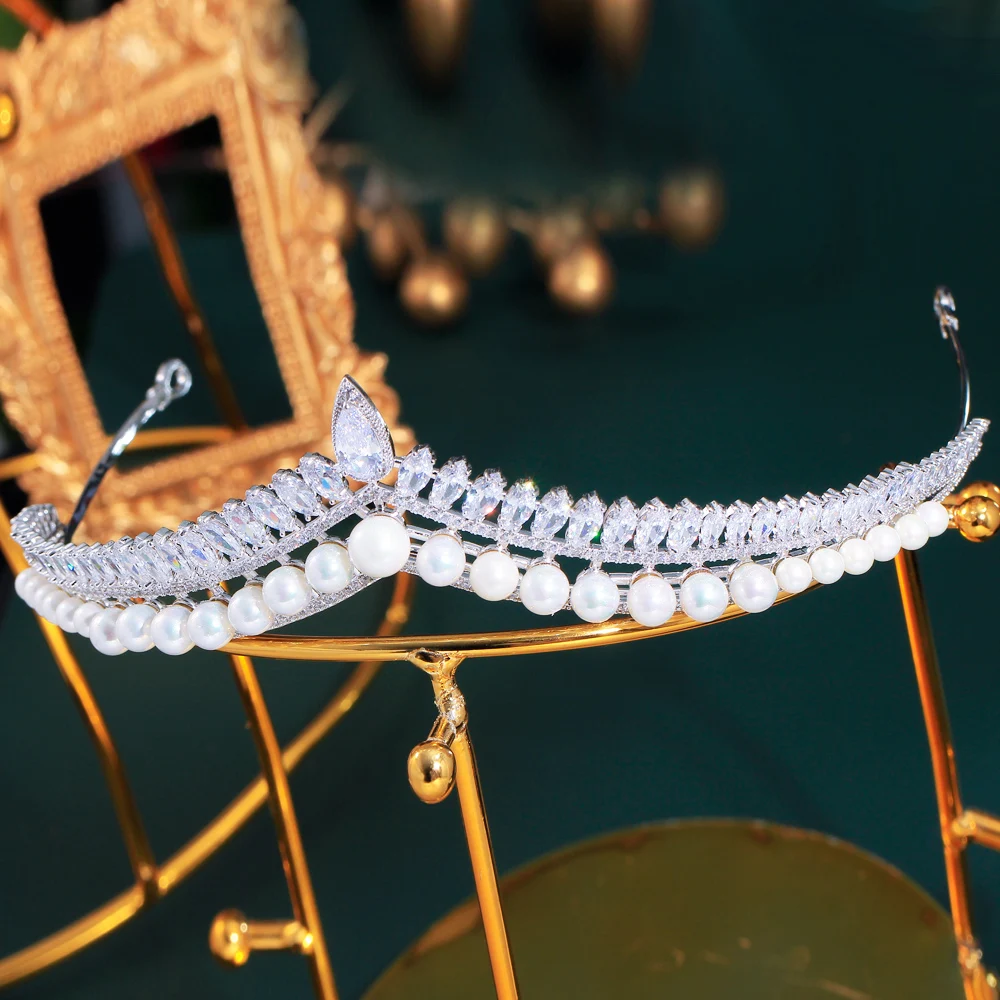 High Quality Queens Headpiece Shiny Cubic Zirconia CZ Wedding Bridal Pearl Hair Tiaras Crown for Bride Hair Accessories