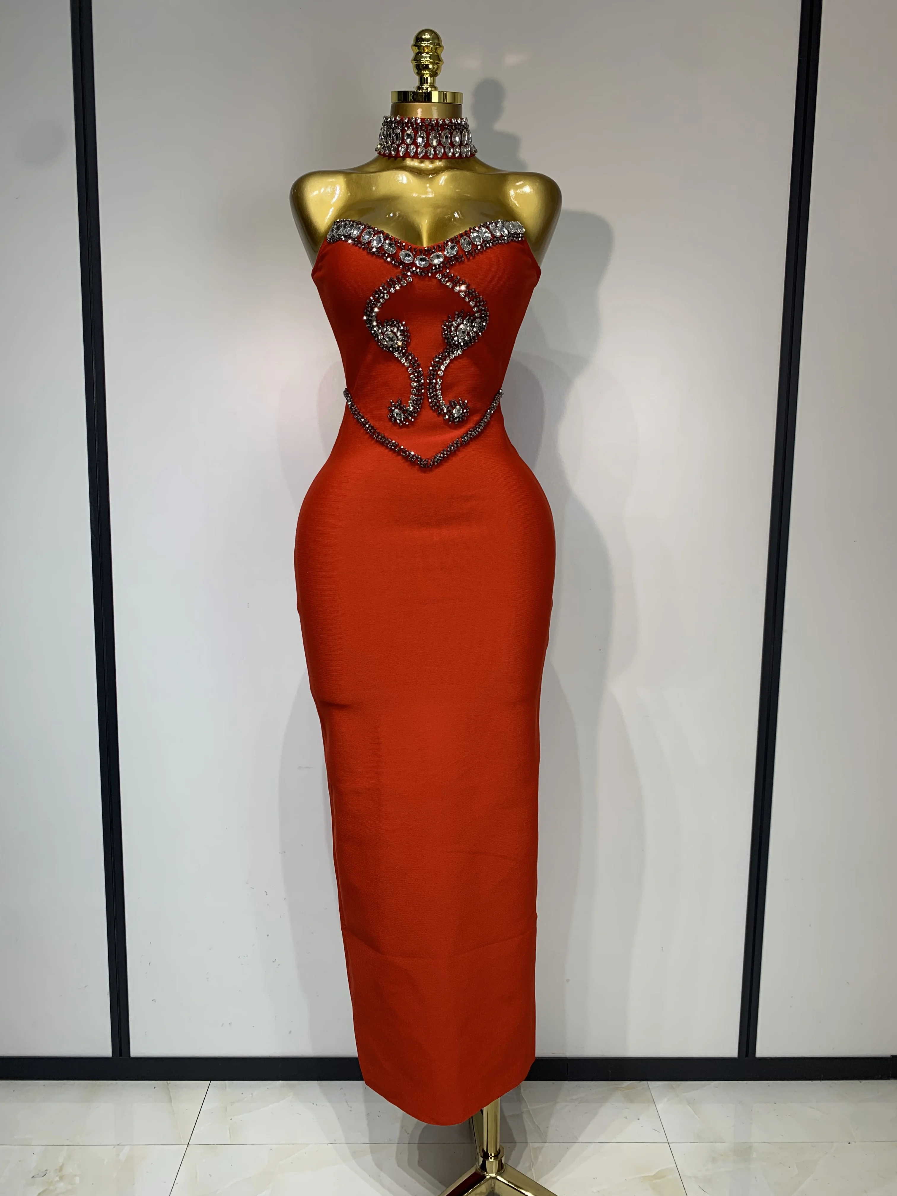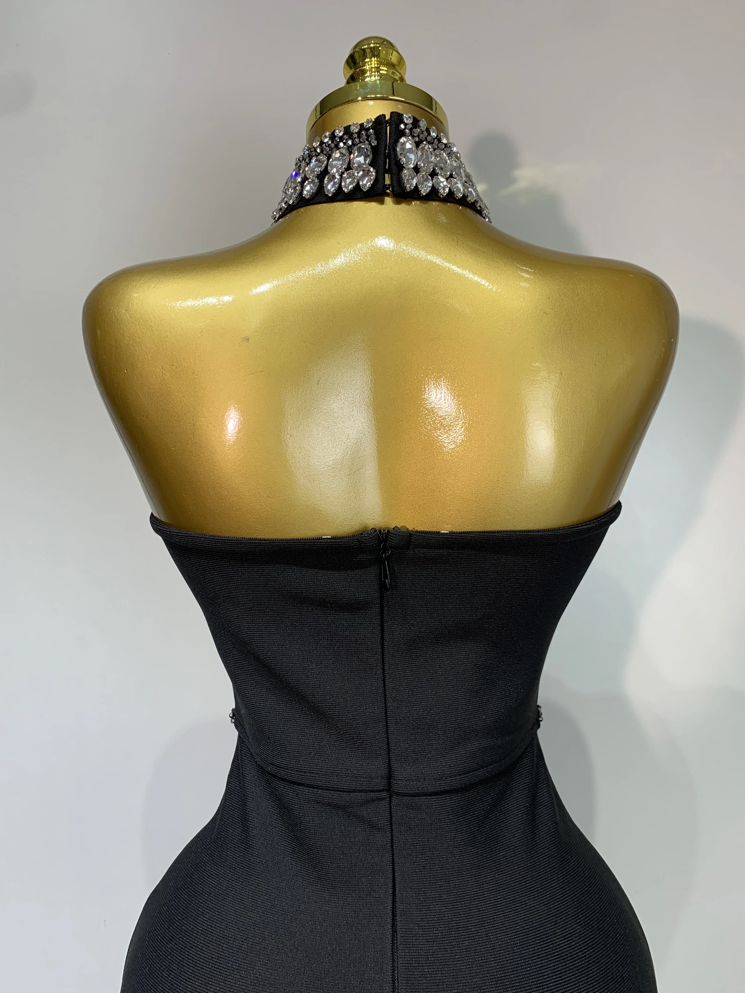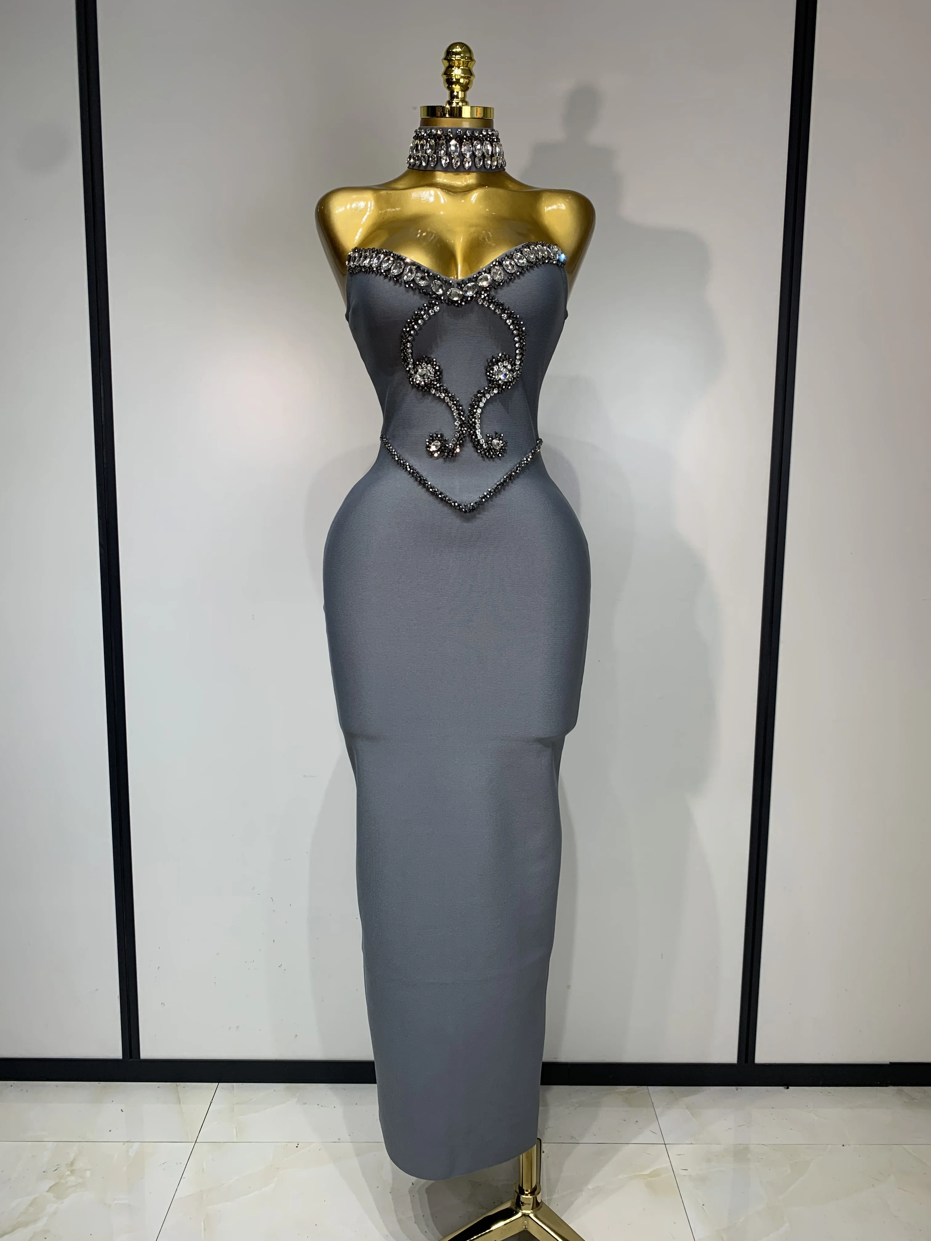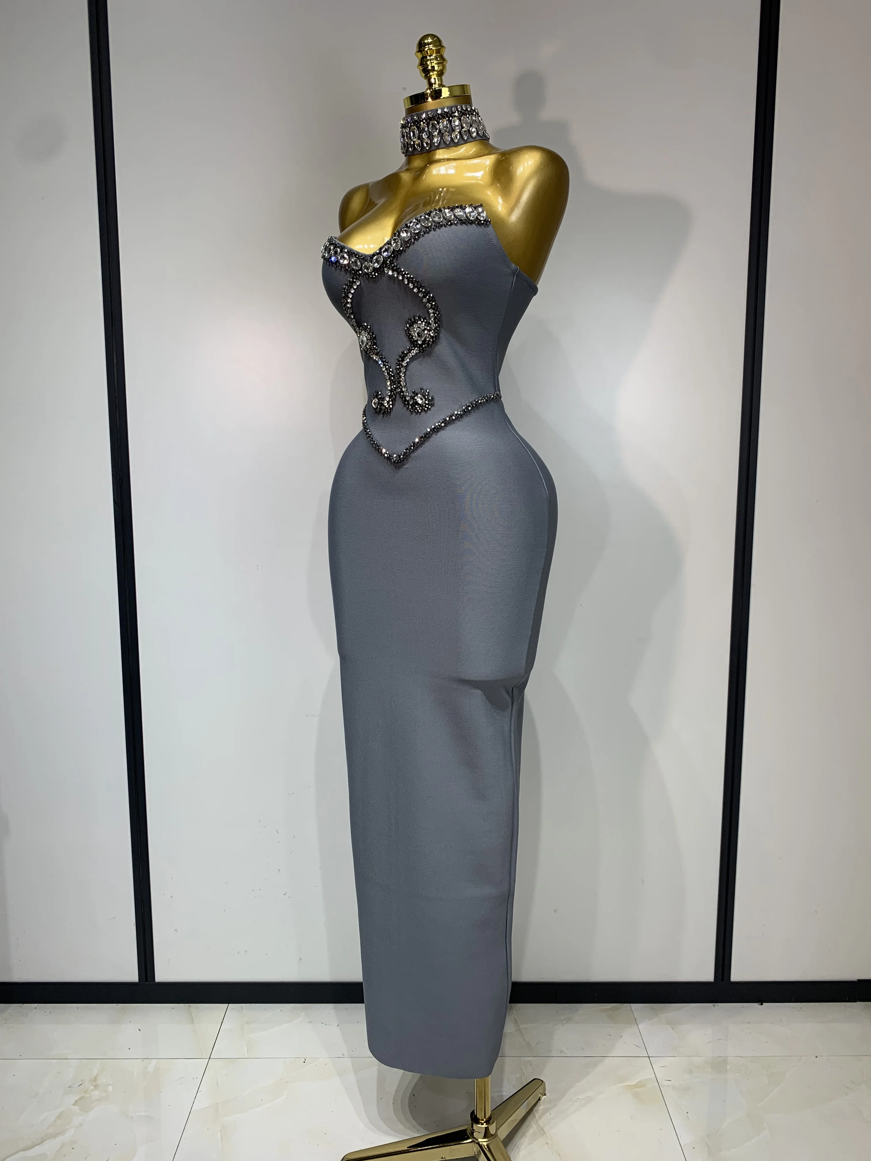 High Quality Strapless Beading With Necklace Bandage Dress Celebrity Elegant Evening Party Fancy Club Birthday Dresses