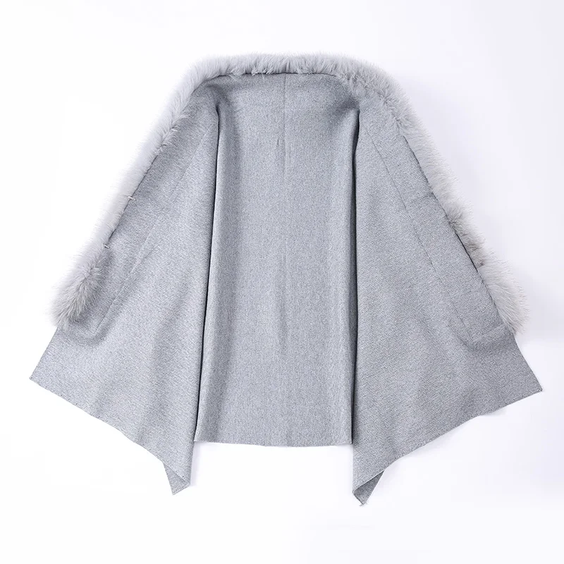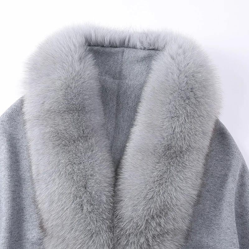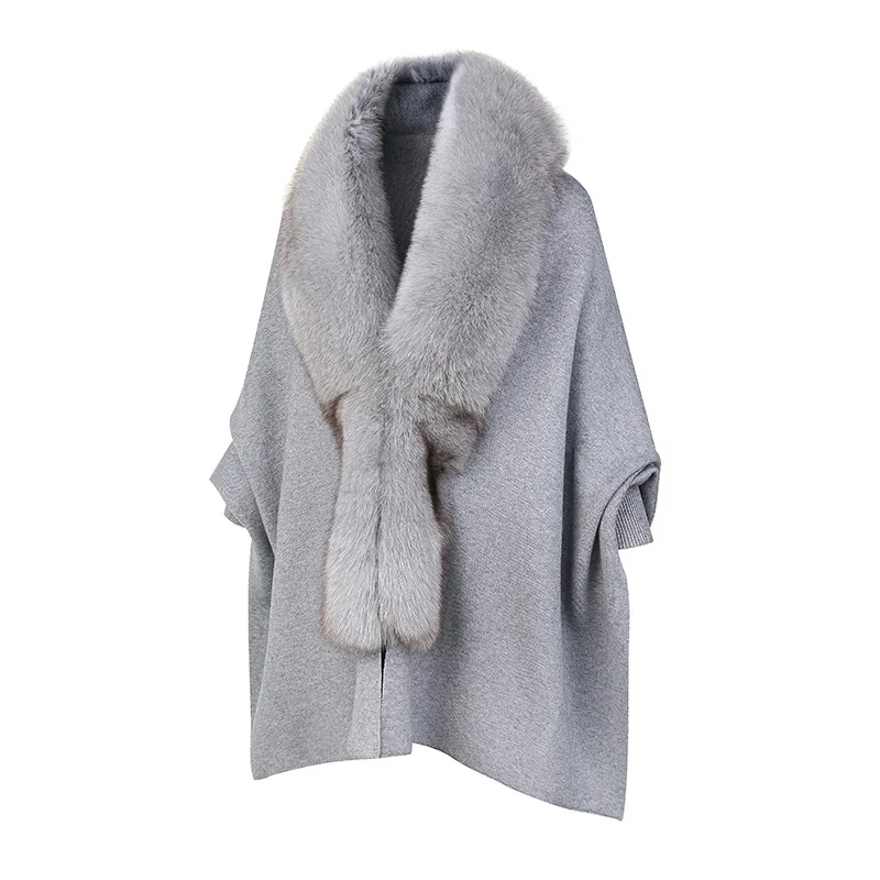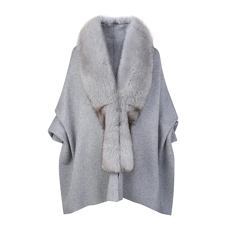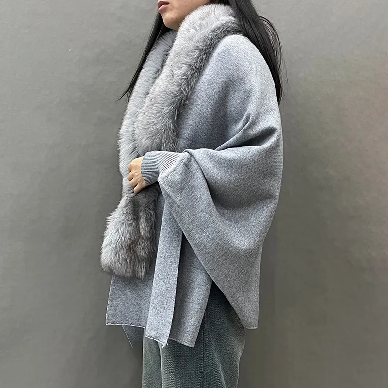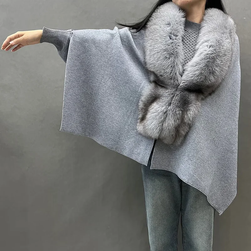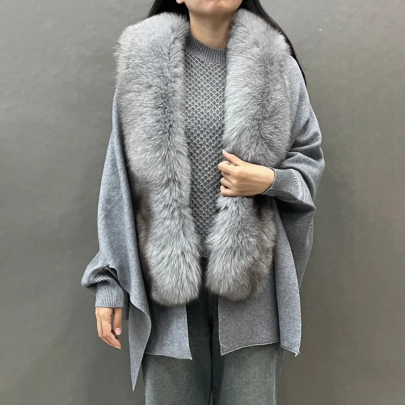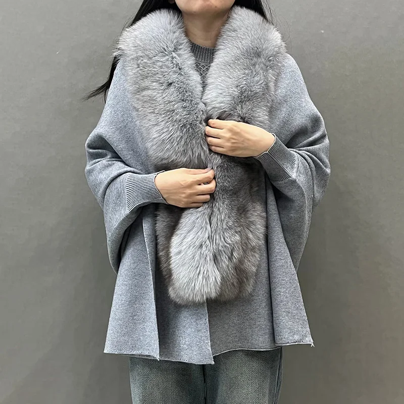 New Arrivals Big Fox Fur Collar Cashmere Poncho Women Luxury Real Fur Shawls