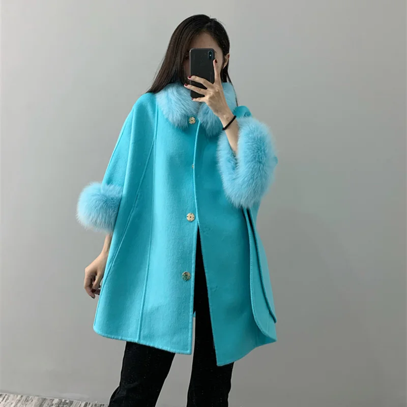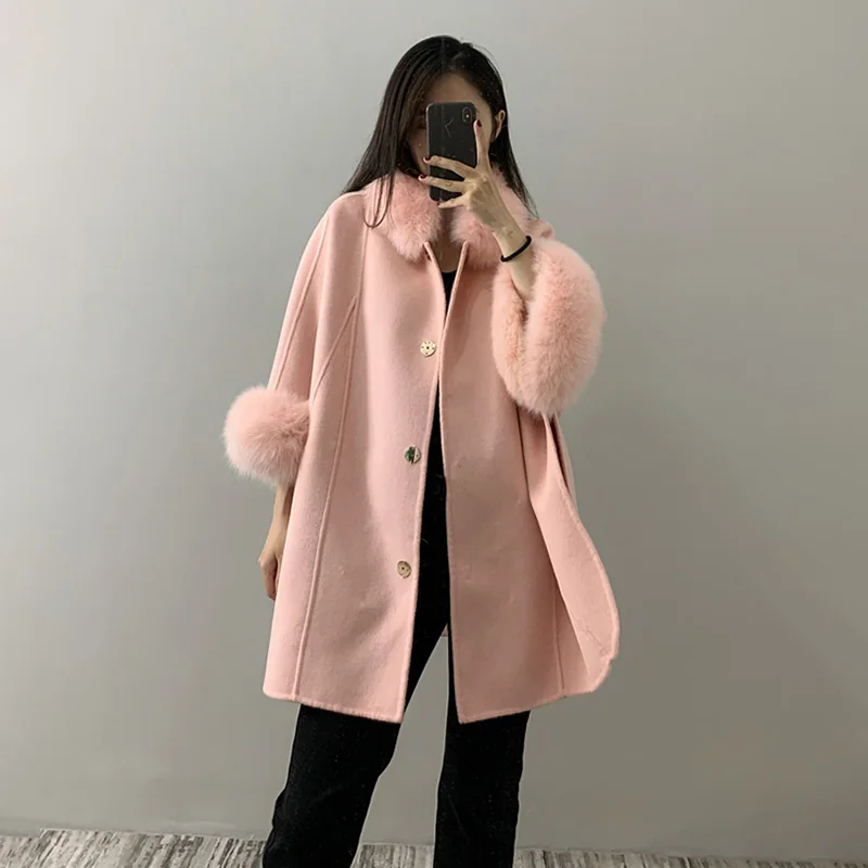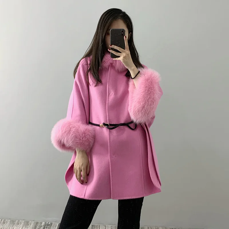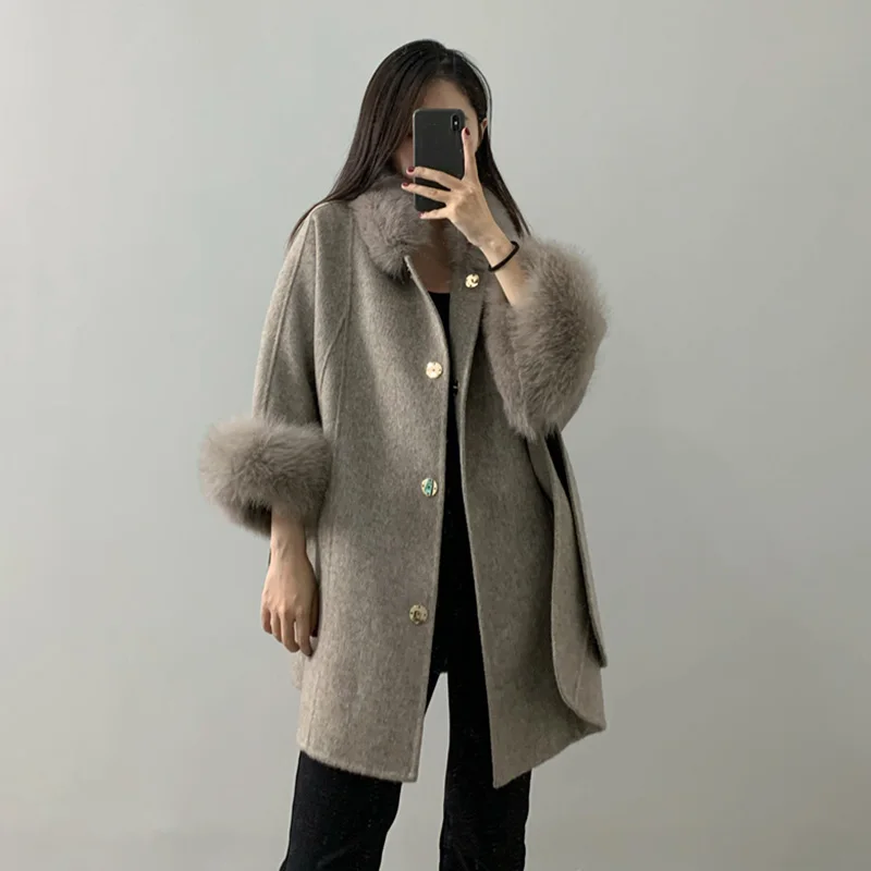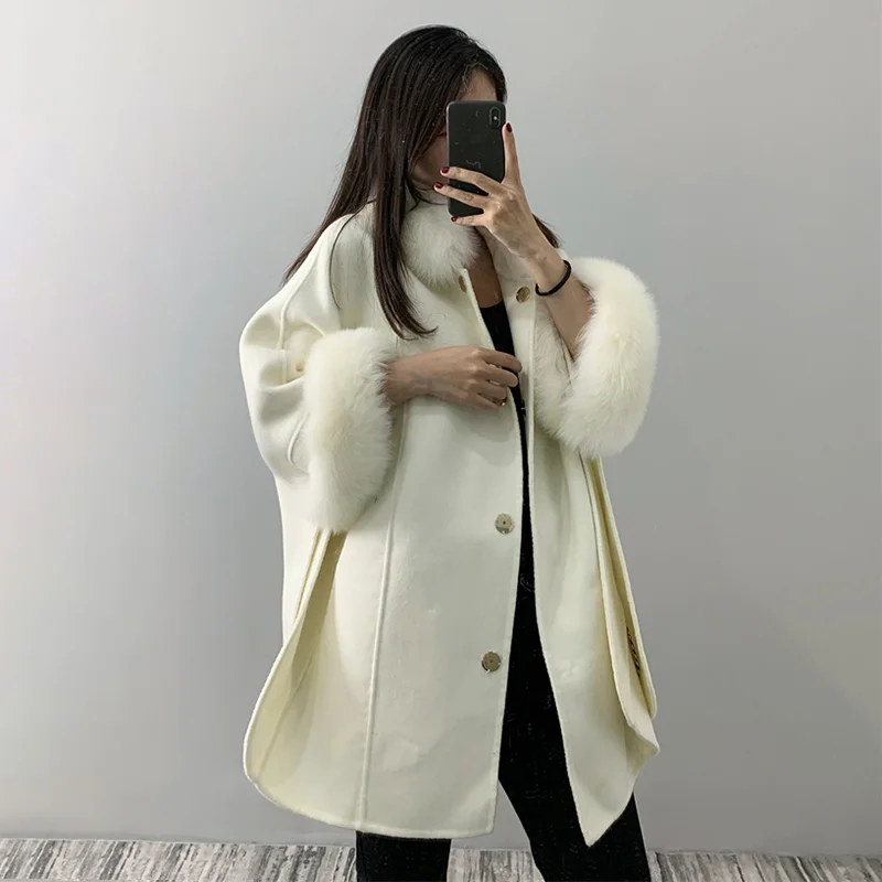 High Quality Winter Sheep Wool Fox Fur Collar Cuffs Coat Real Cashmere Wool Coat Women
