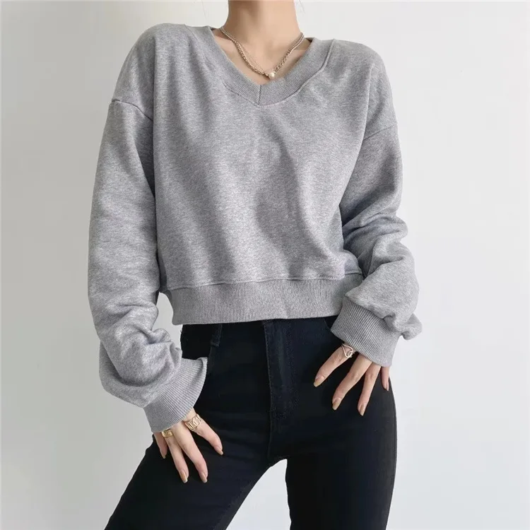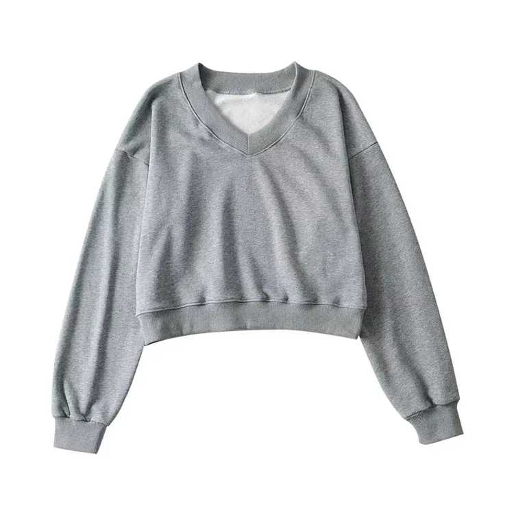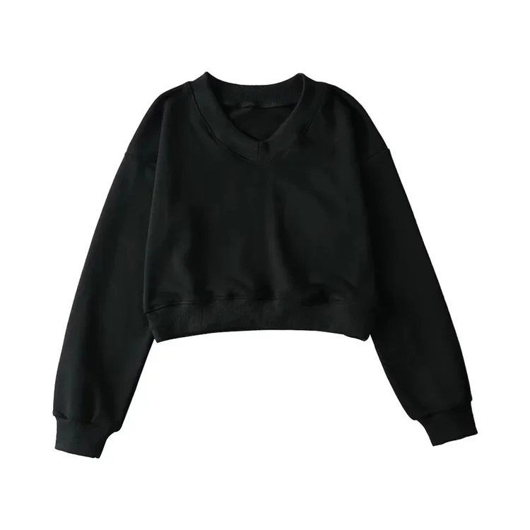 High Quality Women's Hoodies & Pullover polyester Terry V neck long sleeve rib hem Crop Top Custom logo for women's hoodie