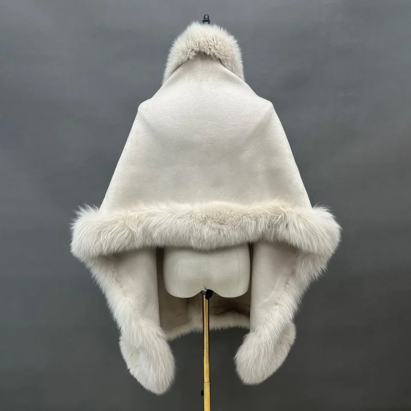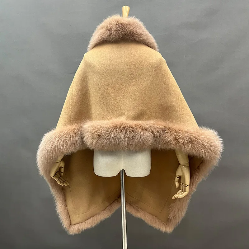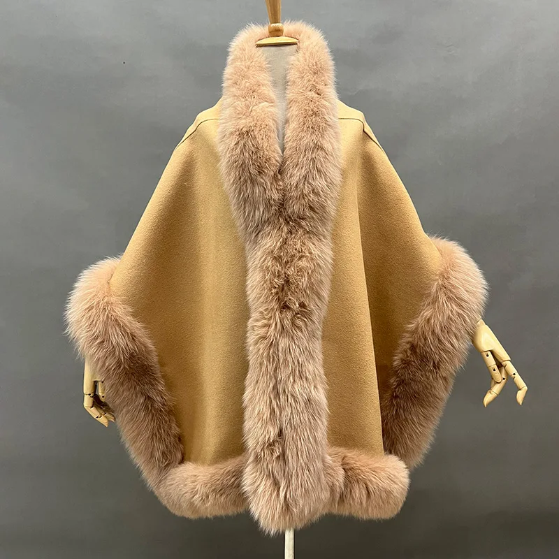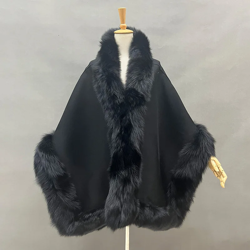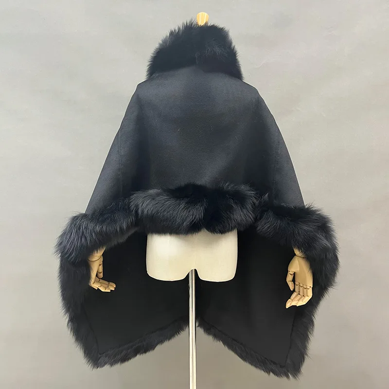 High Quality Wool Cape Real Fox Fur Trimming Shawls Elegant Wool Ponchos for Women