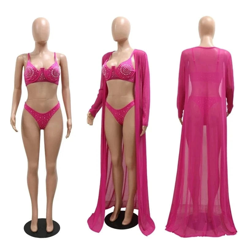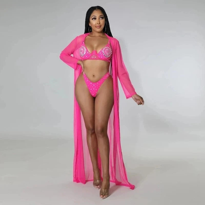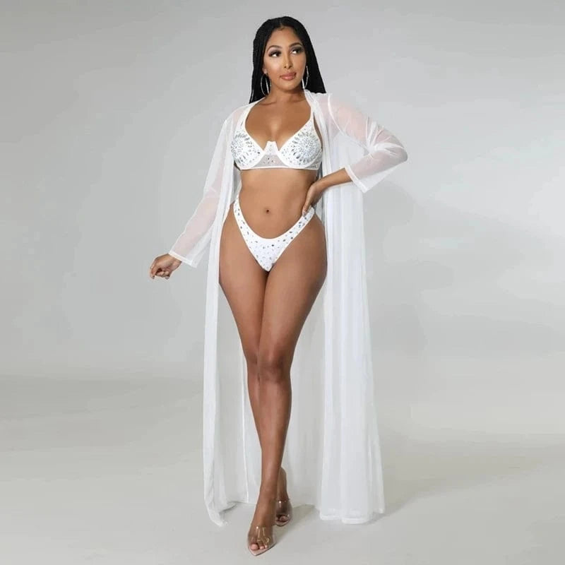 High Waist 3 Piece Bikini Set with Cover Up Sexy Crystal Rhinestone Bathing Suit Beachwear Swimming Suit Beach Outfits for Women