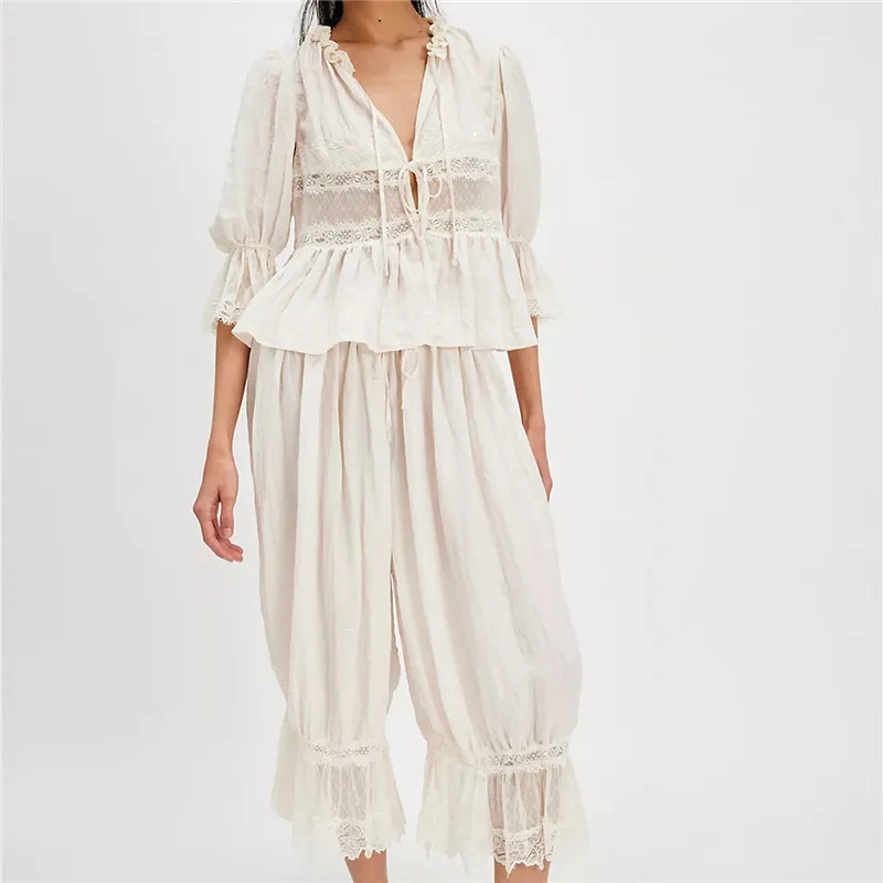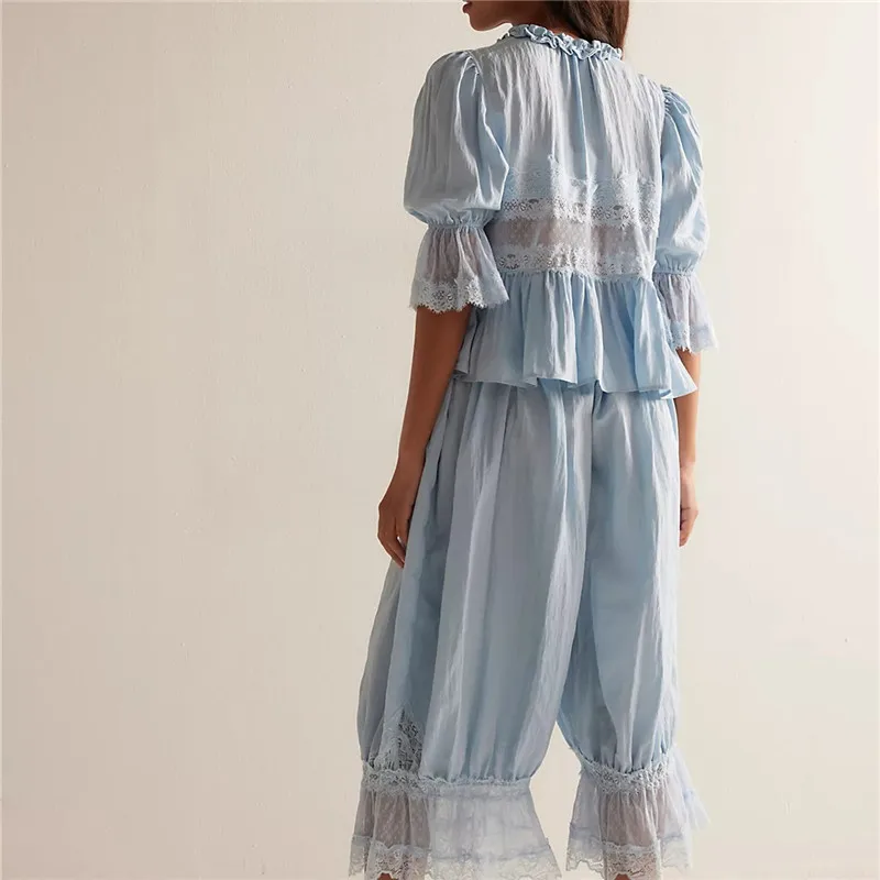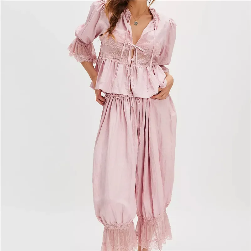 hirigin Women Lace Trim 2 Piece Pajamas Sets Y2k Bow Tie Front Short Sleeve Shirts + Ruffle Flared Lantern Pants Loungewear