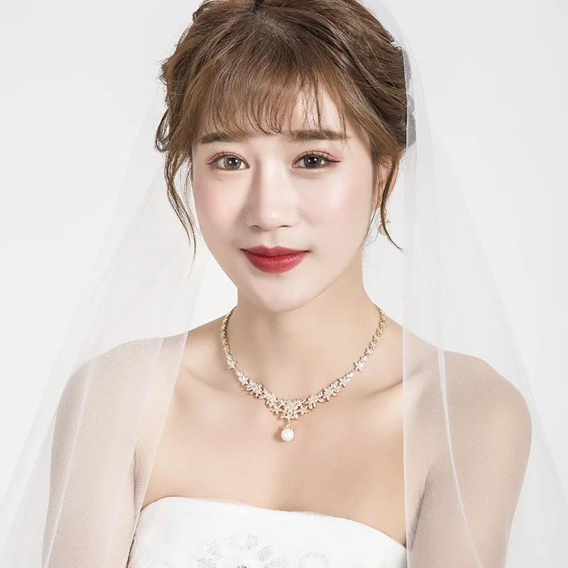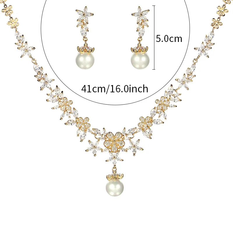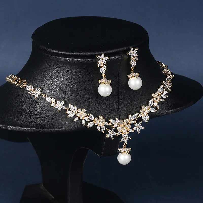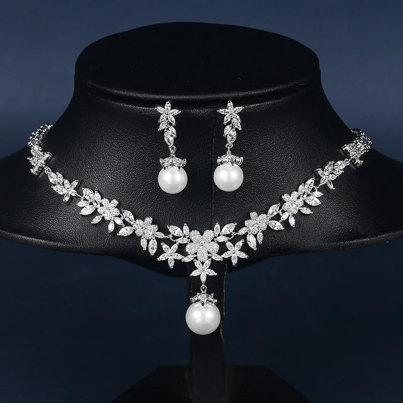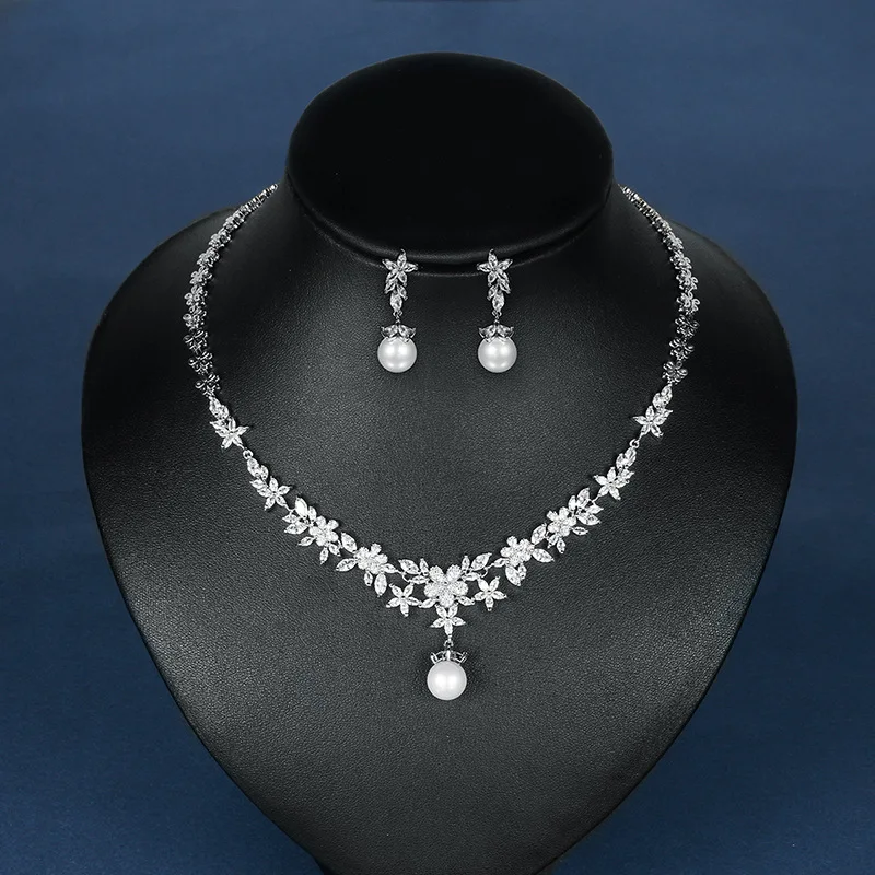Hot selling wholesale wedding jewelry sets exquisite zircon flower pearl pendant necklace dangle drop earrings bridal party set