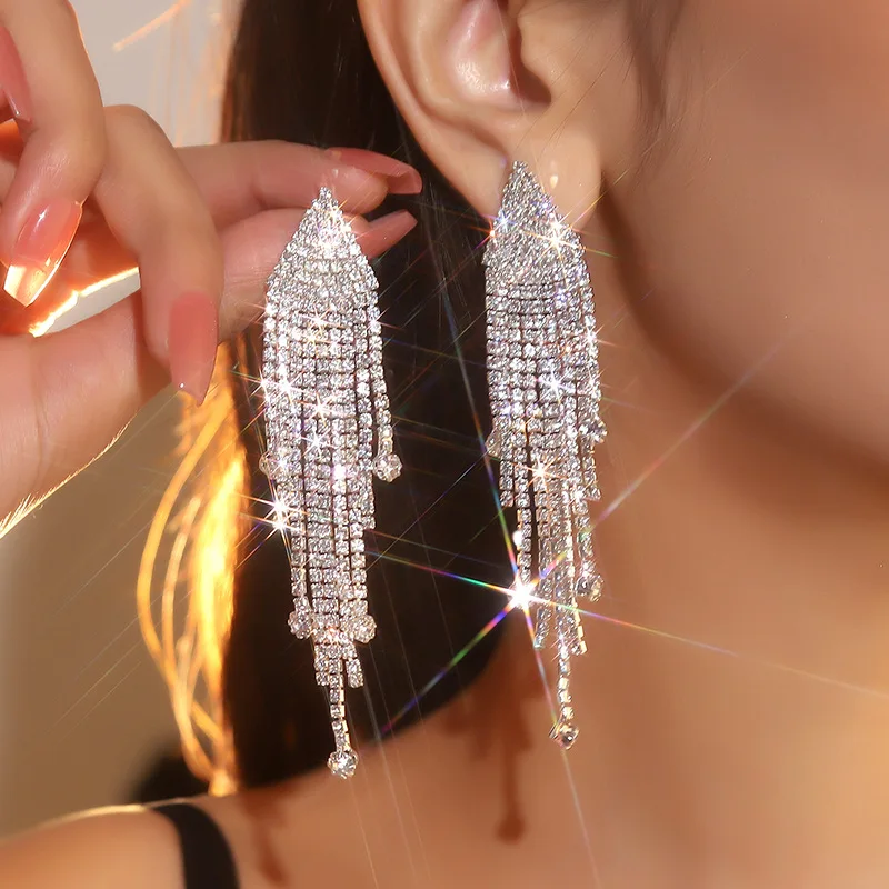 Hoyon Fashion Jewelry Accessories Long Tassel Full Rhinestone Drop Earrings Golden Leaf Dangle Earrings for Women