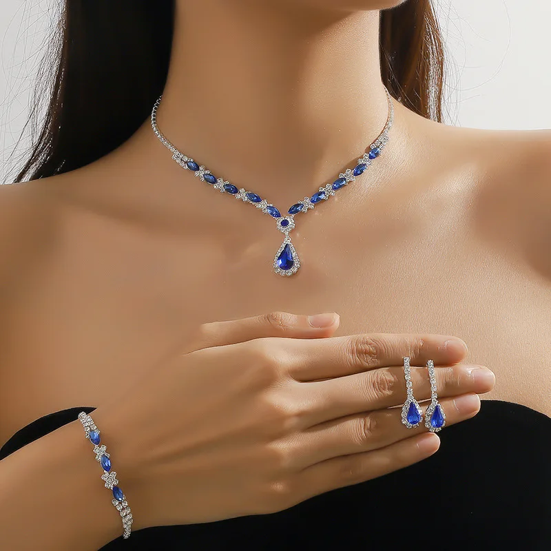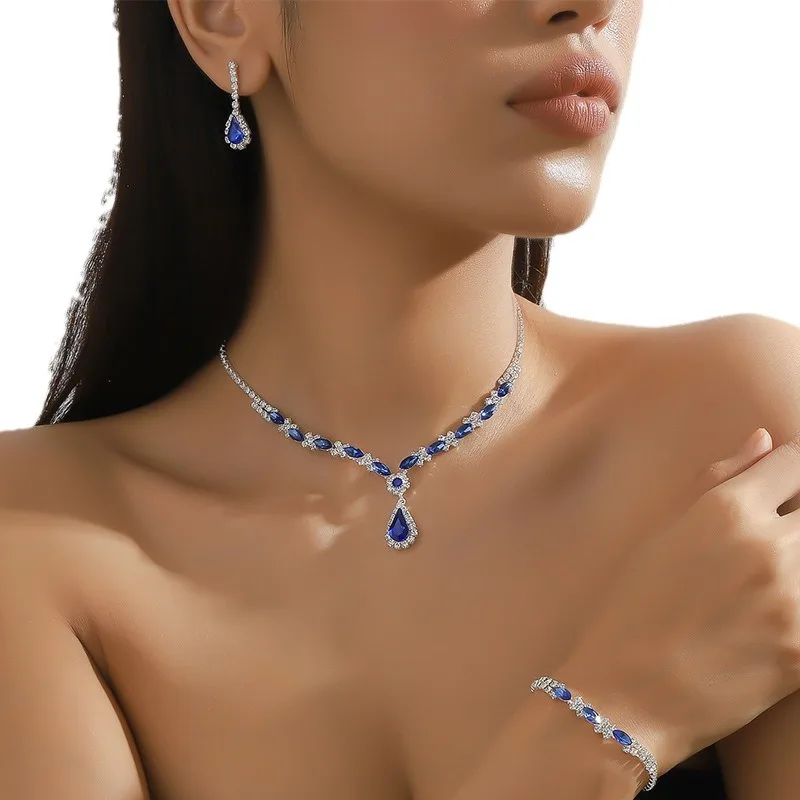 Hoyon Fashion Red Crystal Necklace Earrings Bracelet Set Hot Sale Blue Rhinestone Jewelry Set Europe and the America style