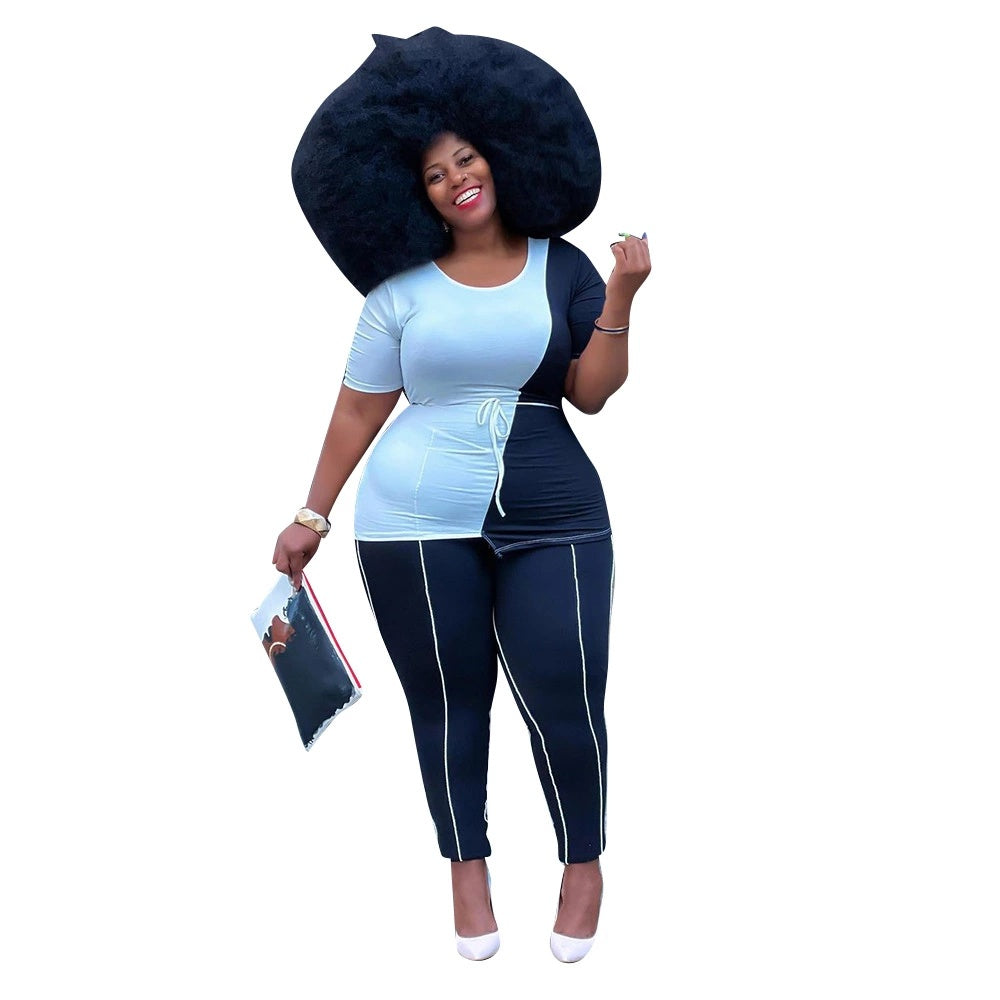 J&H fashion 4XL plus size women's patchwork crew-neck top and striped print trousers 2 pieces sets