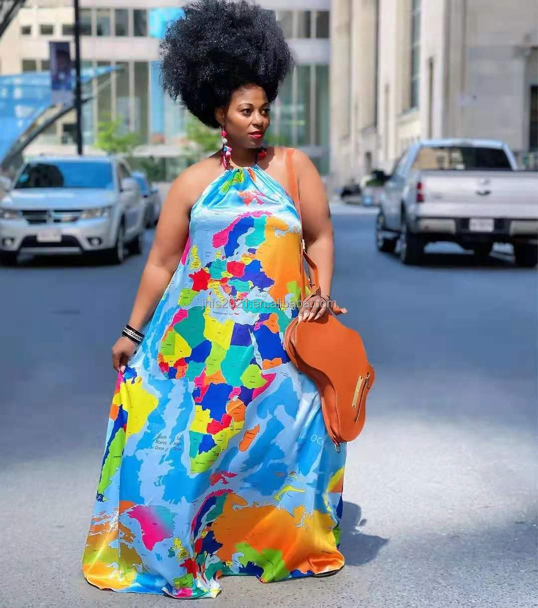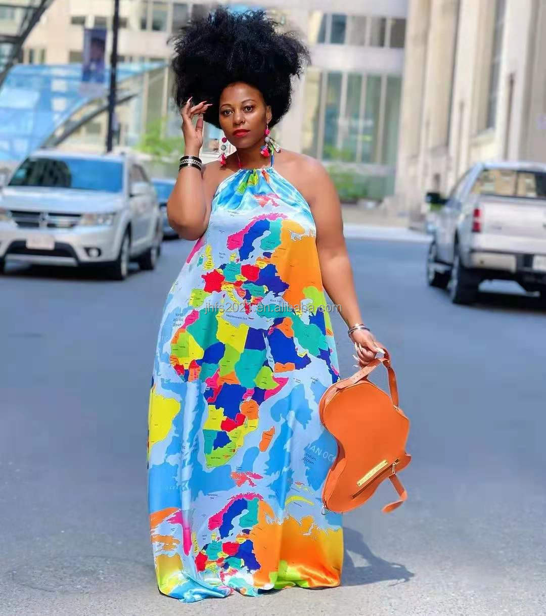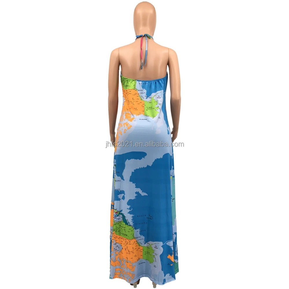 J&H fashion plus size women's dresses chic design world map printed halter dress casual loose long dress for women