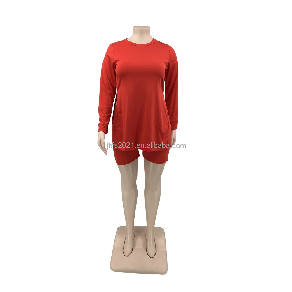 J&H fashion Summer Ropa De Mujer Plus Size Solid 2 Piece Sets Longsleeve Round Neck Slit Sides Top High Waisted Leg Shorts