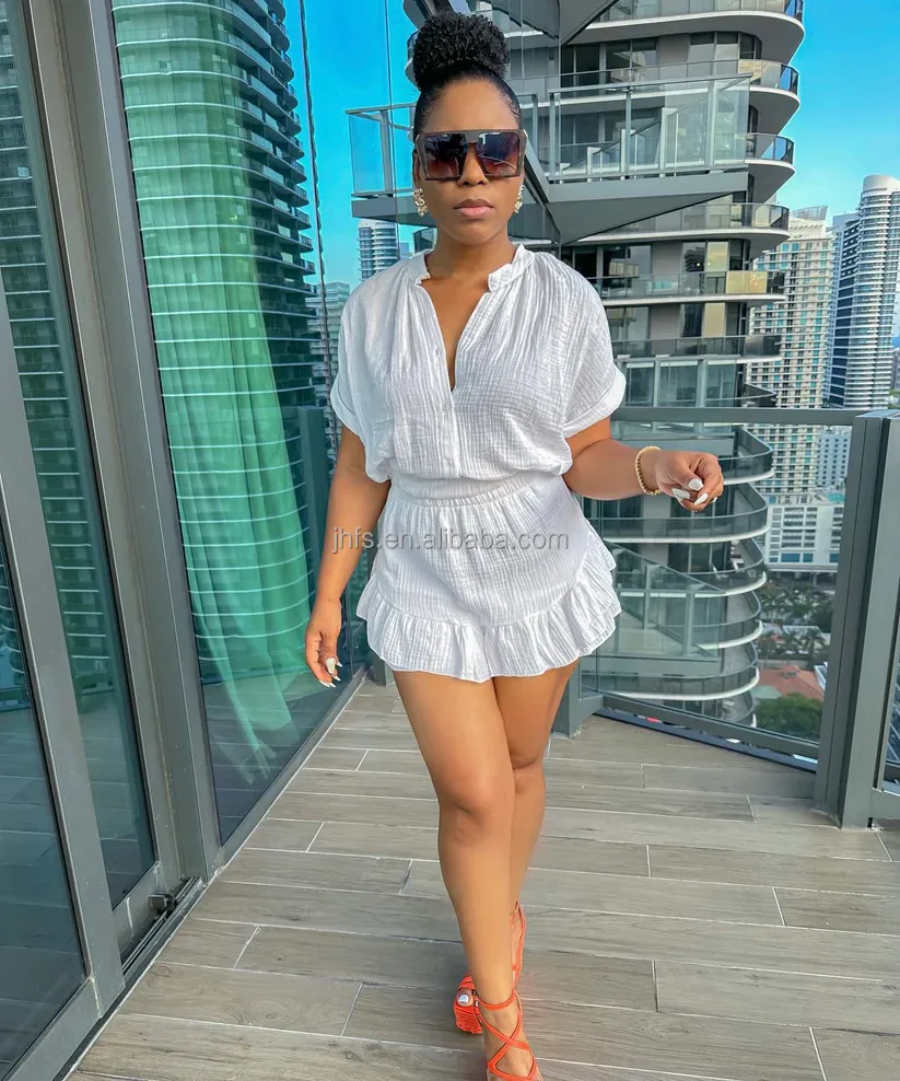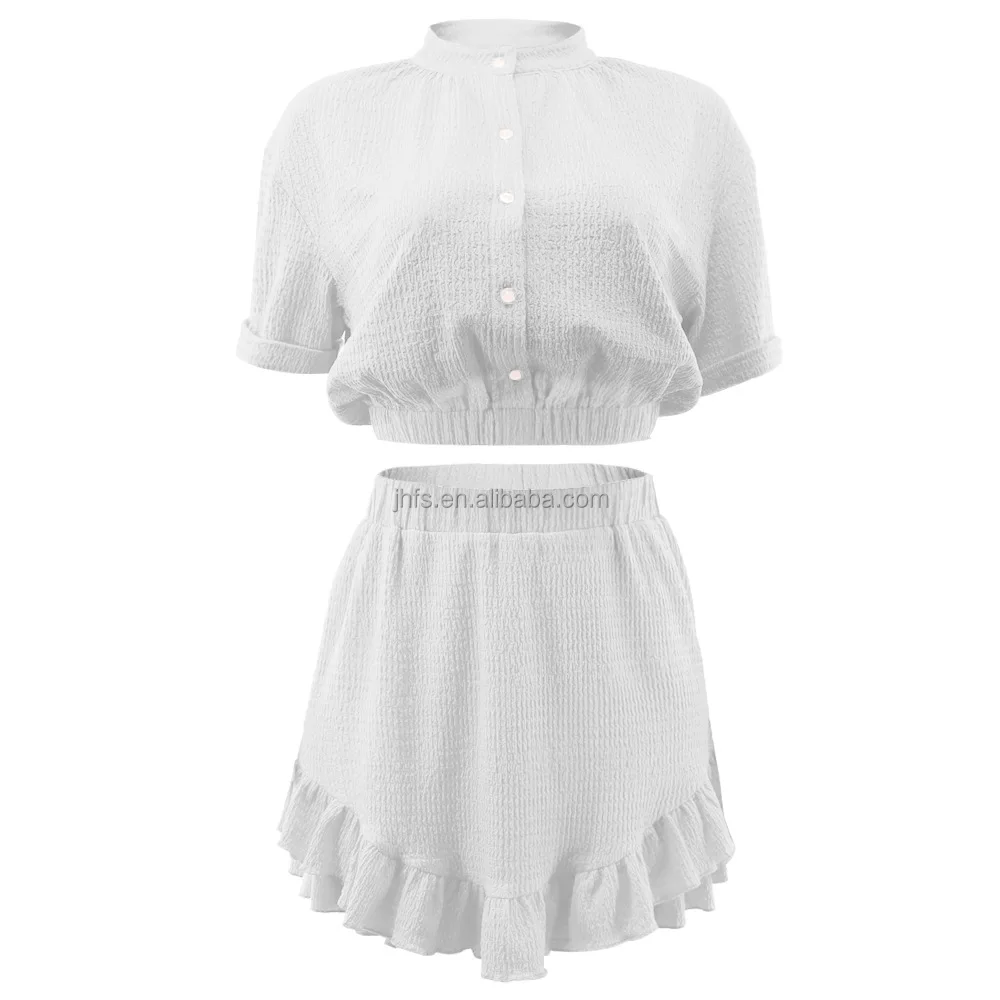 J&H trendy crop shirts and ruffle mini skirts solid color slim fit casual 2 piece skirt sets