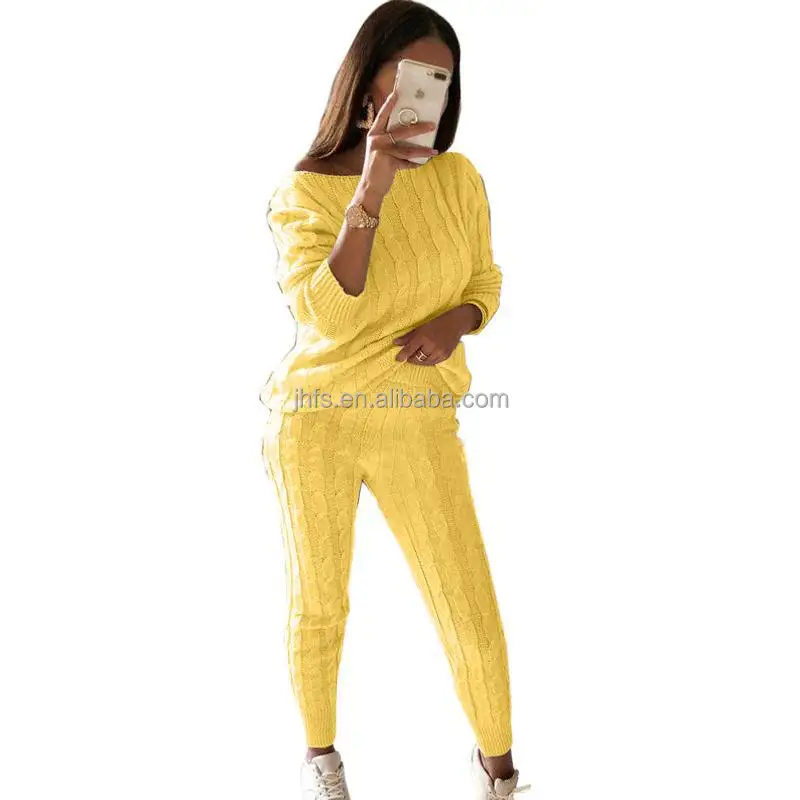 J&HCasual 2024 Casual Fall Winter Solid Color Long Sleeve Knit Sweater Top Pant Outfits Women Sexy Two Pieces Sweater Sets