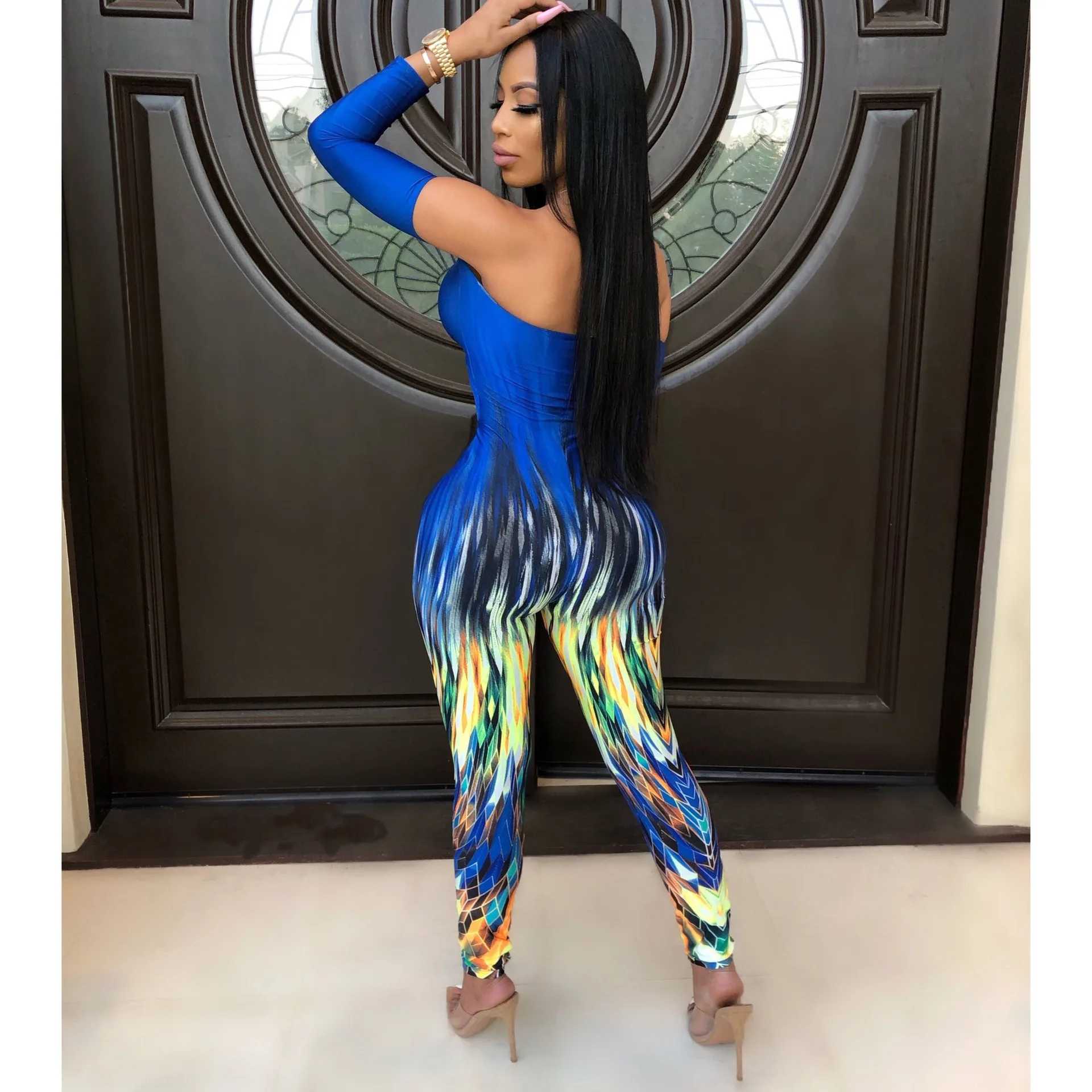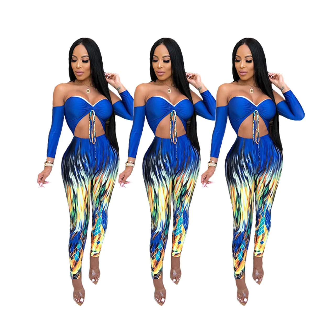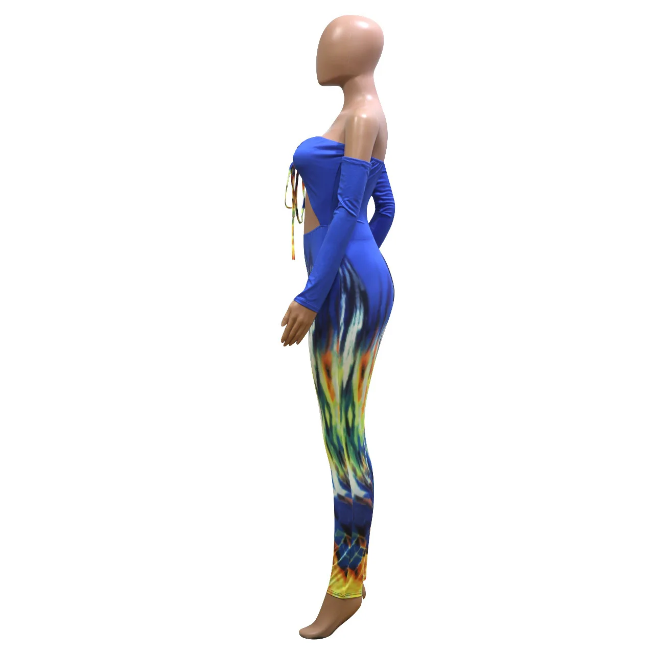J8552 Sexy one piece jumpsuit women blue tie dye off shoulder jumpsuit long sleeves waist sexy jumpsuit women