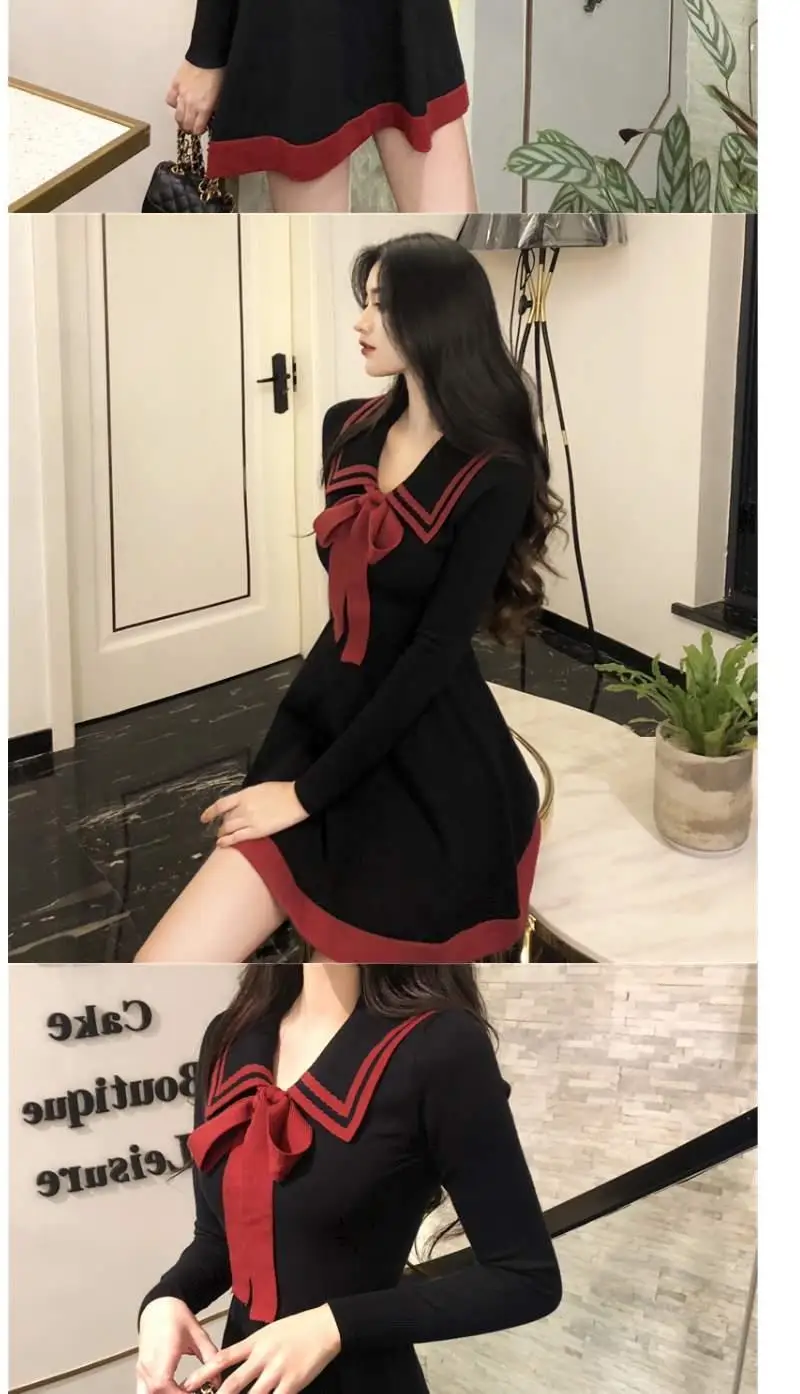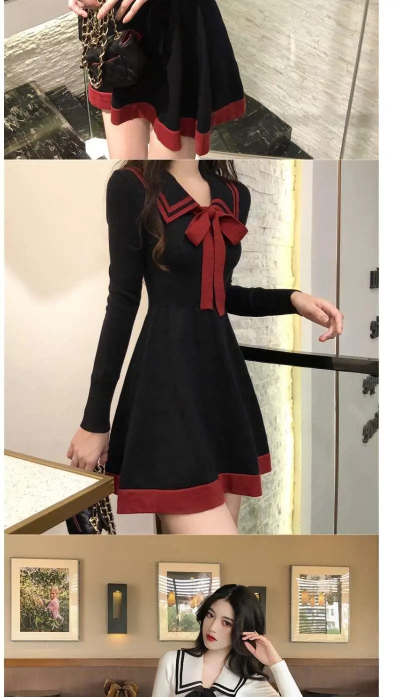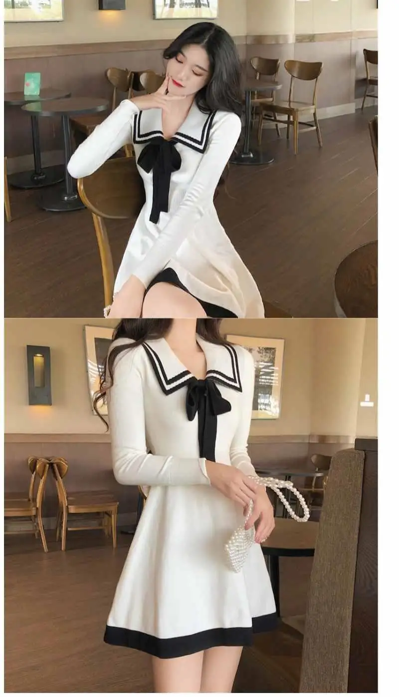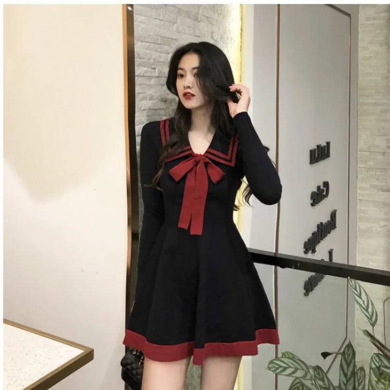Japanese Style Knitted Dress Preppy Style Navy Kawaii Short Dresses Outfit Spring Long Sleeve Mini Dress Woman Clothes