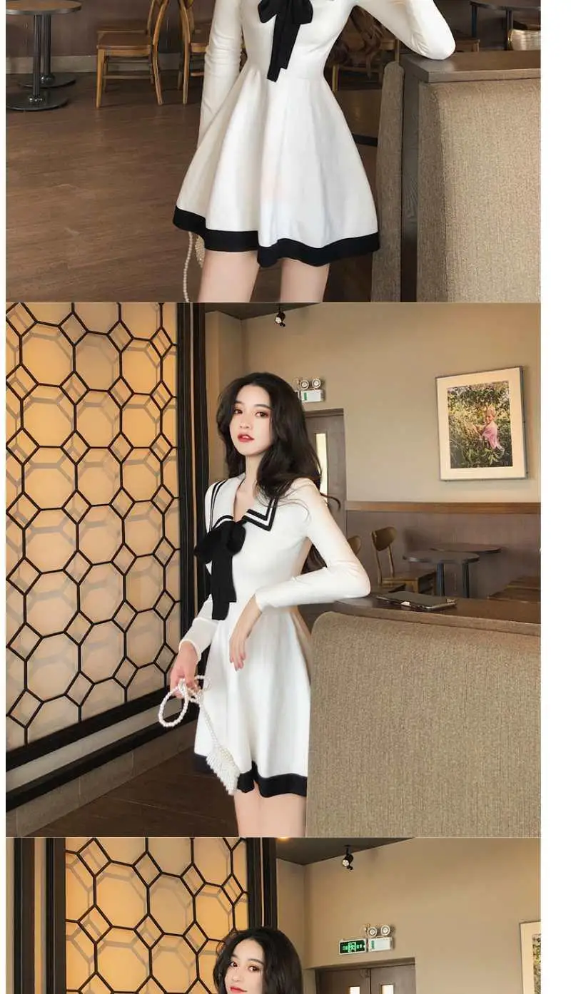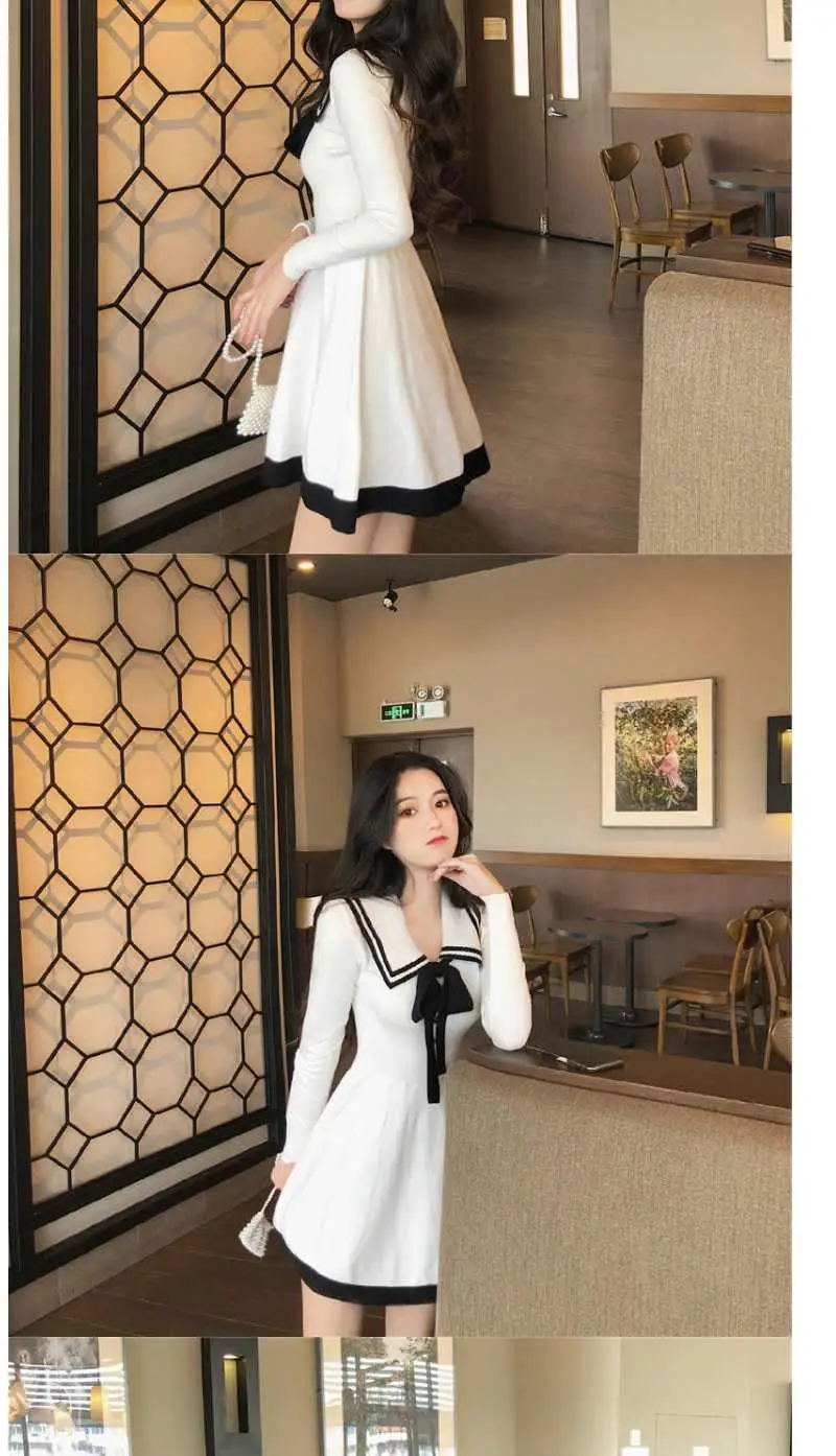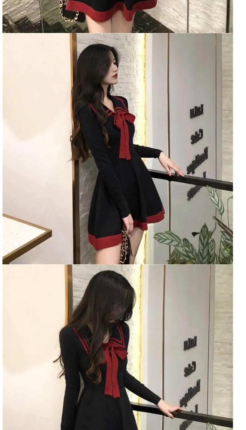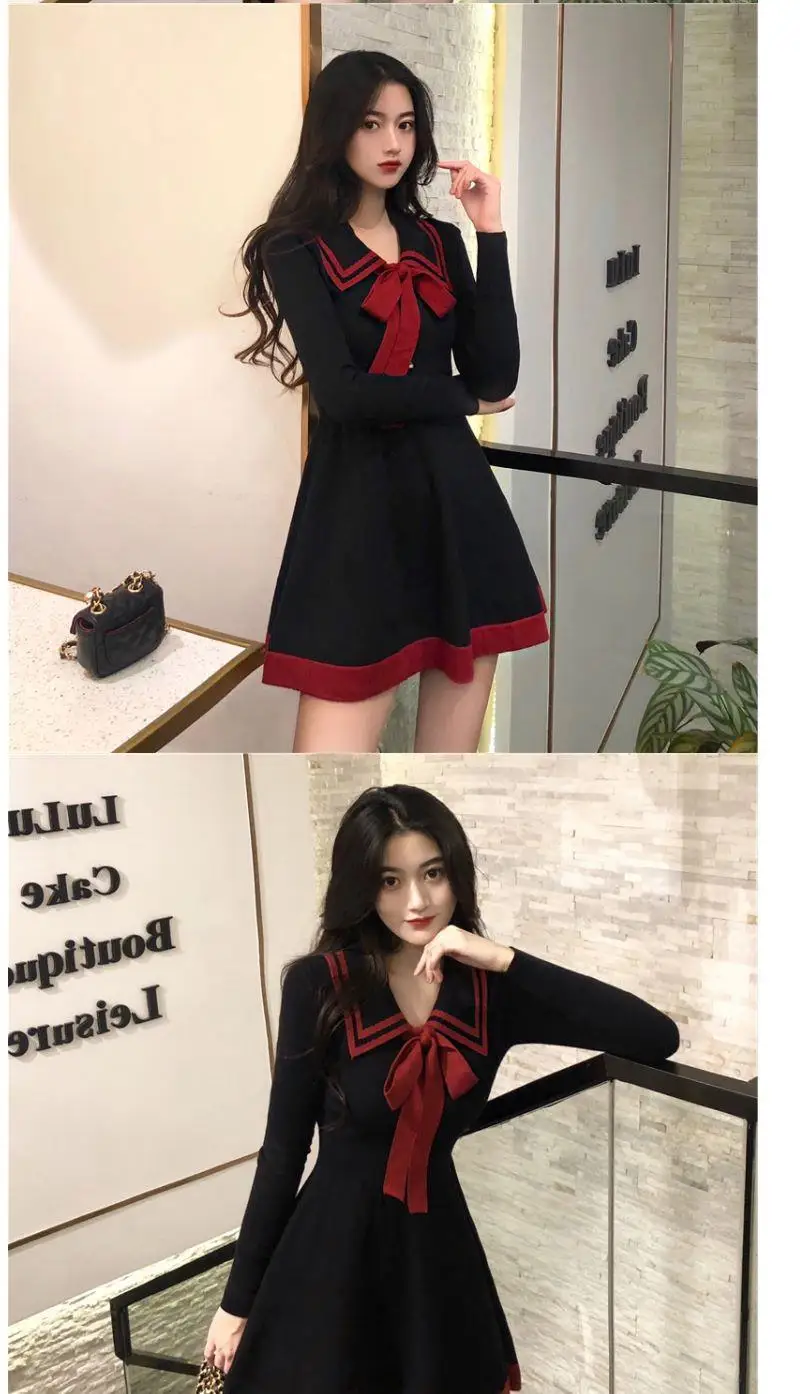 Japanese Style Knitted Dress Preppy Style Navy Kawaii Short Dresses Outfit Spring Long Sleeve Mini Dress Woman Clothes