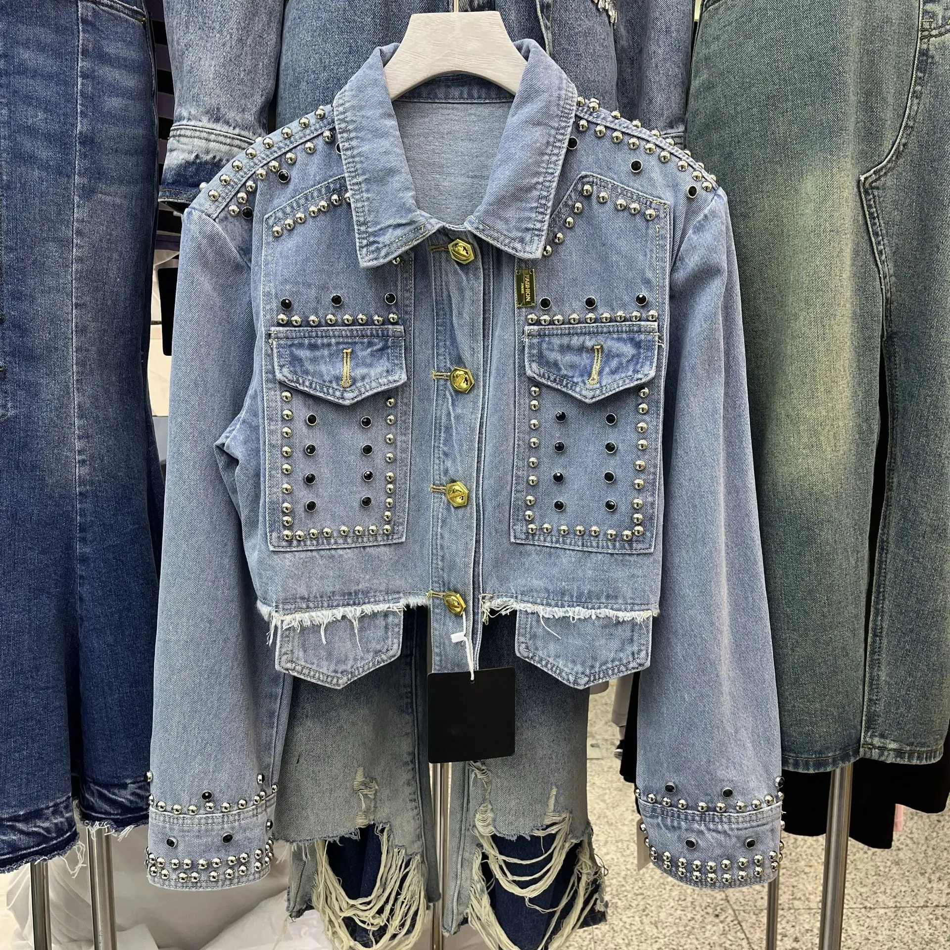 JL7311 Newest Style Lady Jean Jacket Long Sleeve Woman Denim Jacket with Rivets Golden Buttons Women Casual Jacket