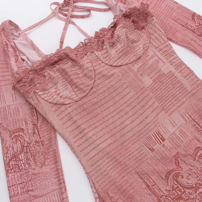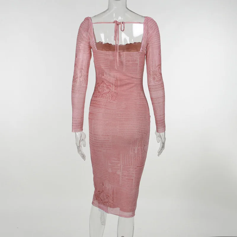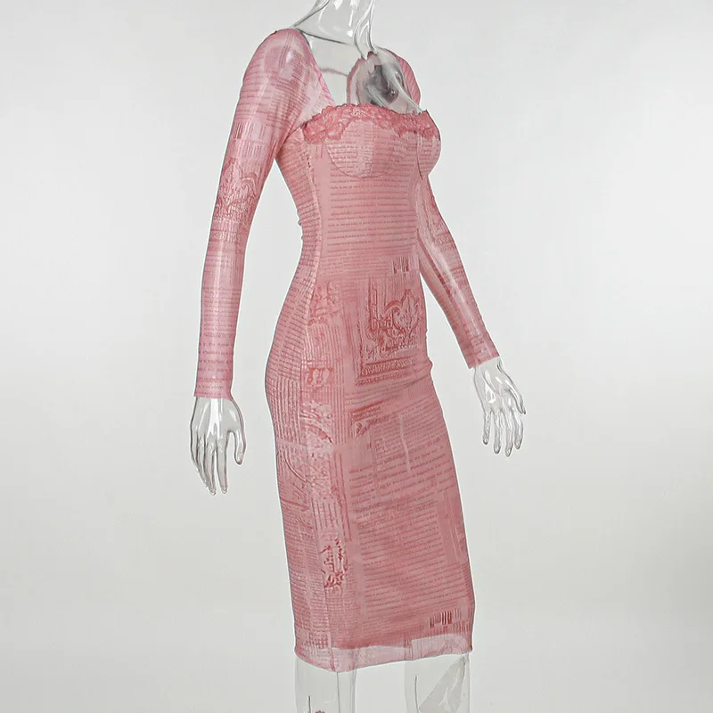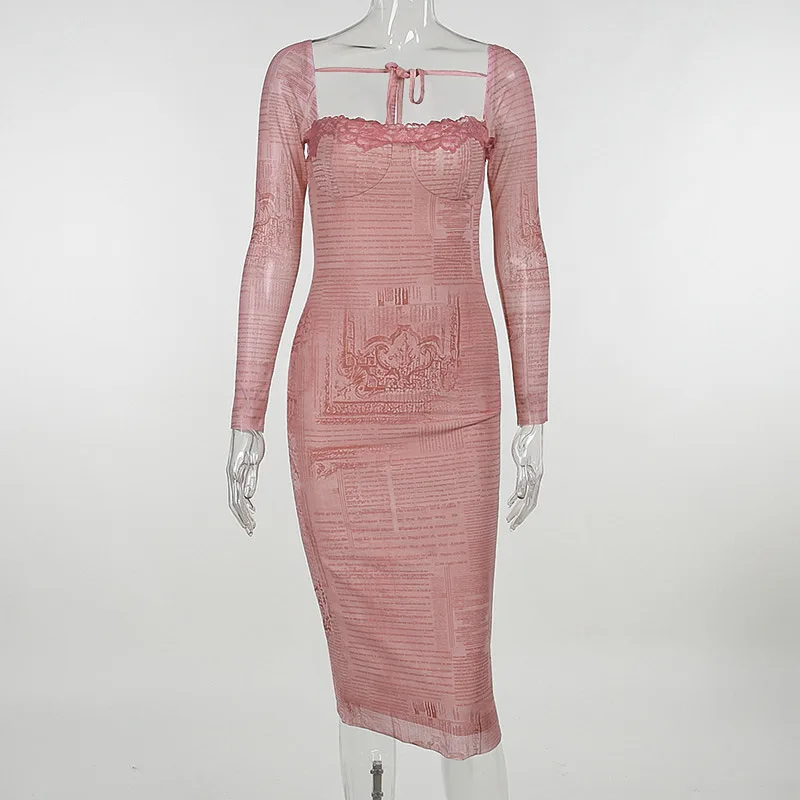 JY23603 New Manufacture Lace Long Sleeves Vacation Party Print Bodycon Square Neck Knit 2024 Dress