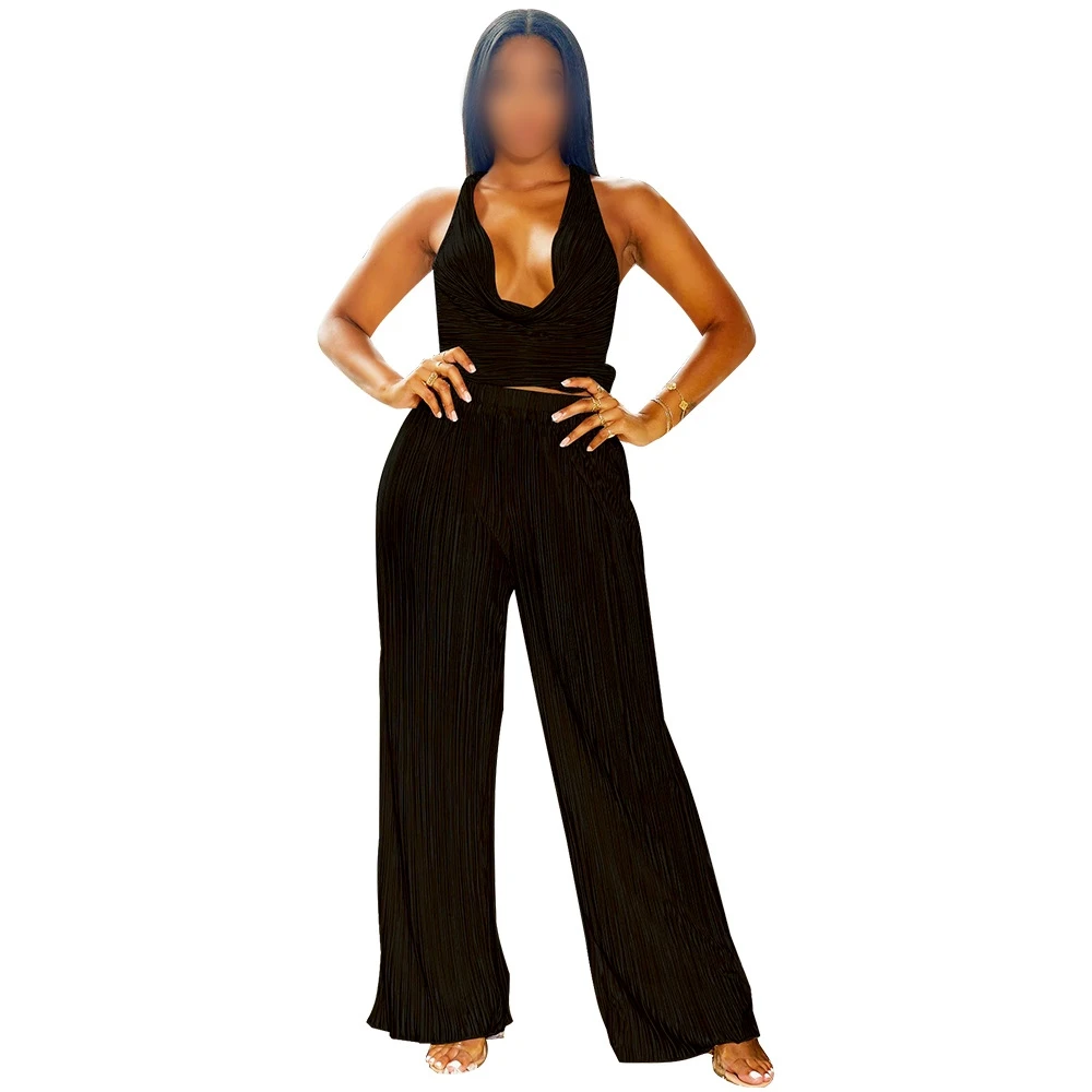 K10680 Two-piece Set Hanging Neck Solid Color Sleeveless Sexy Pleated Lace-up Crop Backless Top And Solid Color Loose Pants