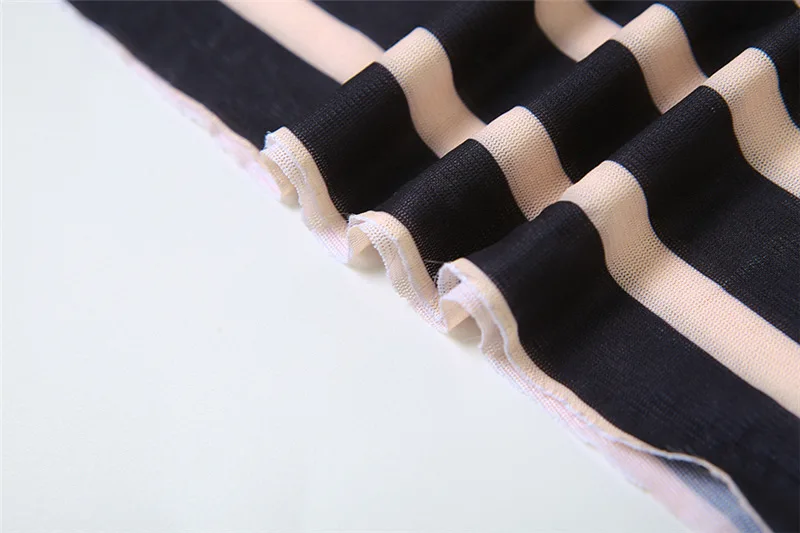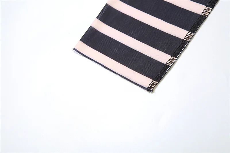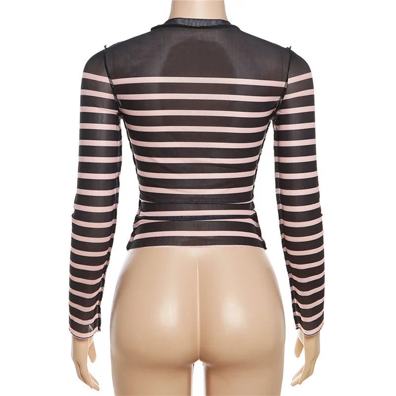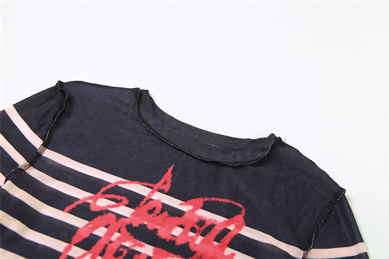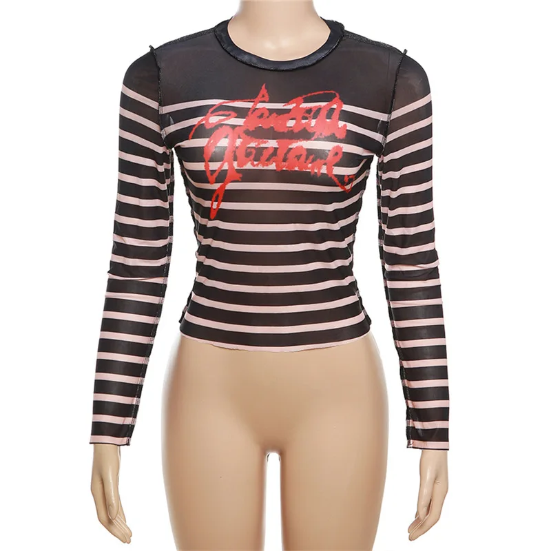 K23l36383 Streetwear Autumn Top Letter Print Stripe Long Sleeve Crop Top Skinny Mesh See Through Patchwork Shirt For Women