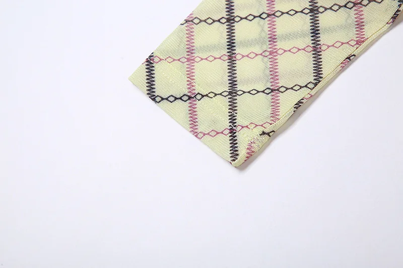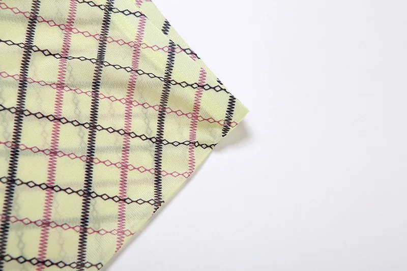 K23S31378 Sexy Summer Plaid Print Mesh Three Pieces Short Set With Long Sleeve Crop Top And Panties