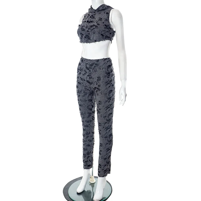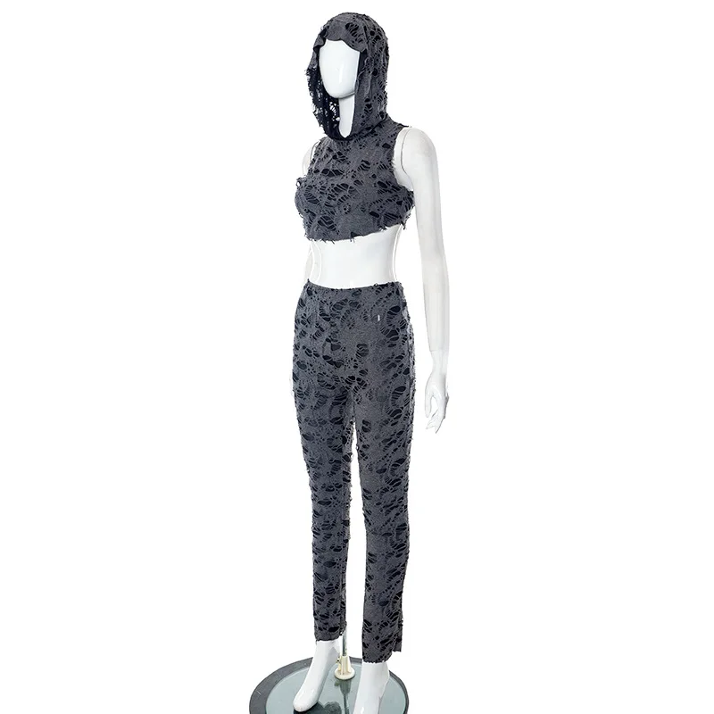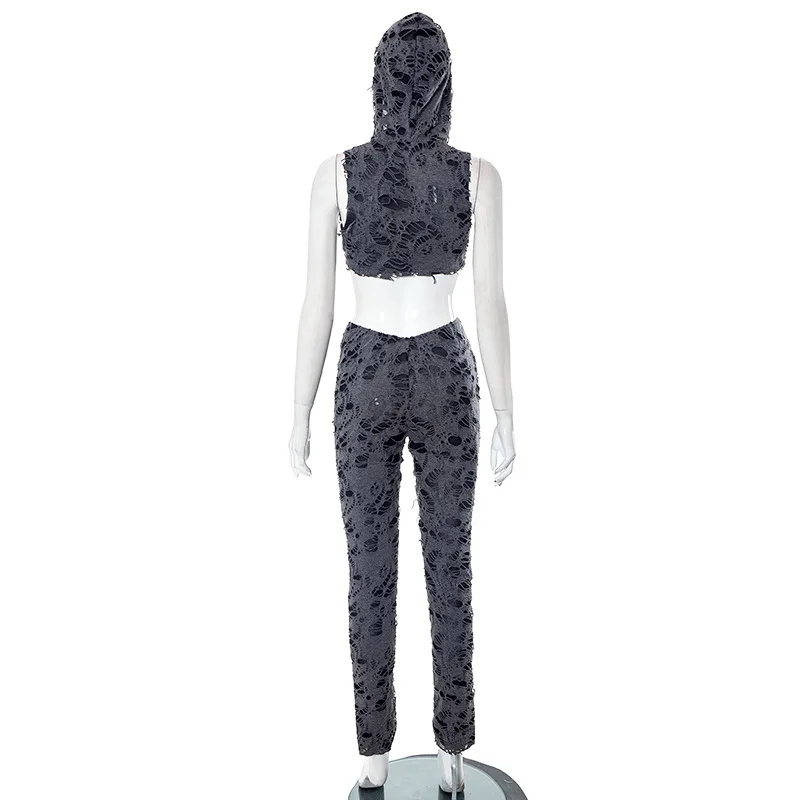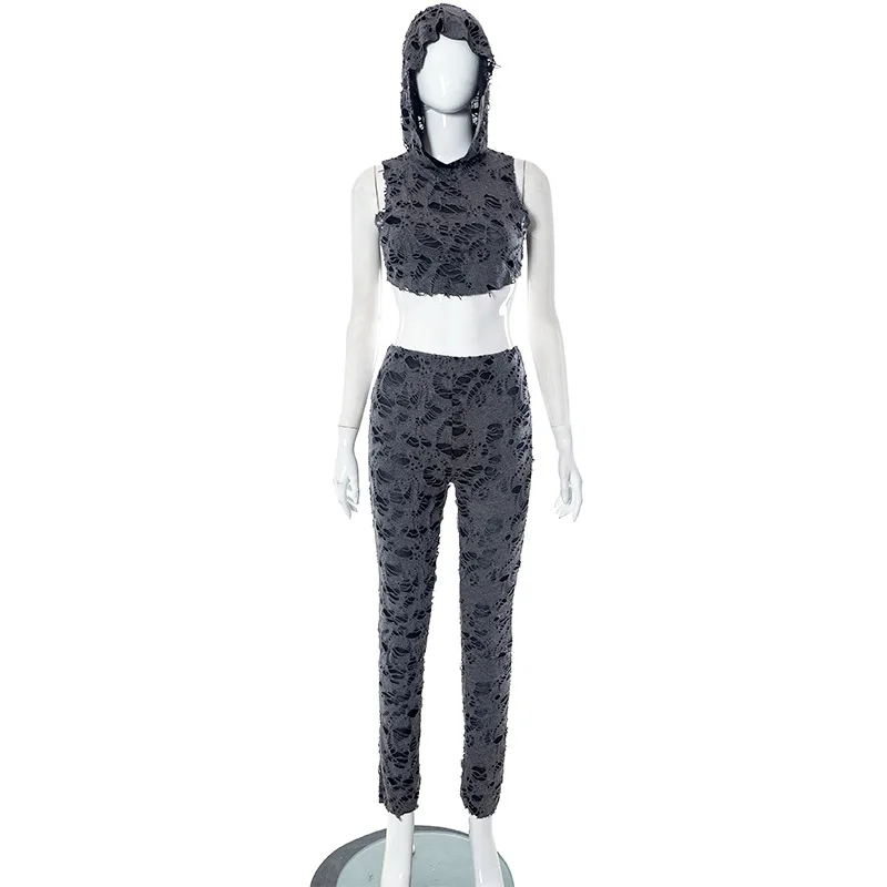 K23st158 Y2k Loungewear Women Suit Sleeveless Hoodie Crop Tops And Leggings Hollow Out Casual 2 Piece Set Women Sexy