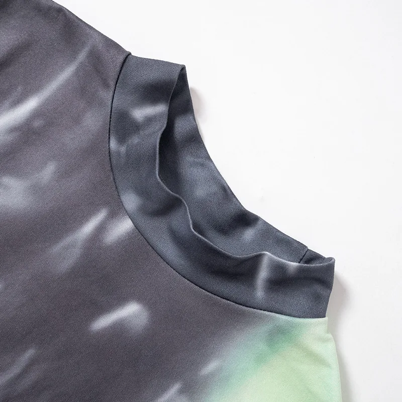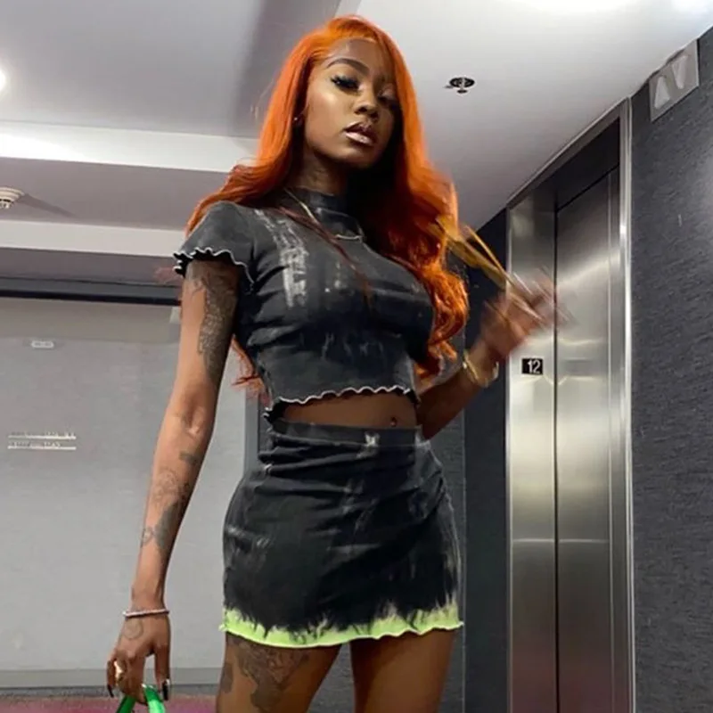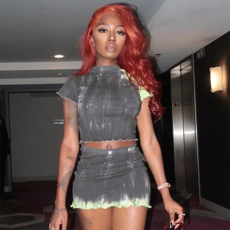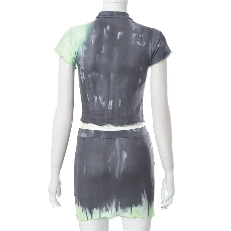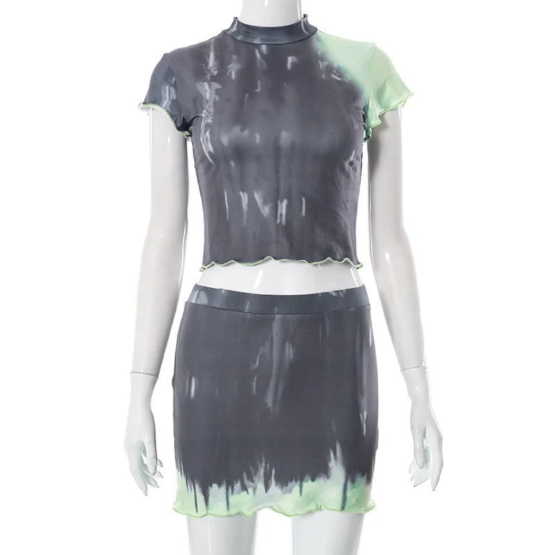 K23ST270 Summer Sexy Round Neck Tie Dyed Print Short Sleeve Crop Top Shirt Matching Slim Fit Mini Skirt Two Piece Set