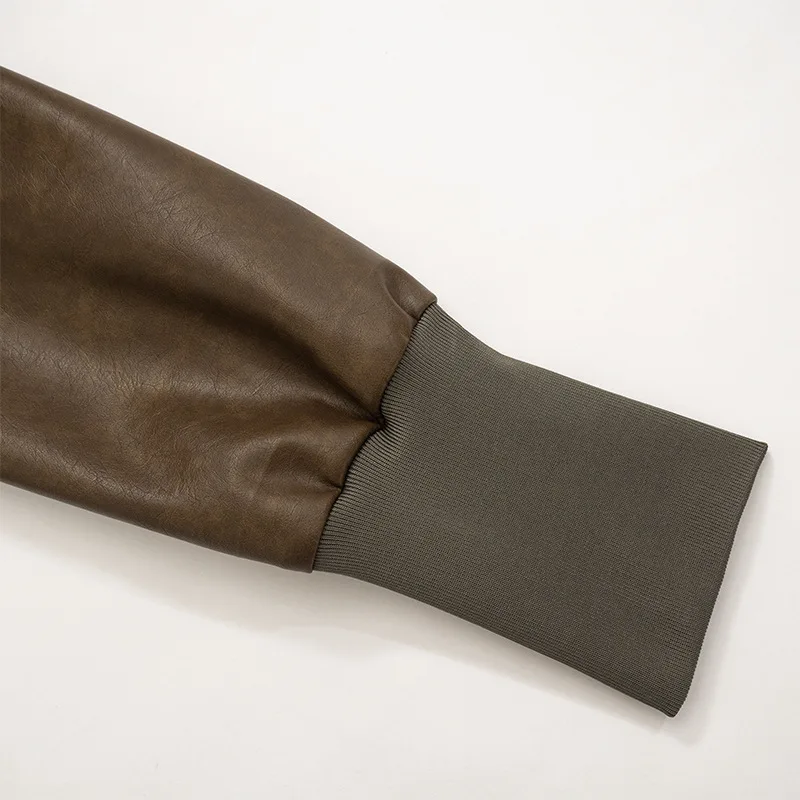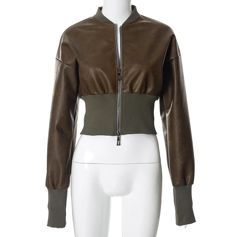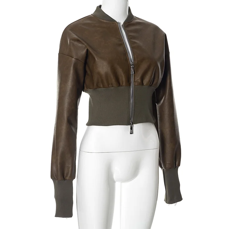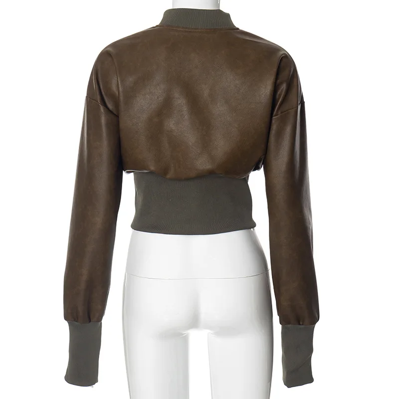 K23tp533 Fashion 2024 New Autumn Winter Pu Leather Patchwork Long Sleeve Crop Coat Bodycon Casual Coat For Women Lady
