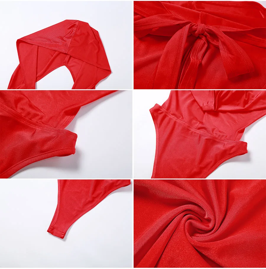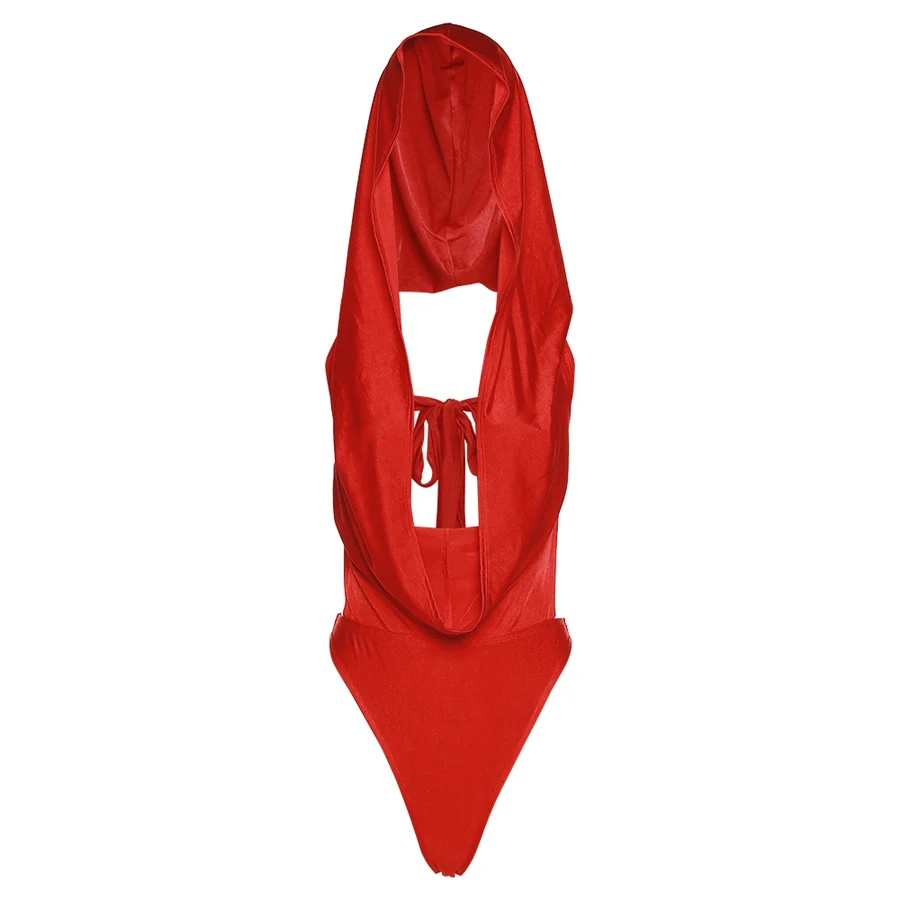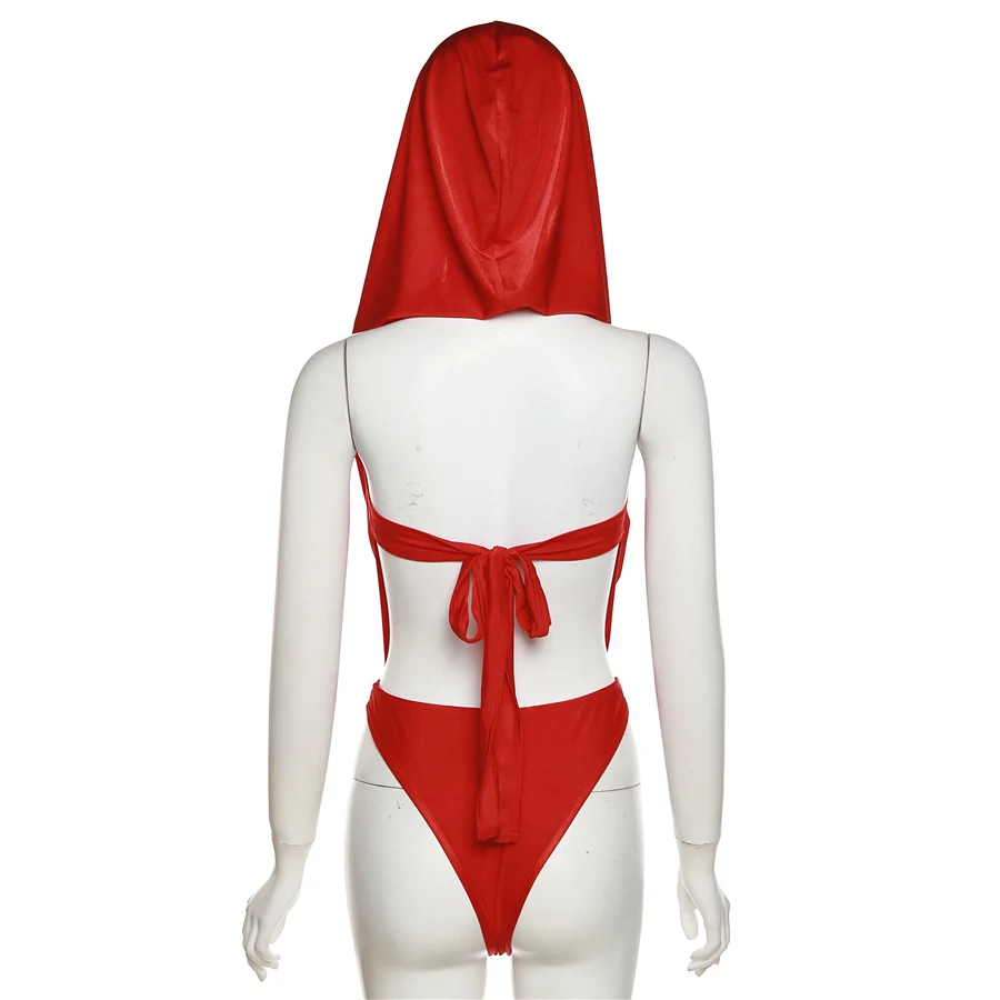 Kliou K22K24062 Sexy Deep V Neck Bodysuit Women Fashion Hooded Red Sleeveless Backless Skinny Bodysuits Ladies Party Wear