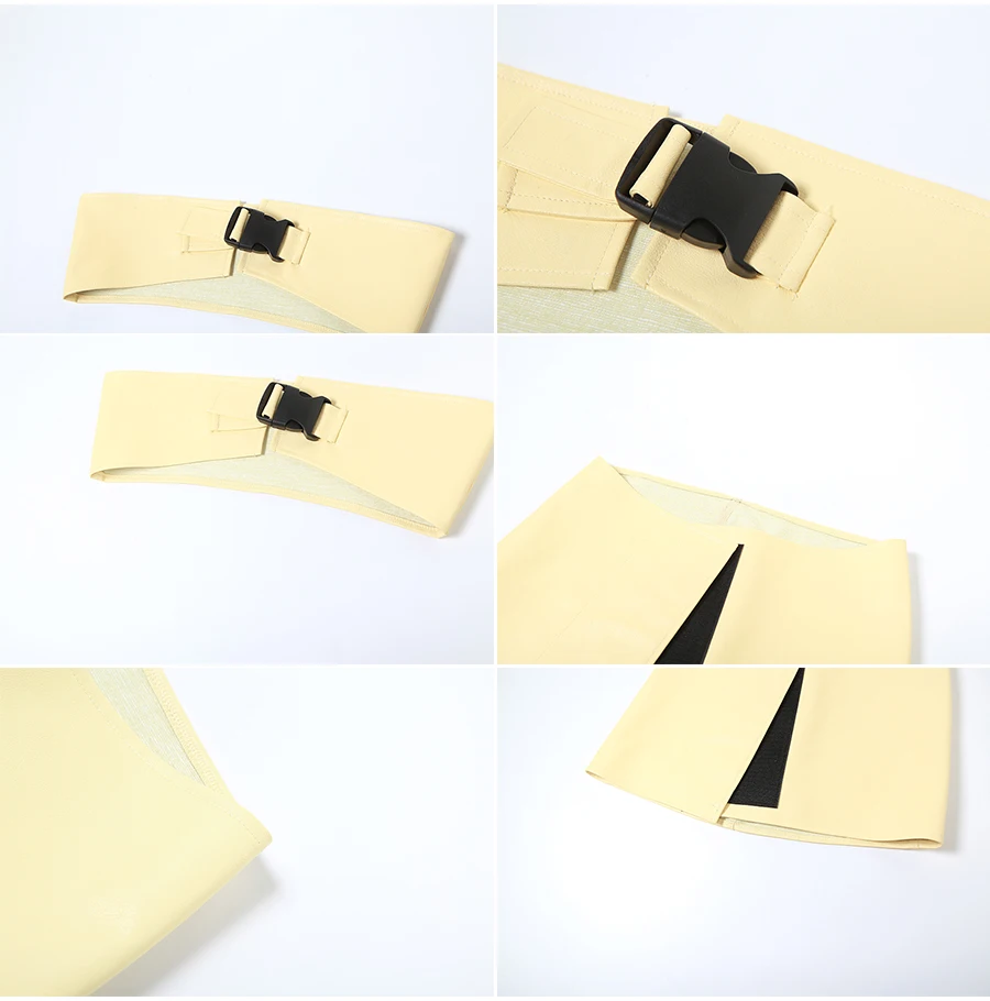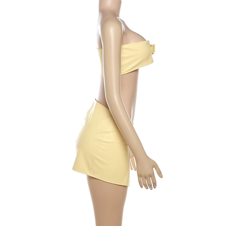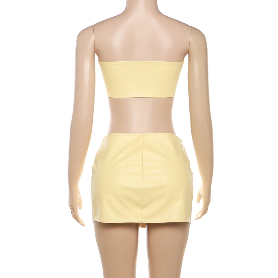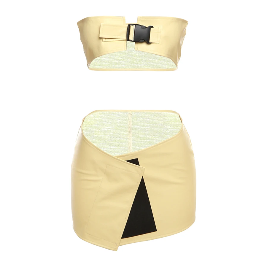 Kliou K23S40315 Buckle Wrapped Chest Sleeveless Crop Tops+High Waist Skirt 2 Piece Set Ladies Solid Leather Women's Set