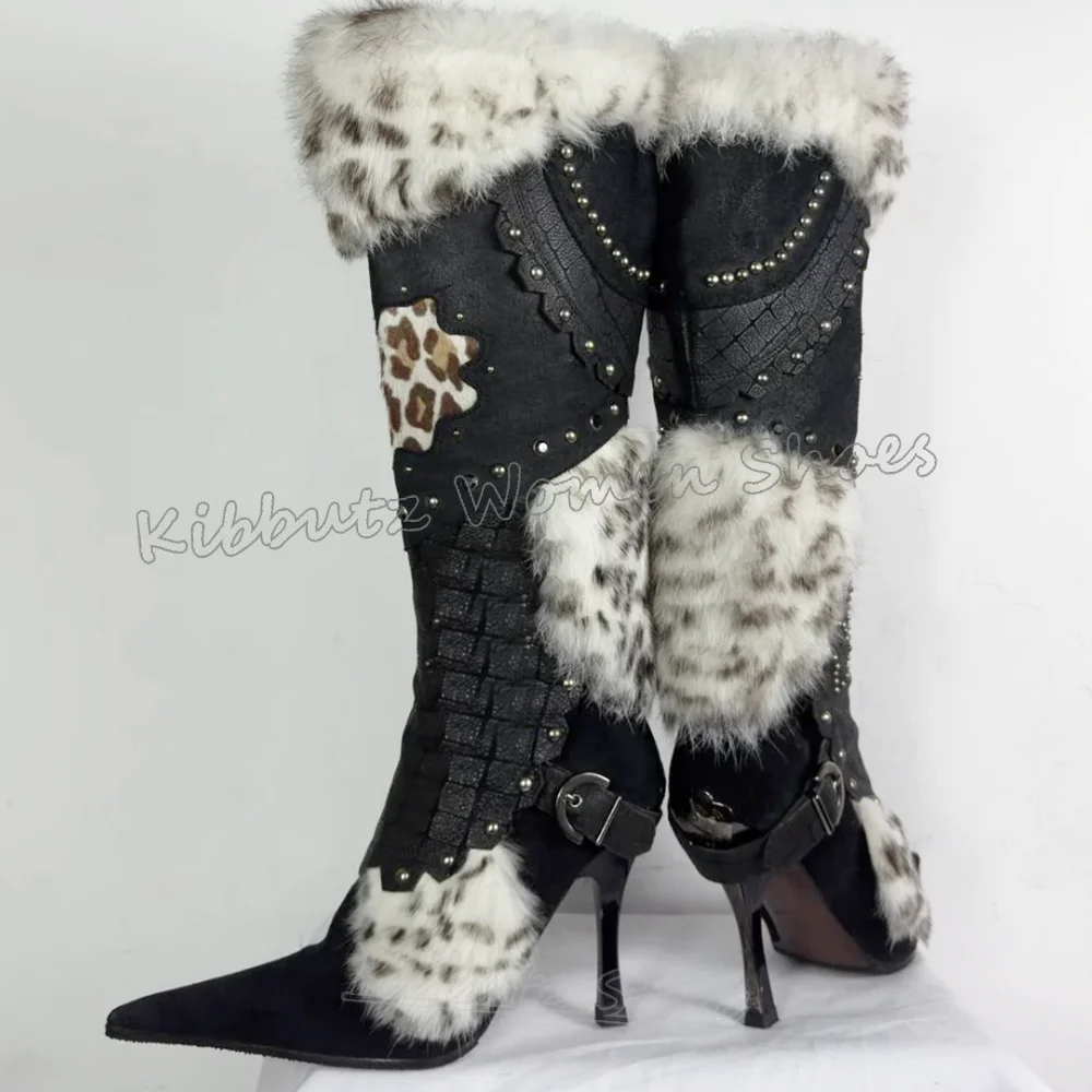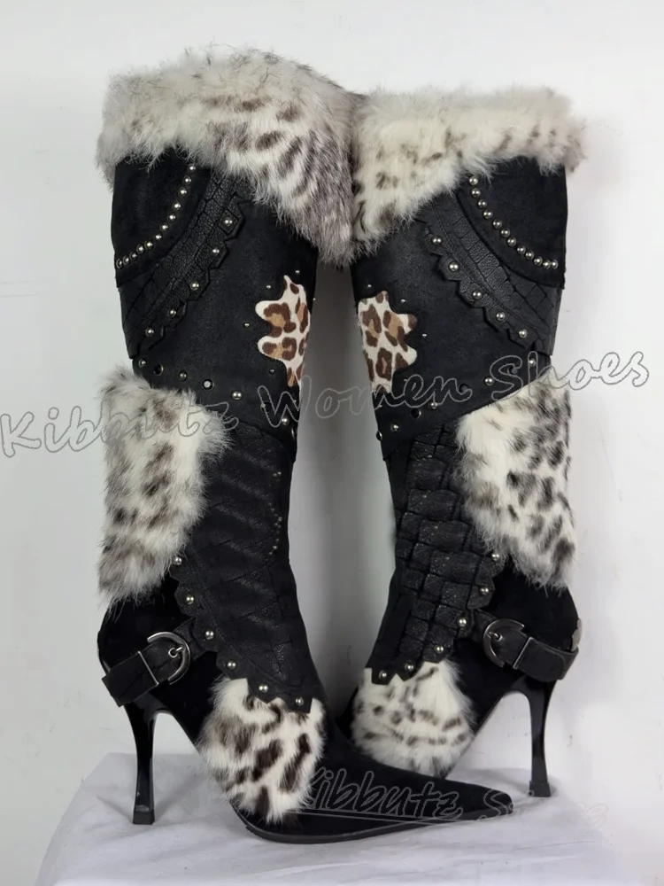 Knee High Boot Furry Patchwork Leather Belt Buckle Winter Warm Fashion Novelty Sexy Elegant Concise Pointy Thin Heels Shoes New