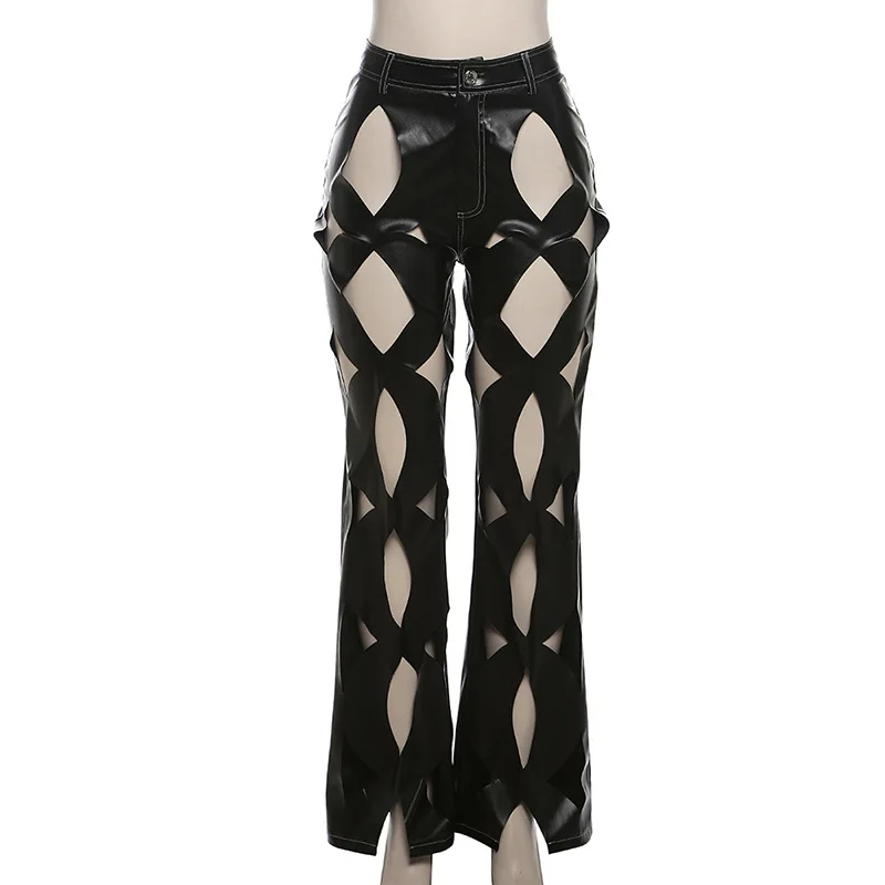 Knit PU Hollow Out Pants 2024 New Fashion Womens Pu Leather High Waist Straight Pant Solid Loose Casual Streetwear Trousers