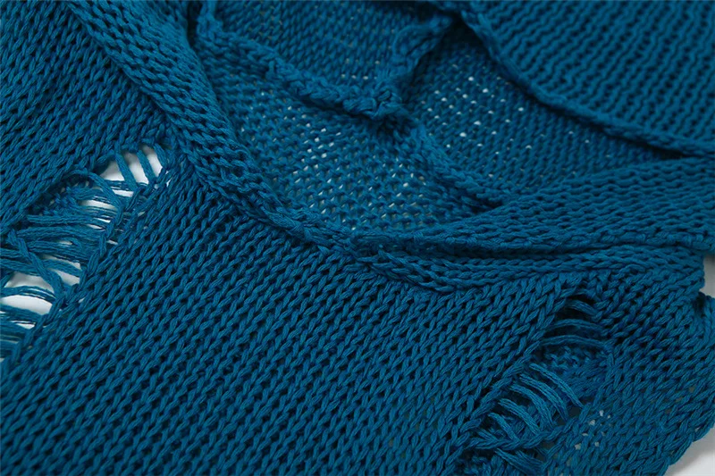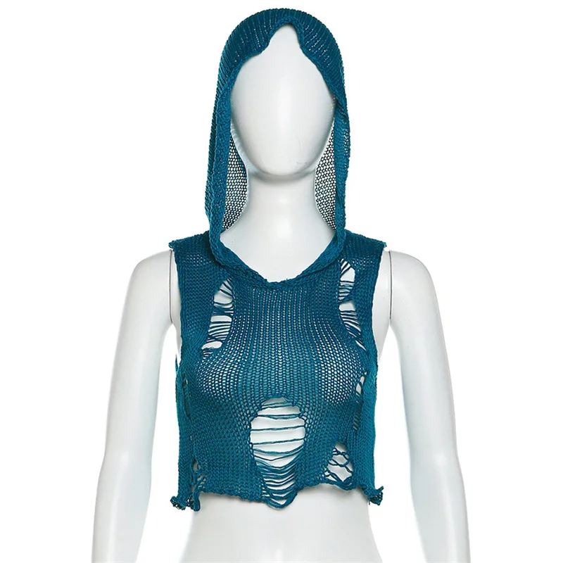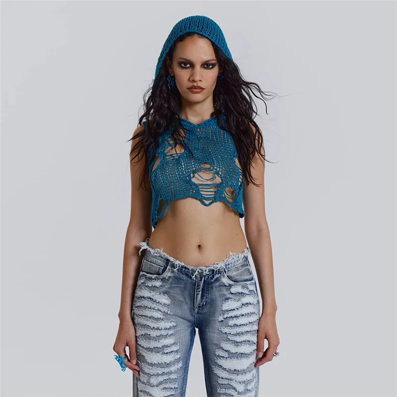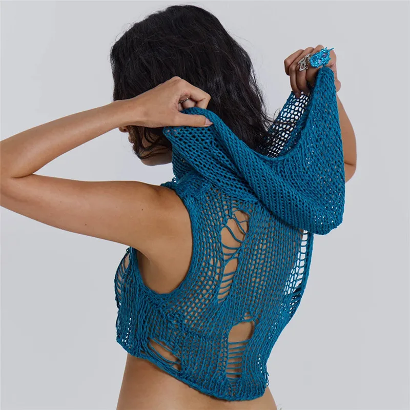 Knit Ribbed Hollow Out Hole Beach Vacation See Through High Waist Crop Top T Shirt Streetwear Casual Summer Clothes