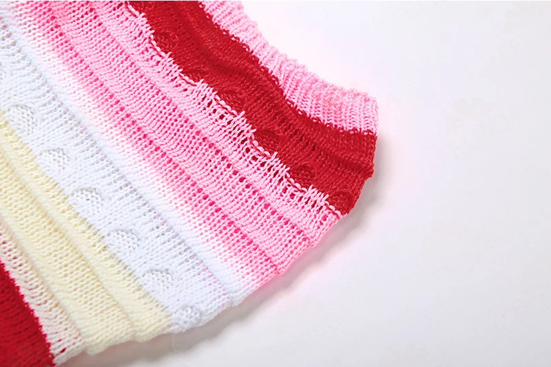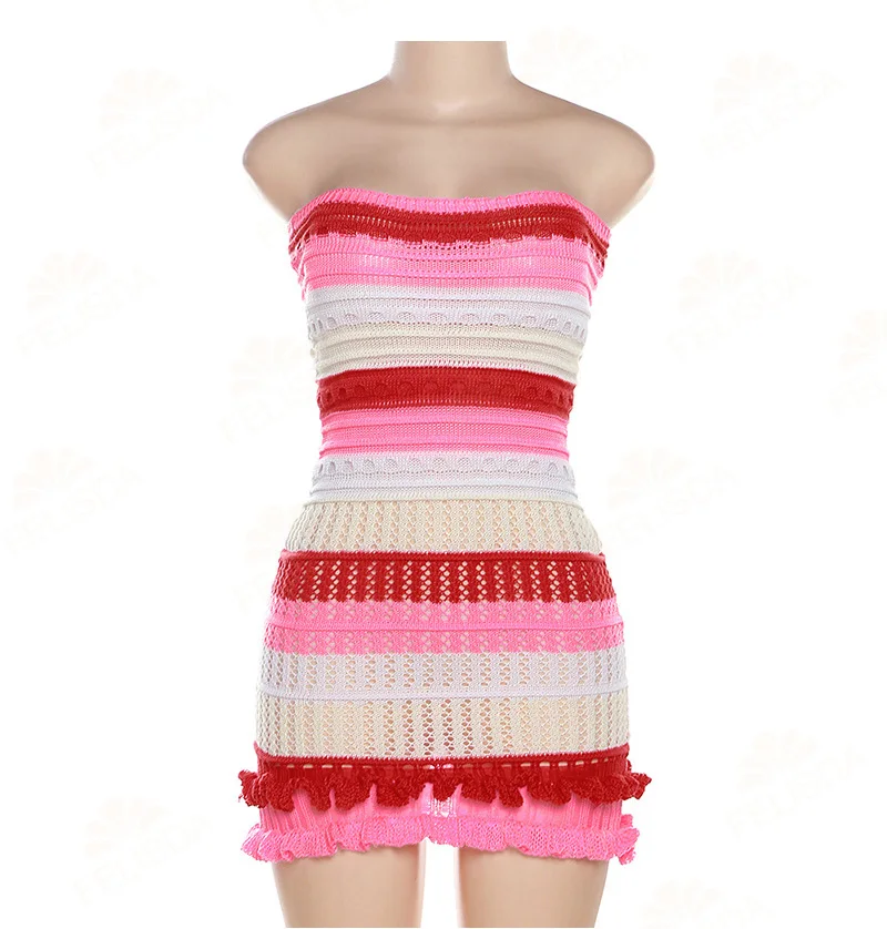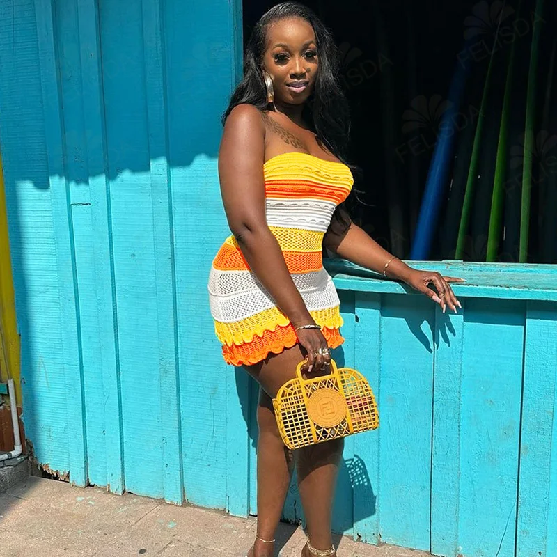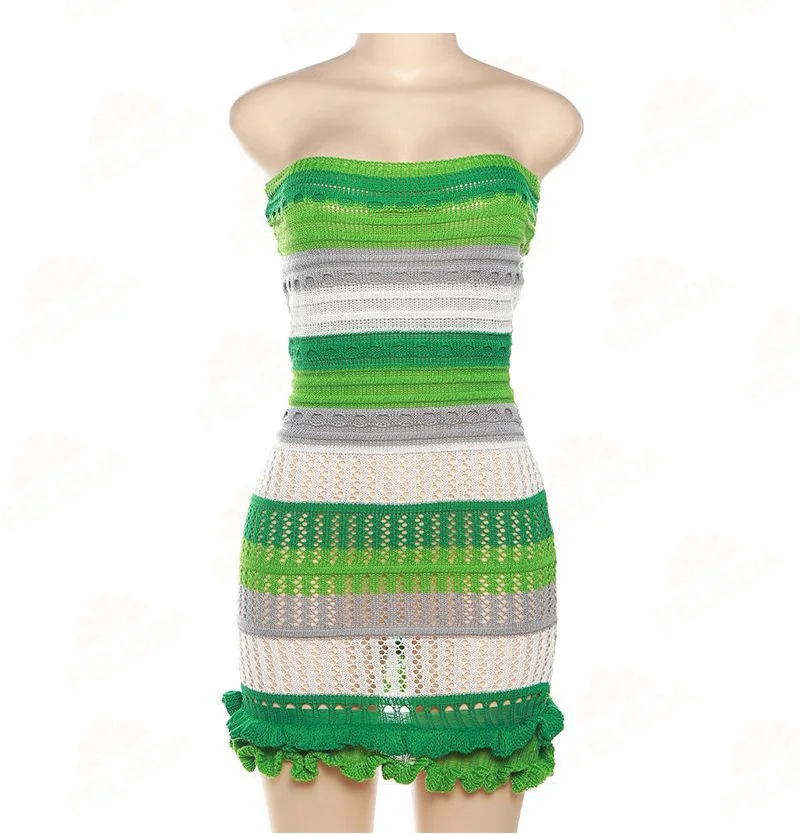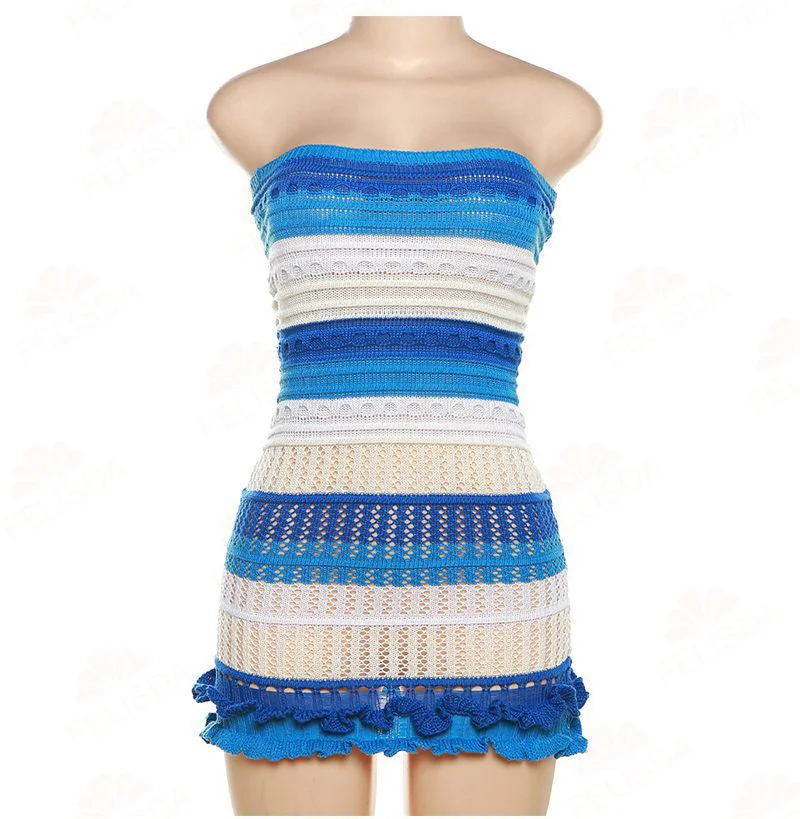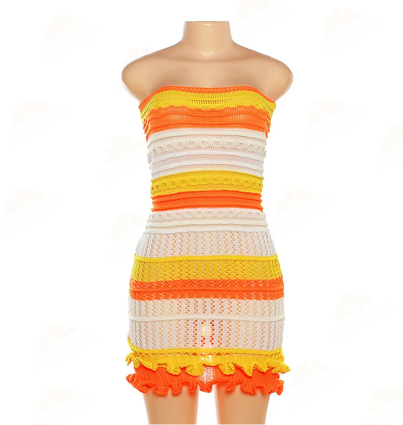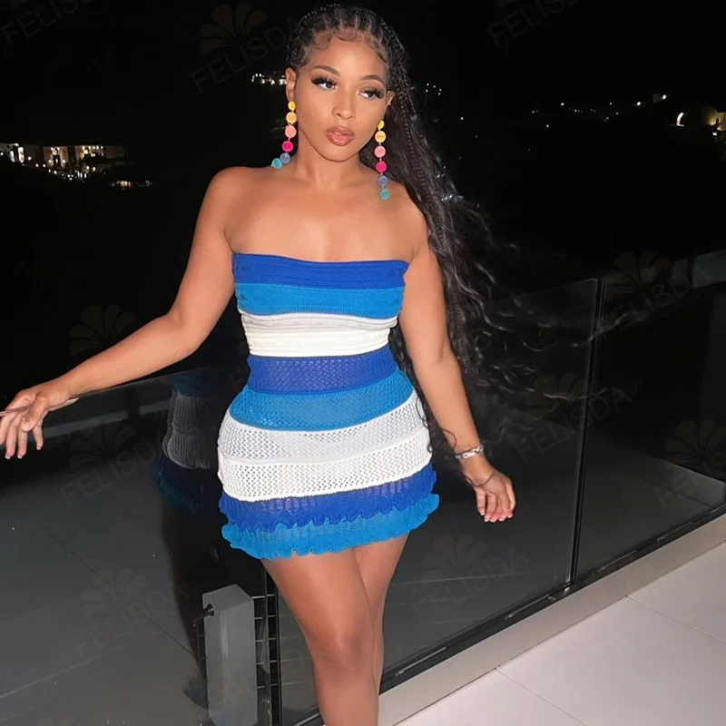 Knit Women Tube Dress Elegant Summer Patchwork Striped Ruffles Hem Skinny Stretch Bodycon Clubwear Sexy Night Club Short Dress
