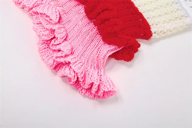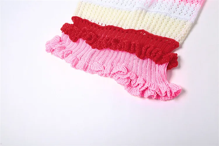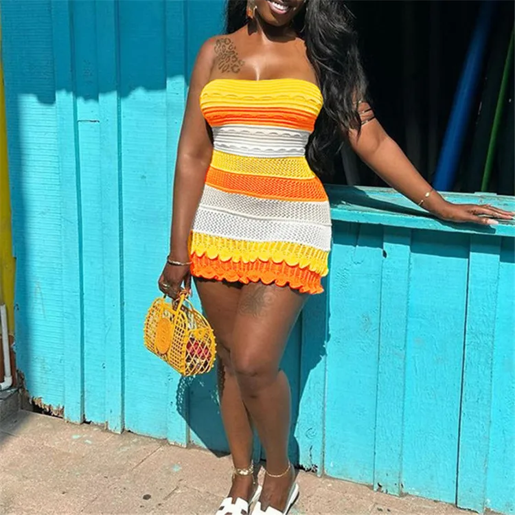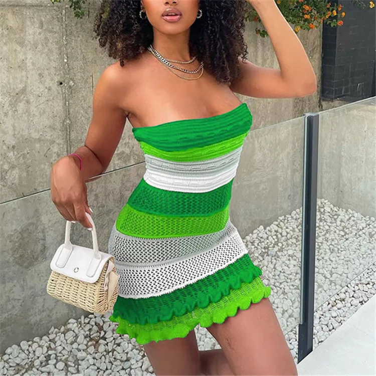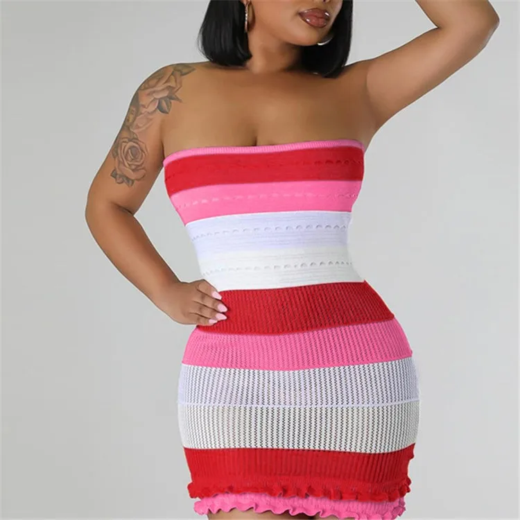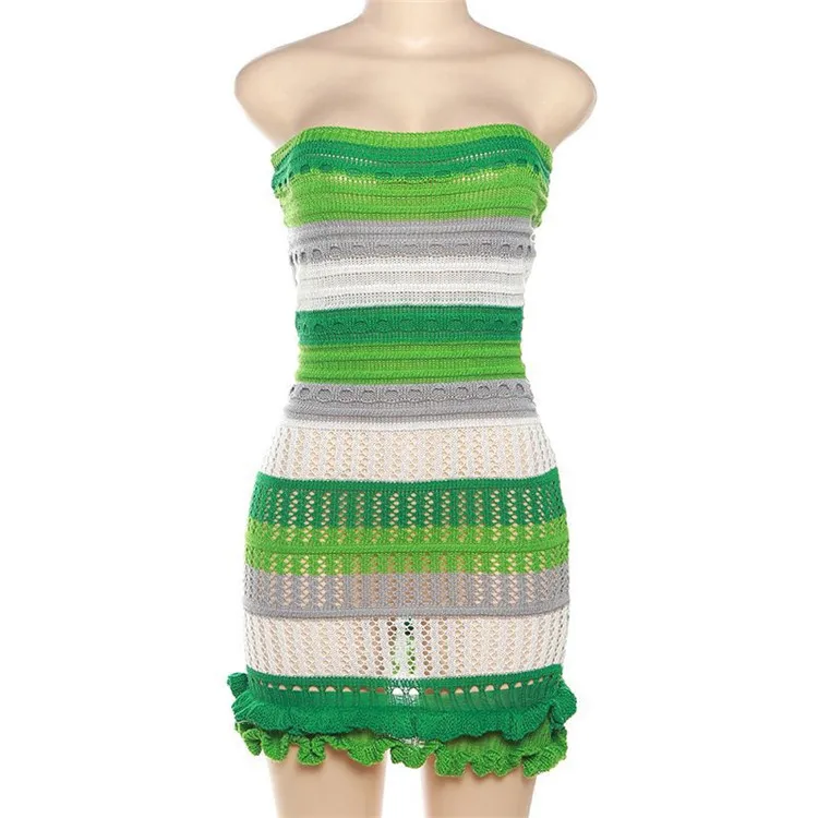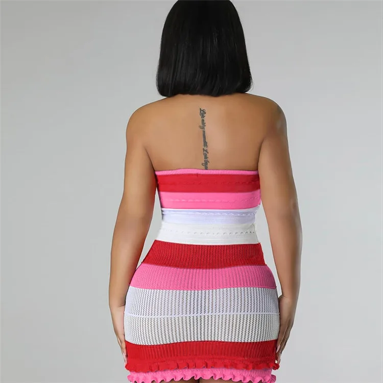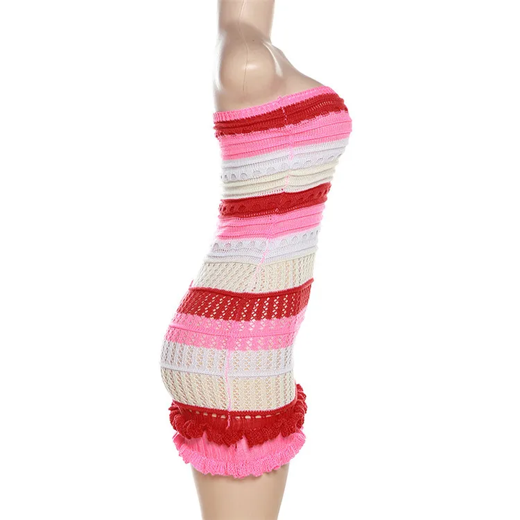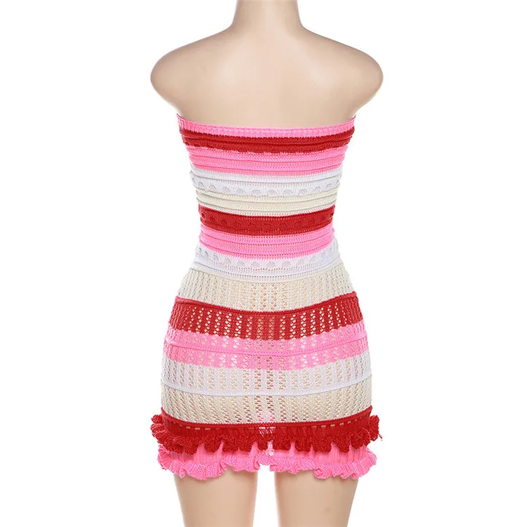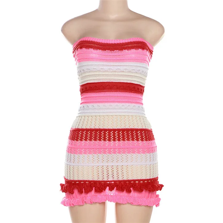 Knitted Strapless Bodycon Y2K Dresses Striped Print Backless Hem Lace Dress For Women