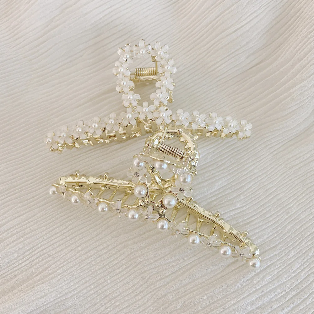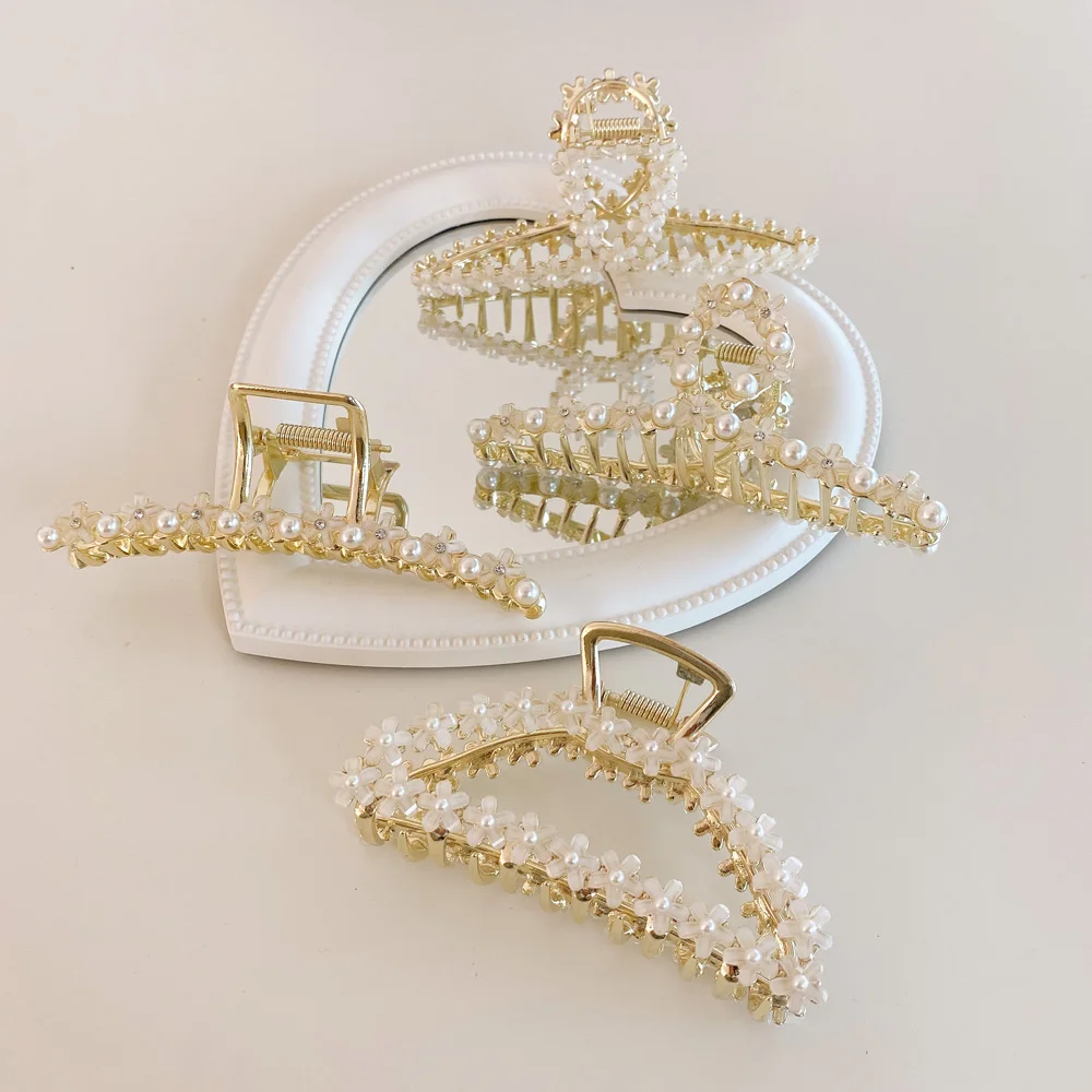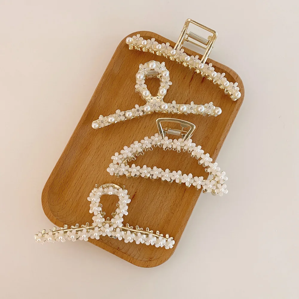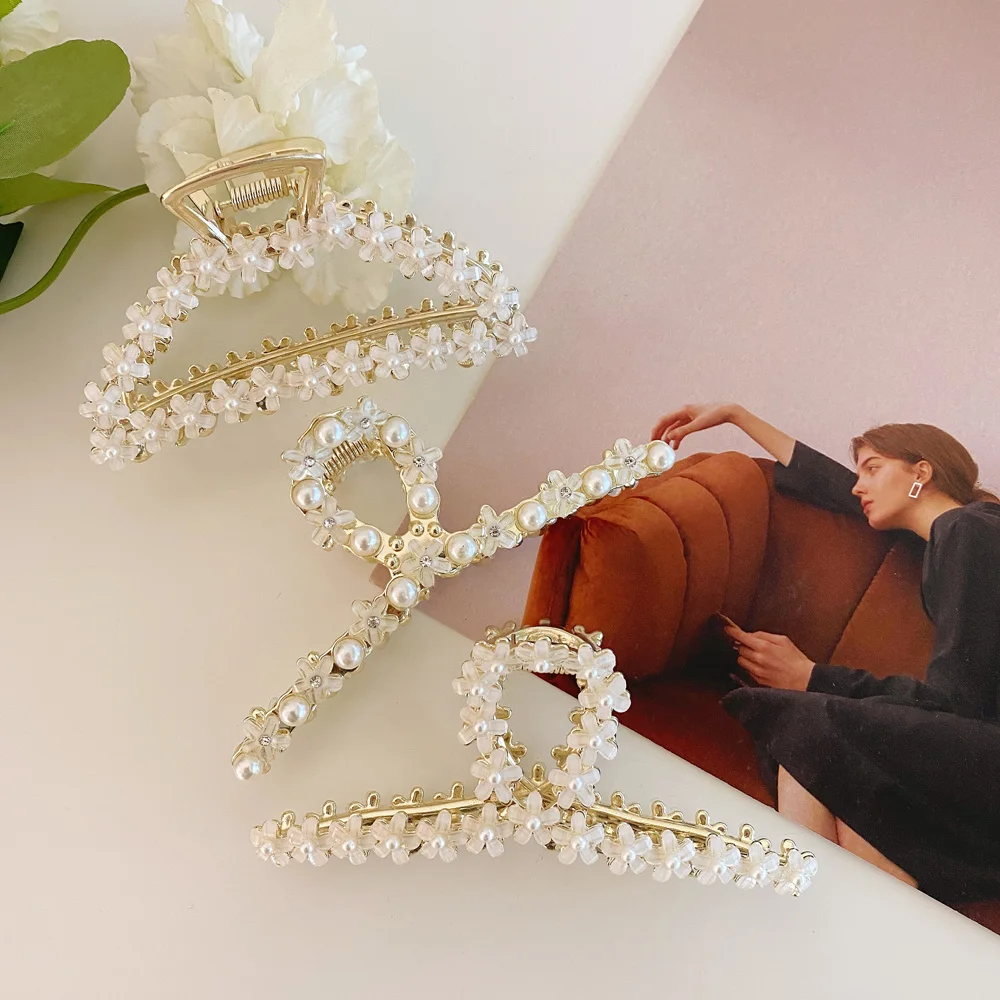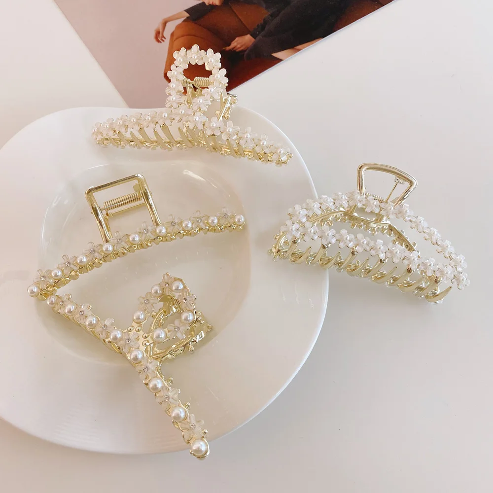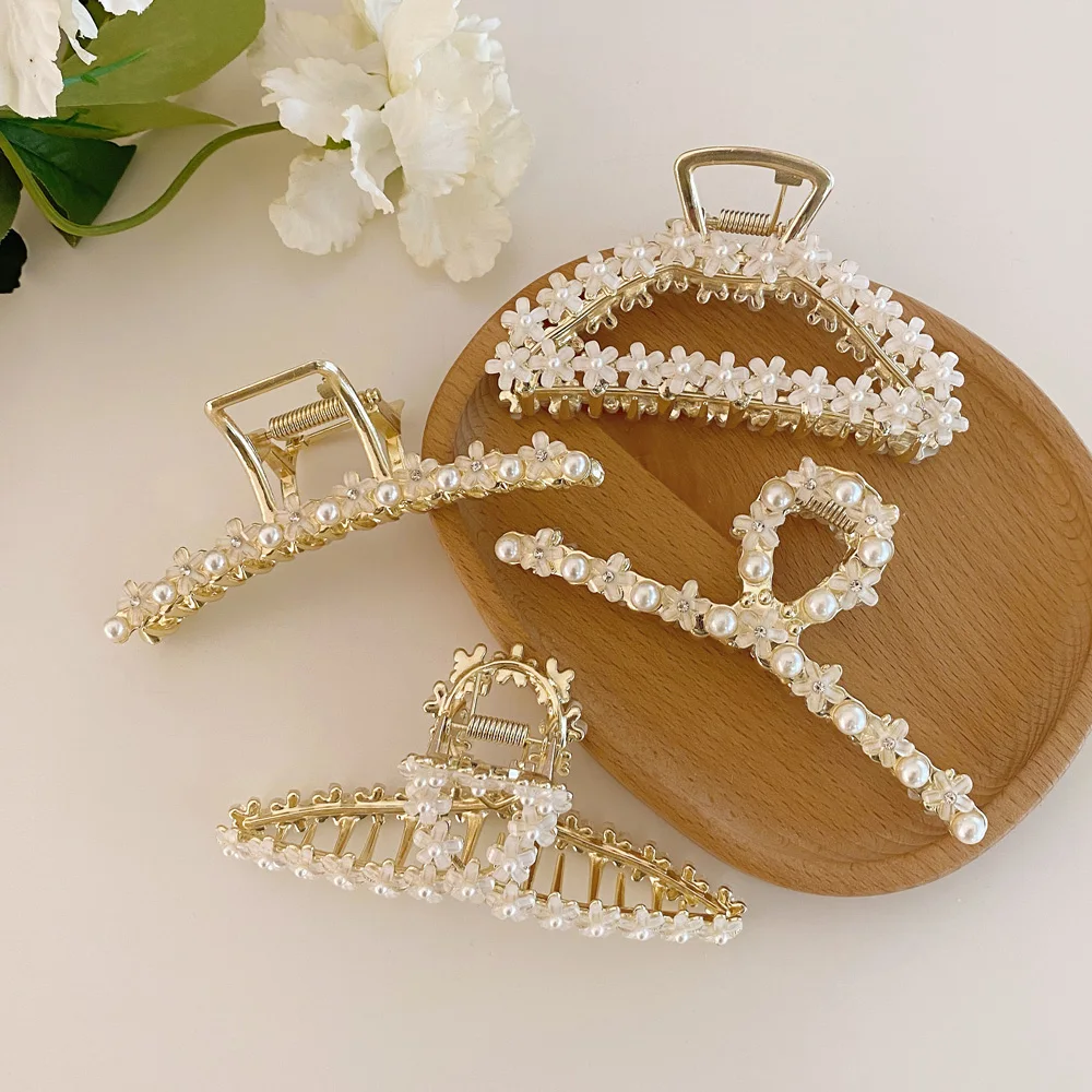 Korean Ins Fashion Elegant Pearl Rhinestone Hair Clips Luxury White Flower Pearl Metal Hair Claw Clips For Woman Girls