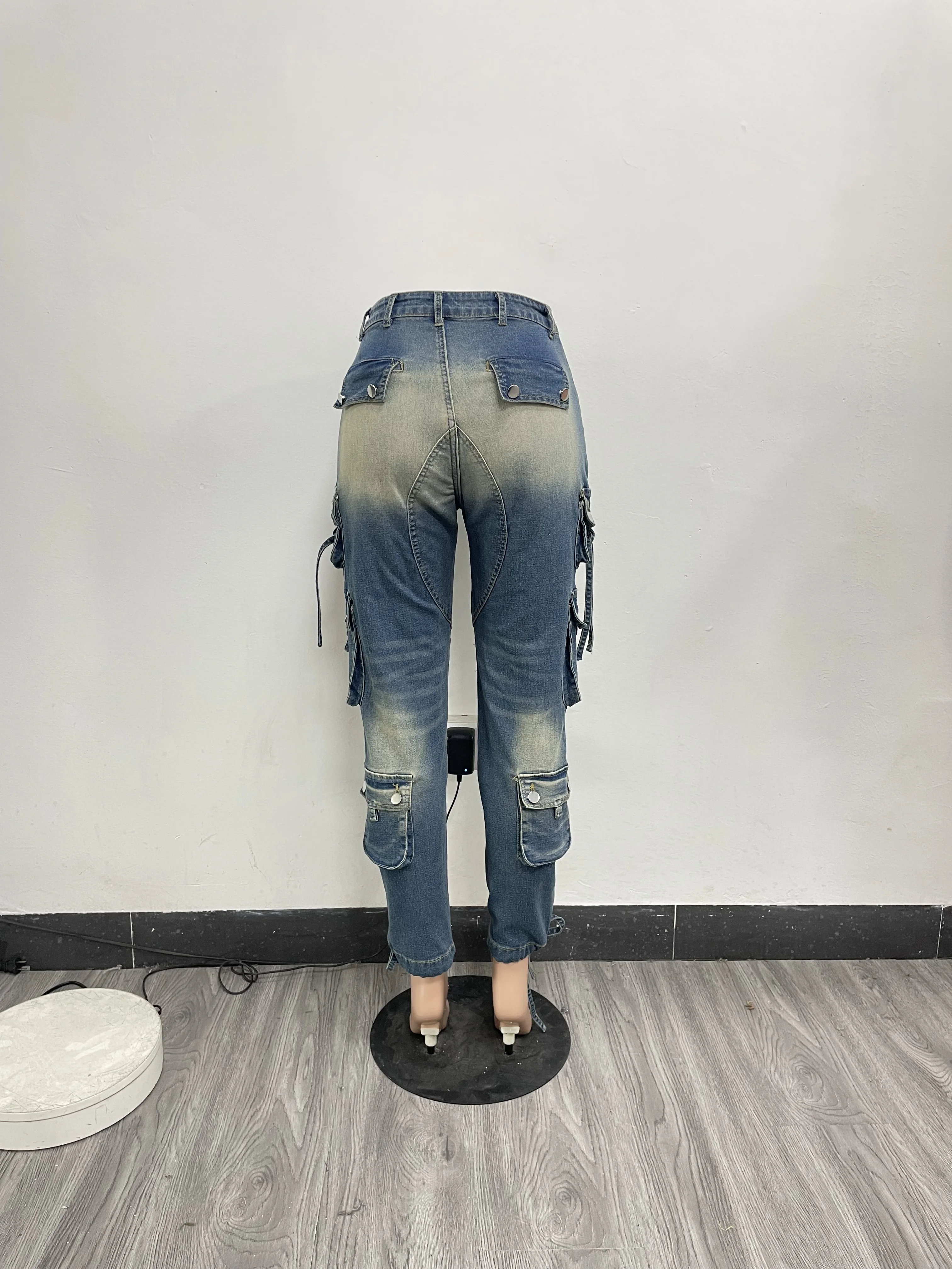 L059 Retro Low-Rise Zipper Cargo Stretch Jeans Washed Distressed Casual Style Denim Cotton Polyester Skinny Fit Colored Waist