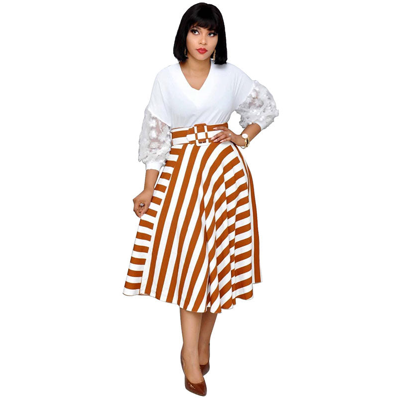 L36527 Elegant Design V Neck Petal Sleeve Stripe Stitching Plus Size Dress with Belt