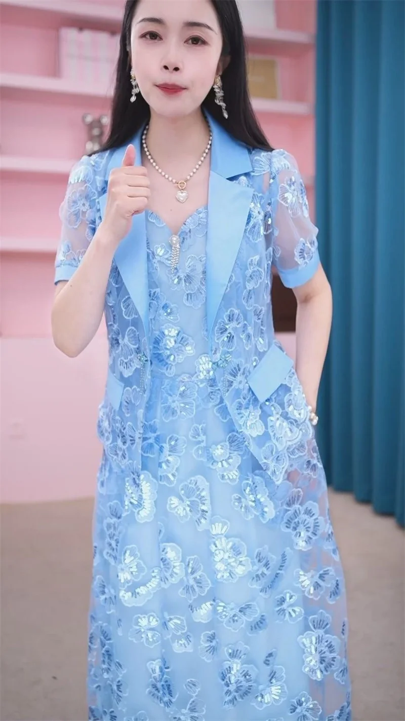 Lace Dress Women's High end Luxury Lady Two Piece Sets Silk Dress Suit Jacket And Dress 2023 Summer Waist Slim Long A-line Dress