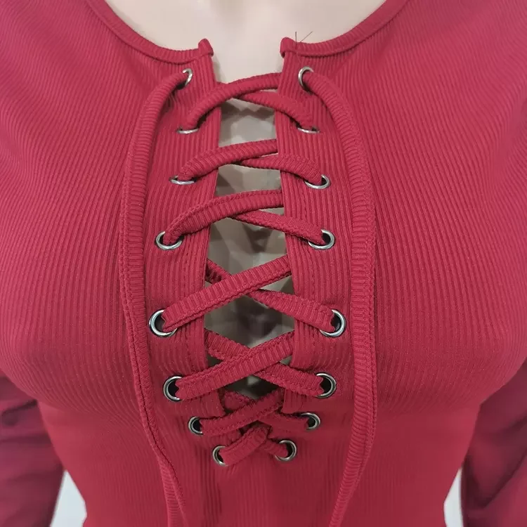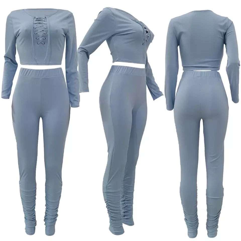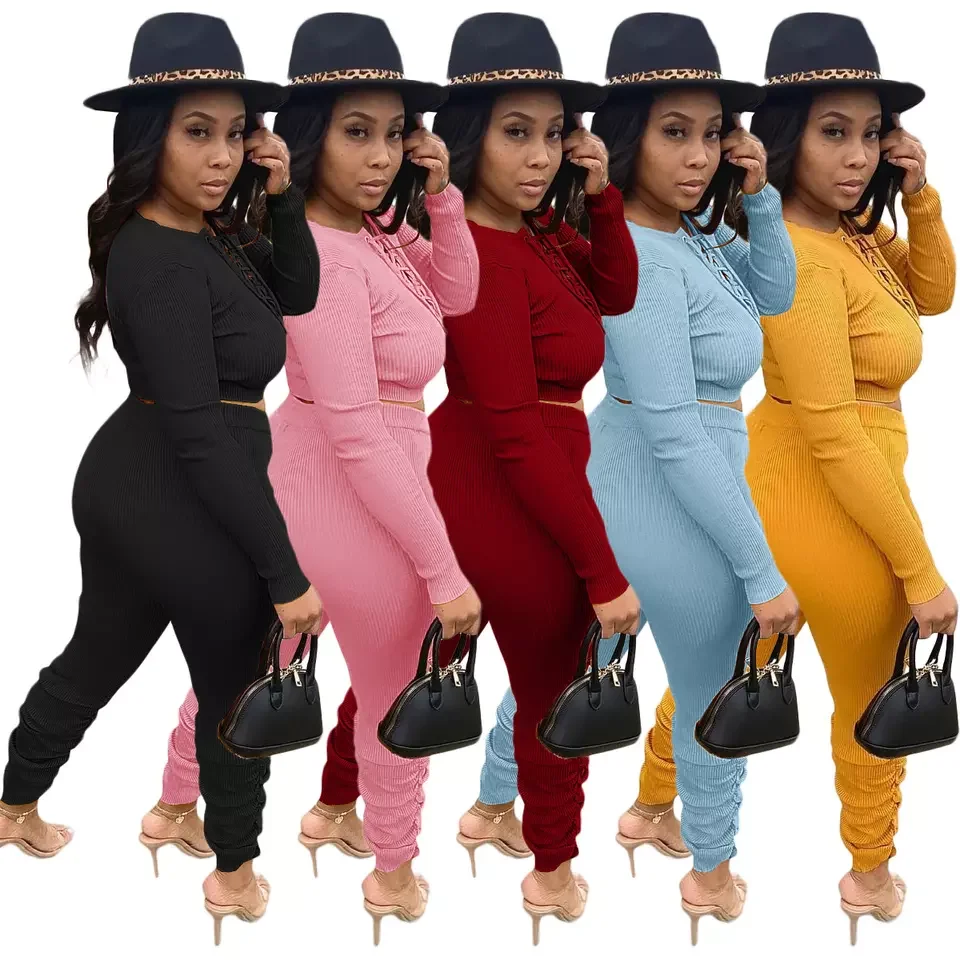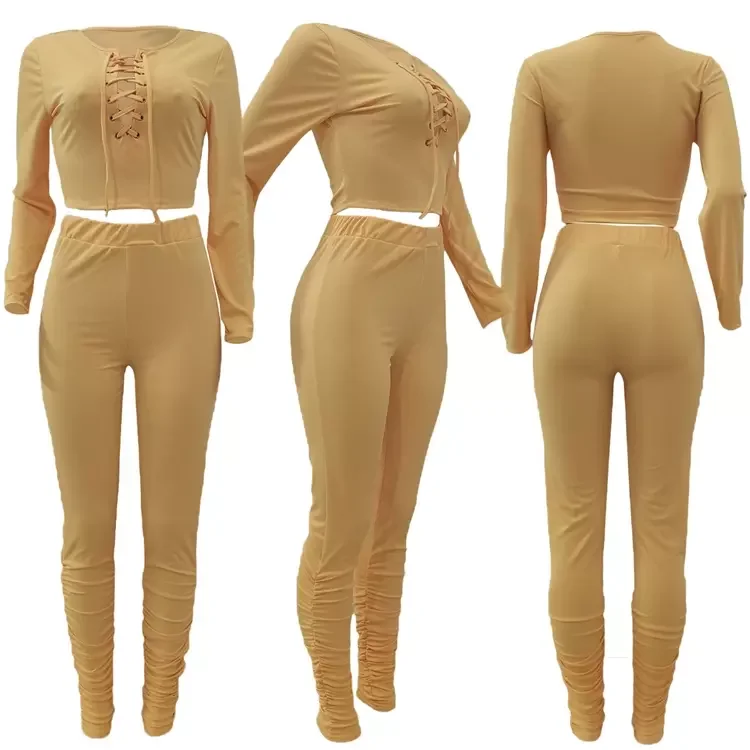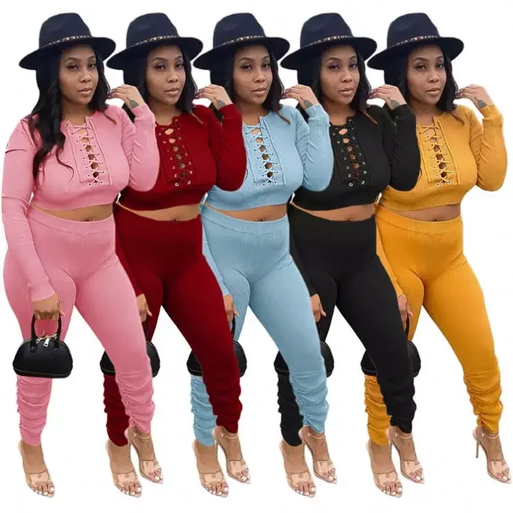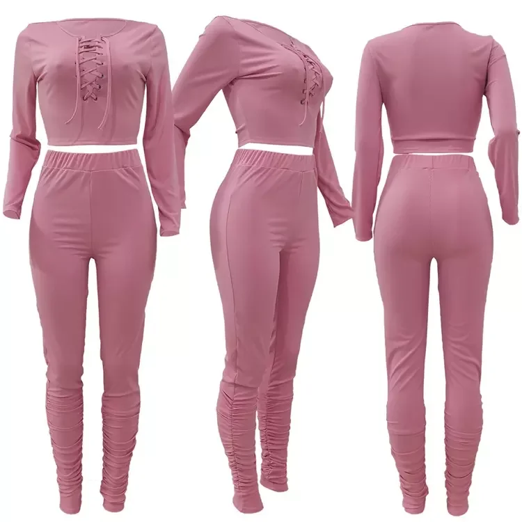 lace up crop top and pant two piece fall women jogging suits custom women's jogger sets wholesale 2022