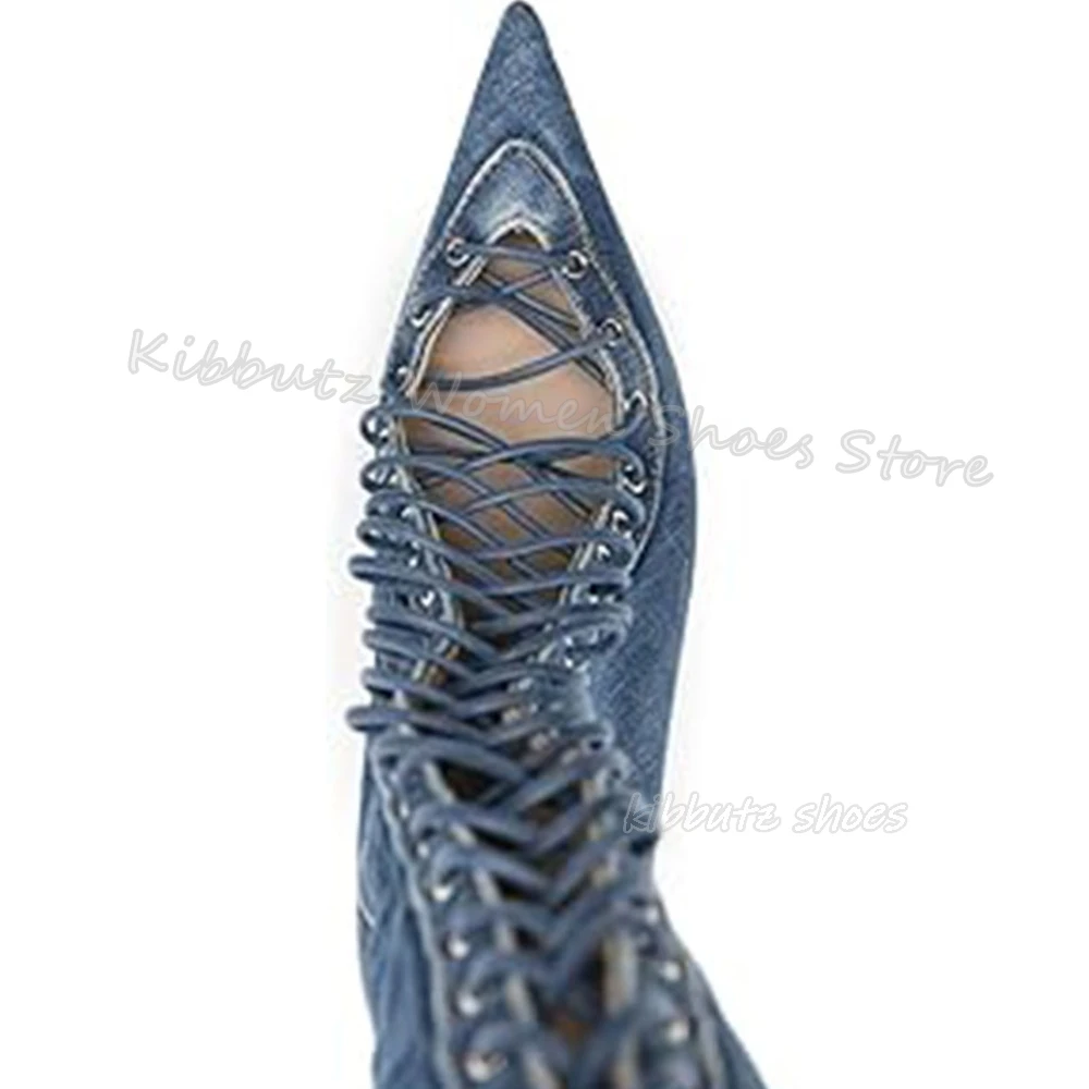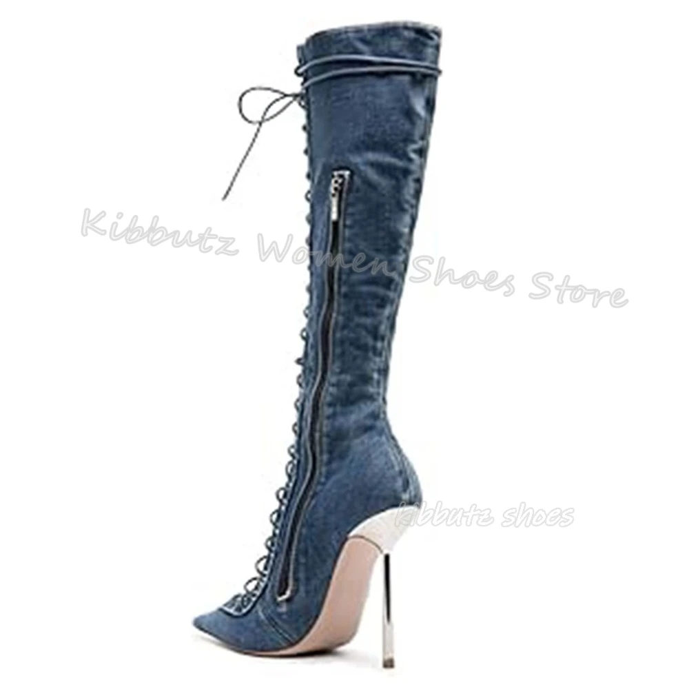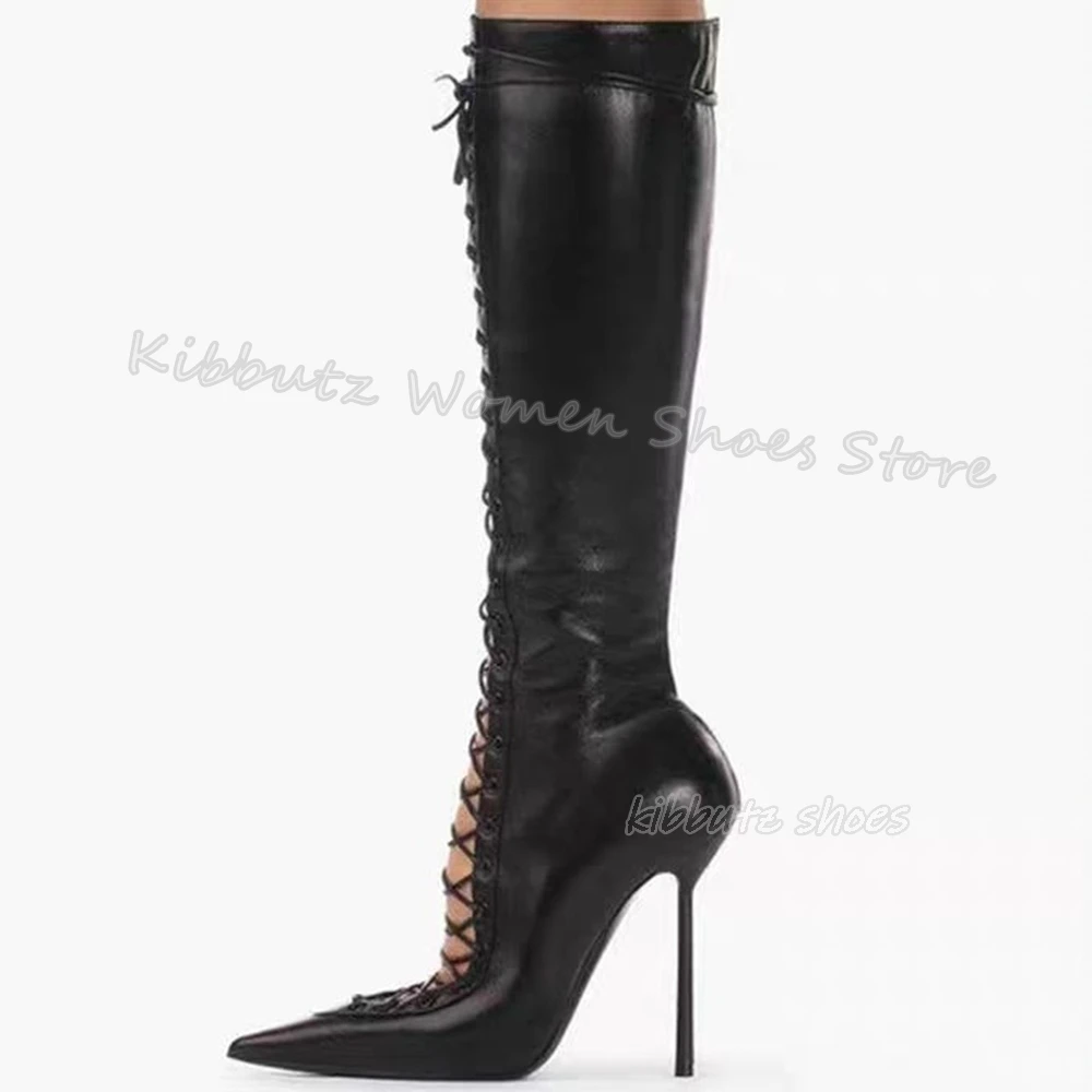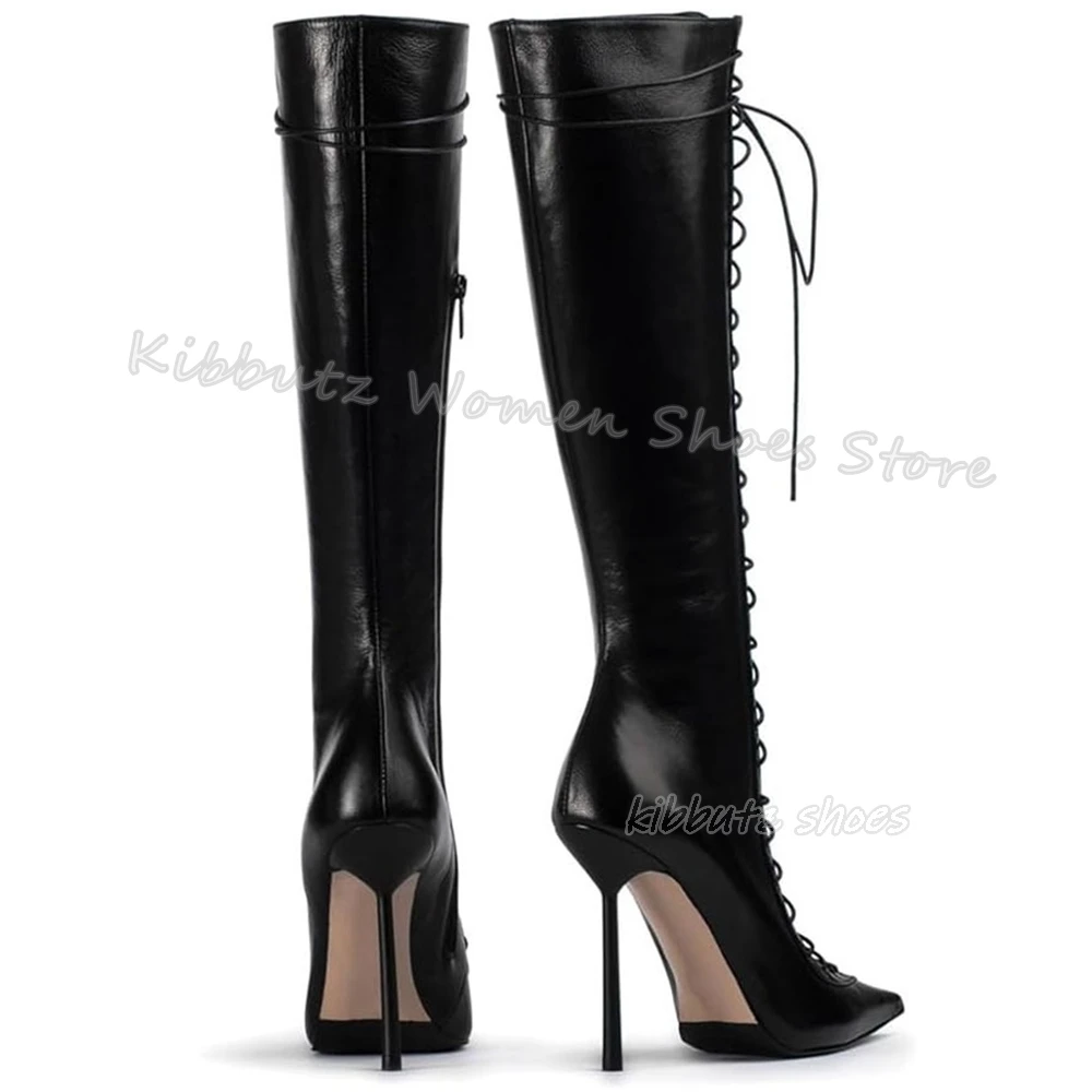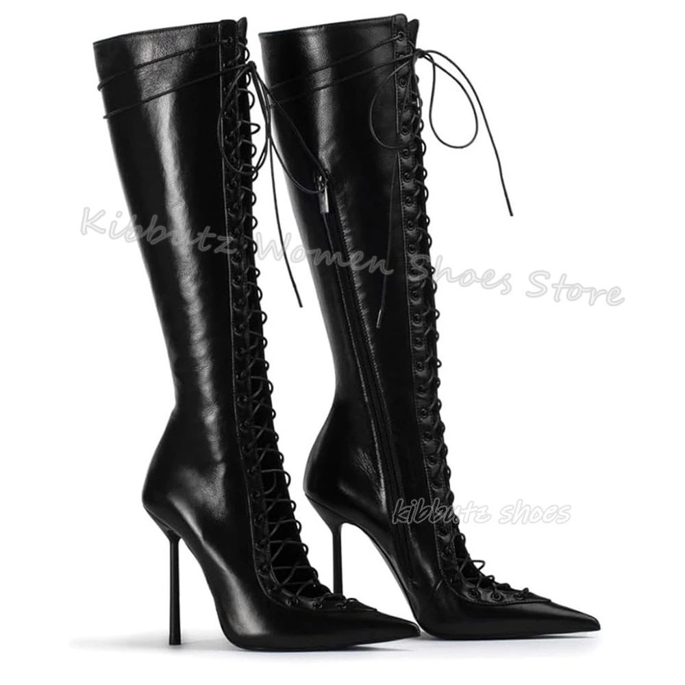 Lace-Up Hollow Knee High Boots Luxury Leather Solid Color Elegant Concise Fashion Sexy Pointed Toe Metal Thin Heels Women Shoes