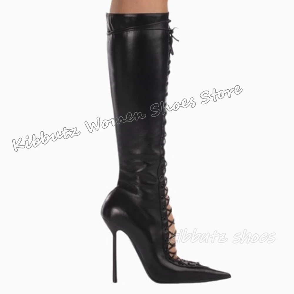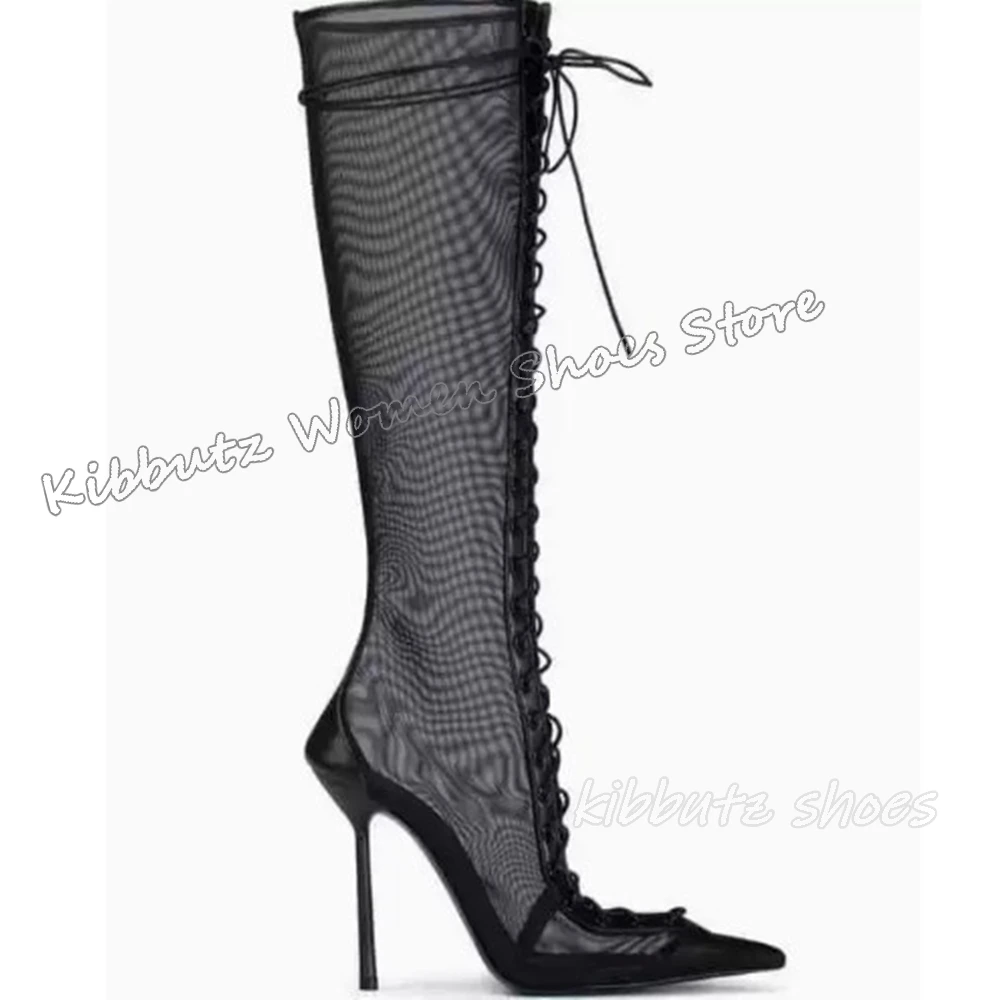 Lace-Up Sandal Ankle Boots Mesh Leather Solid Color Fashion Elegant Luxury Concise Sexy Party Dress Women Shoes New Pointy Heels