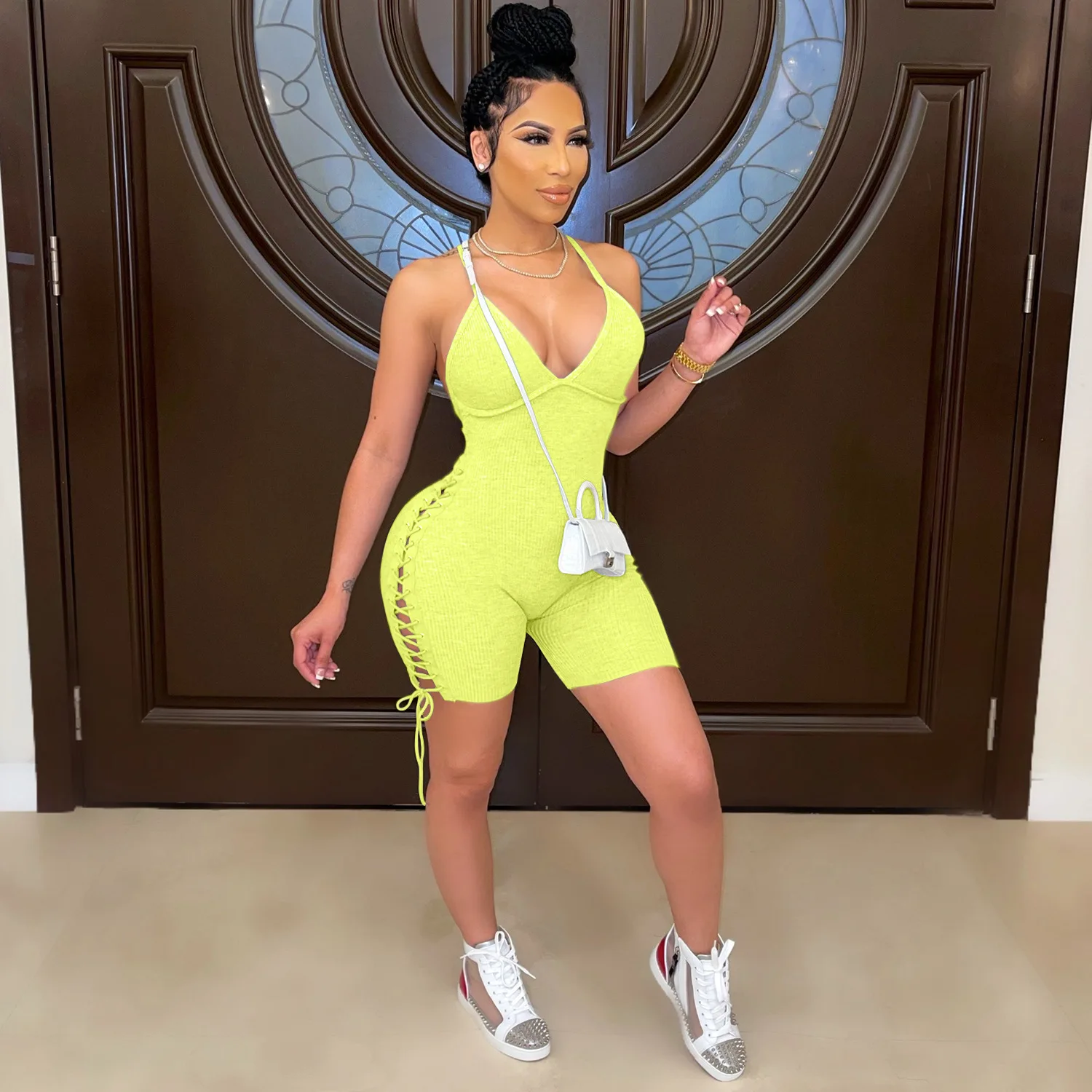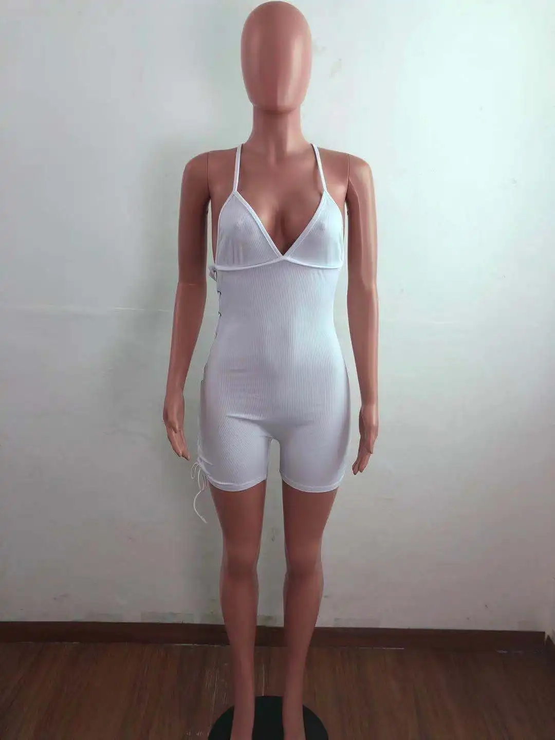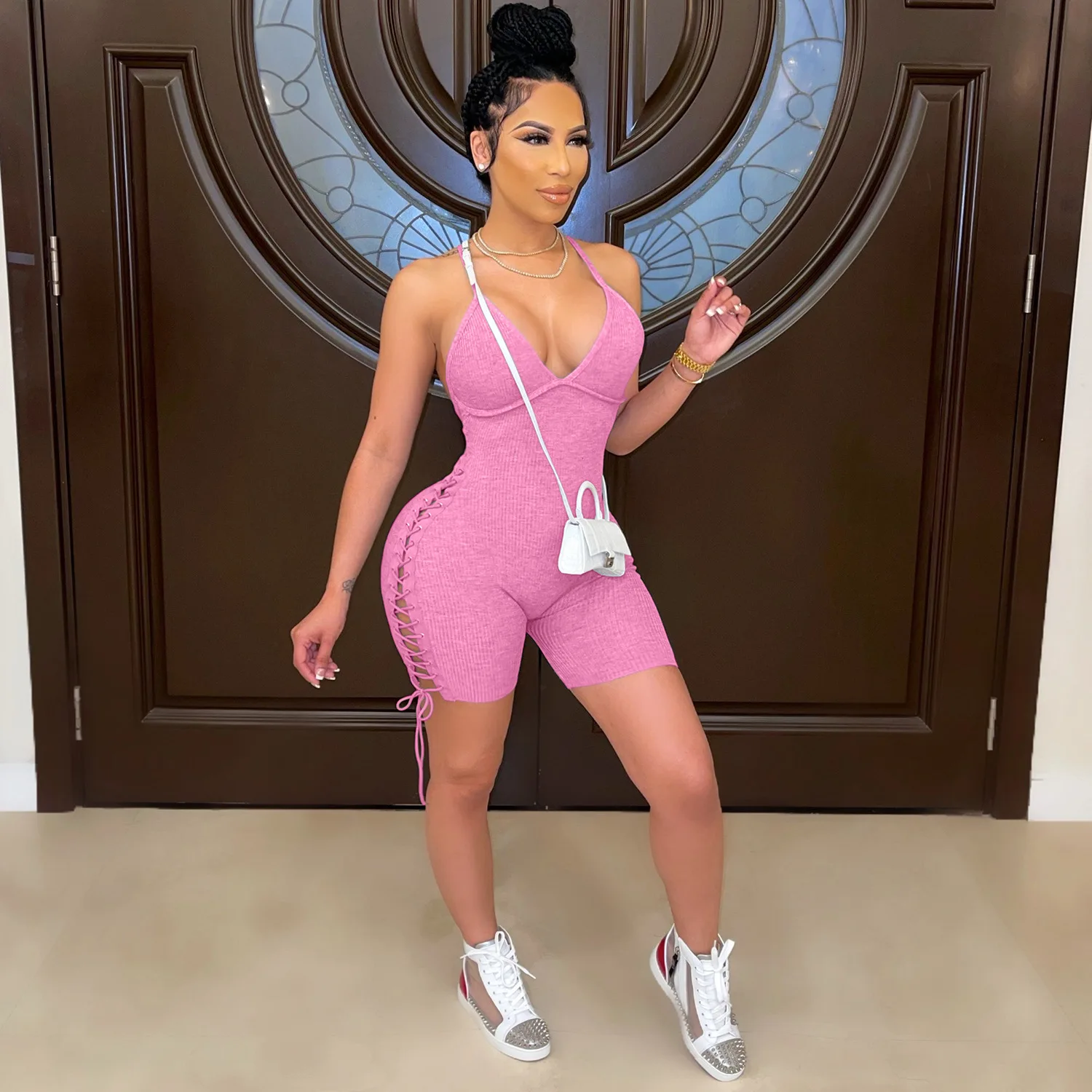 Laced Backless Romper Jumpsuit Shorts Ladies Workout Jumpsuits and Bodysuit Ribbed Halter One Piece Romper Short Jumpsuit
