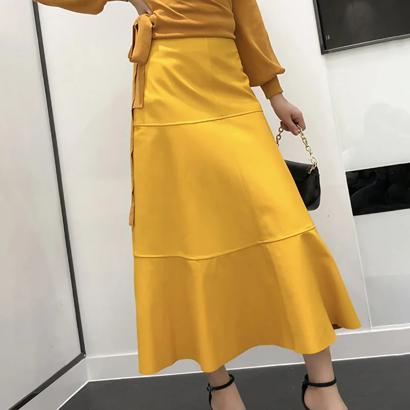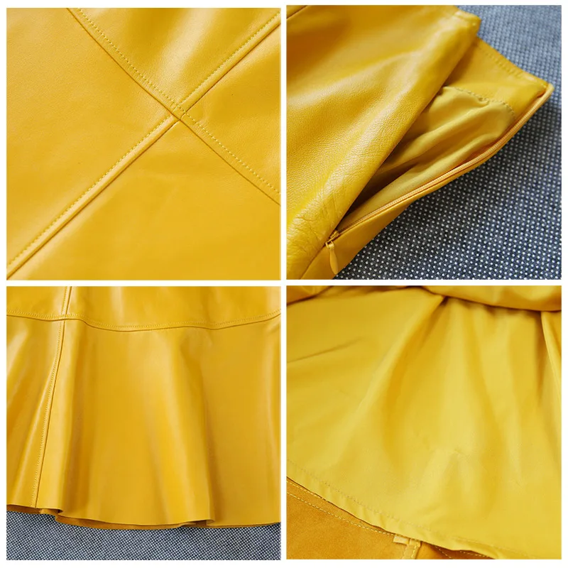 Ladies High Waist Splicing Skirt Ankle Length Women Elegant Genuine Sheepskin Leather Skirt
