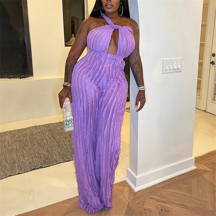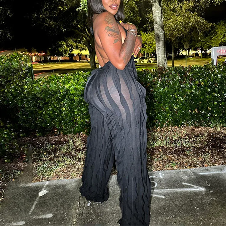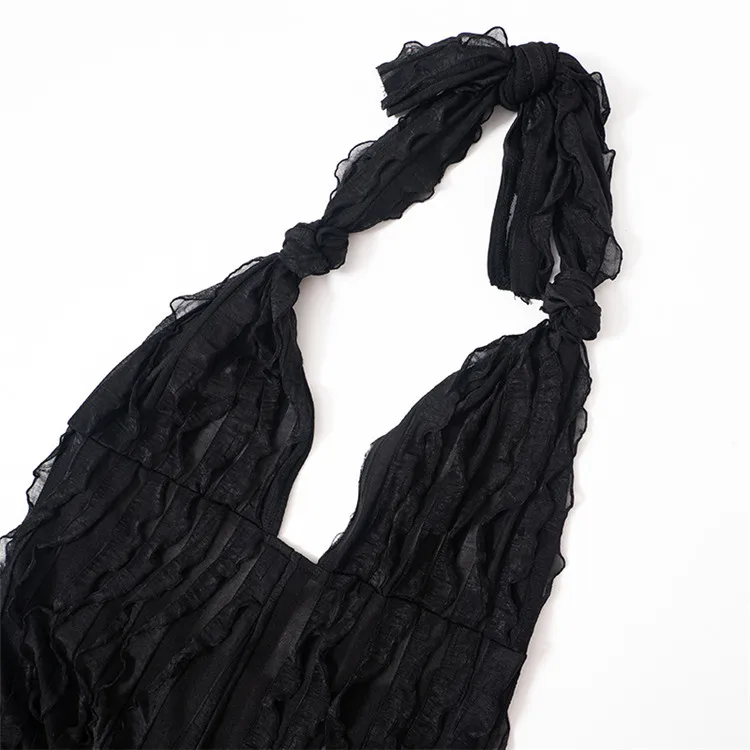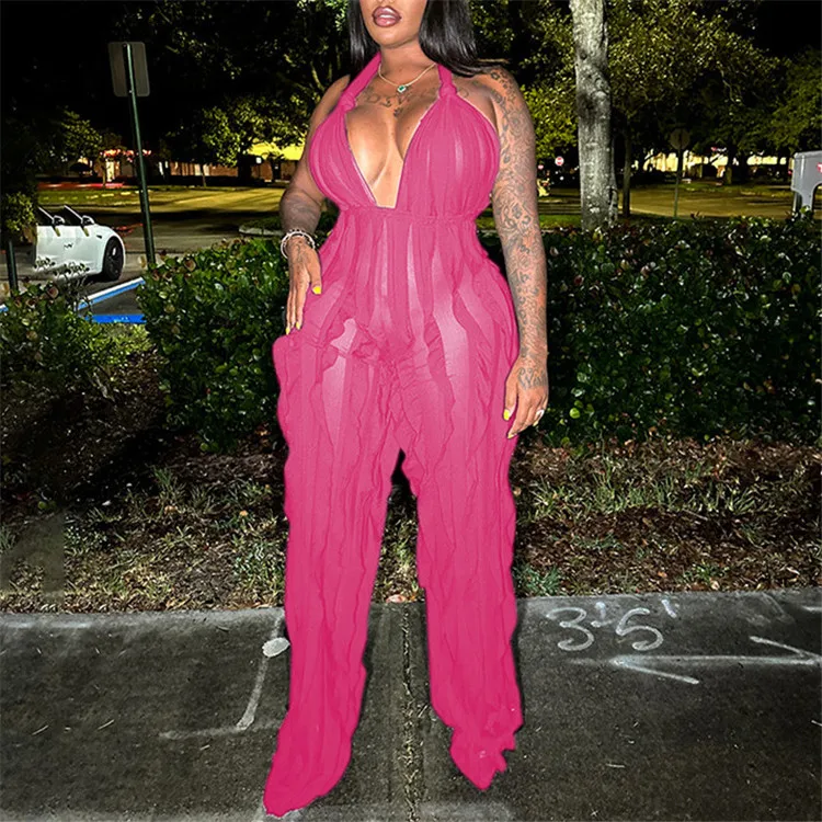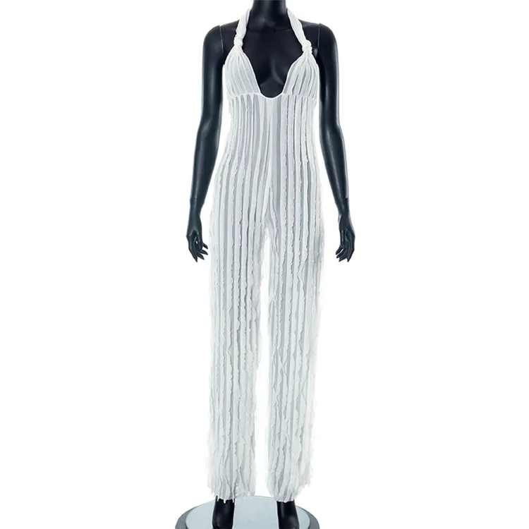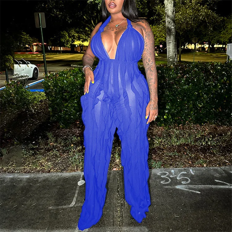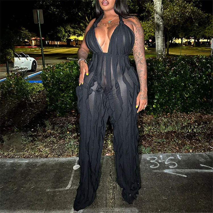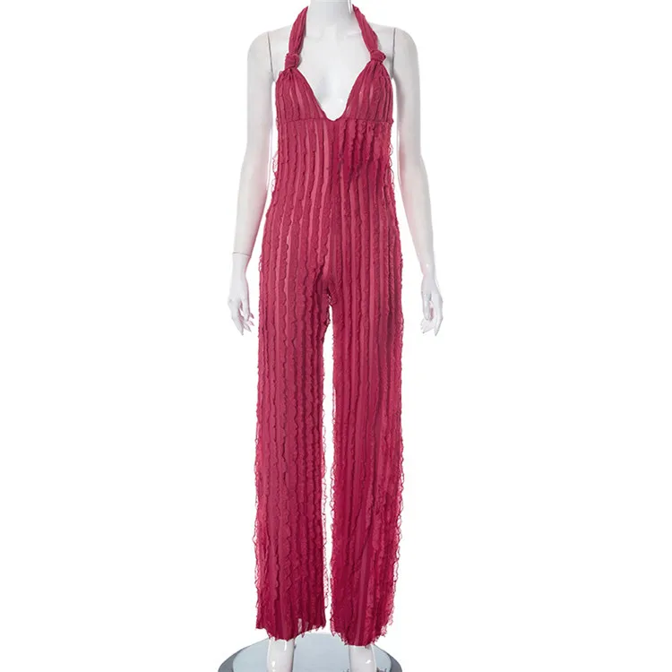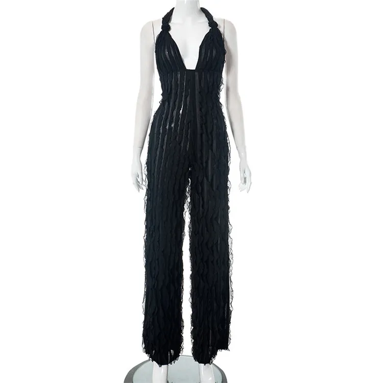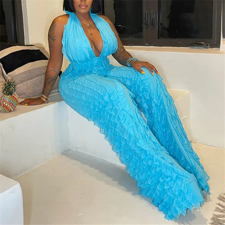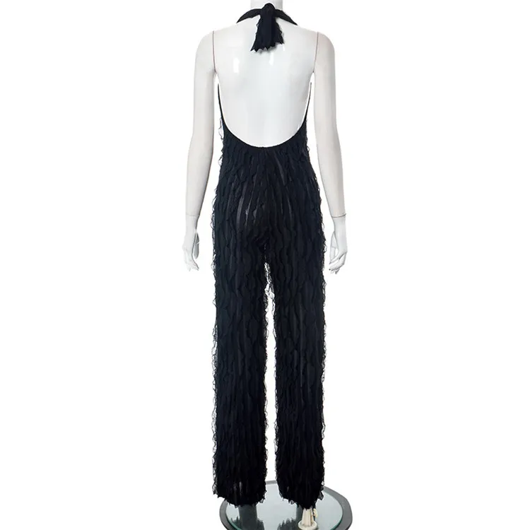 Ladies Summer Ruffle Sleeveless Backless Lace Up Halter V-Neck Sexy Bodycon Jumpsuit Women New Fashion Clubwear One Piece Romper