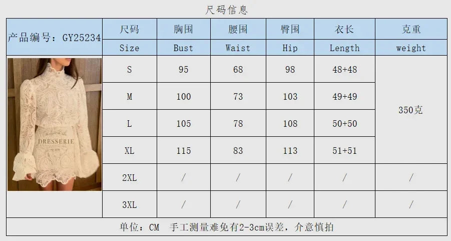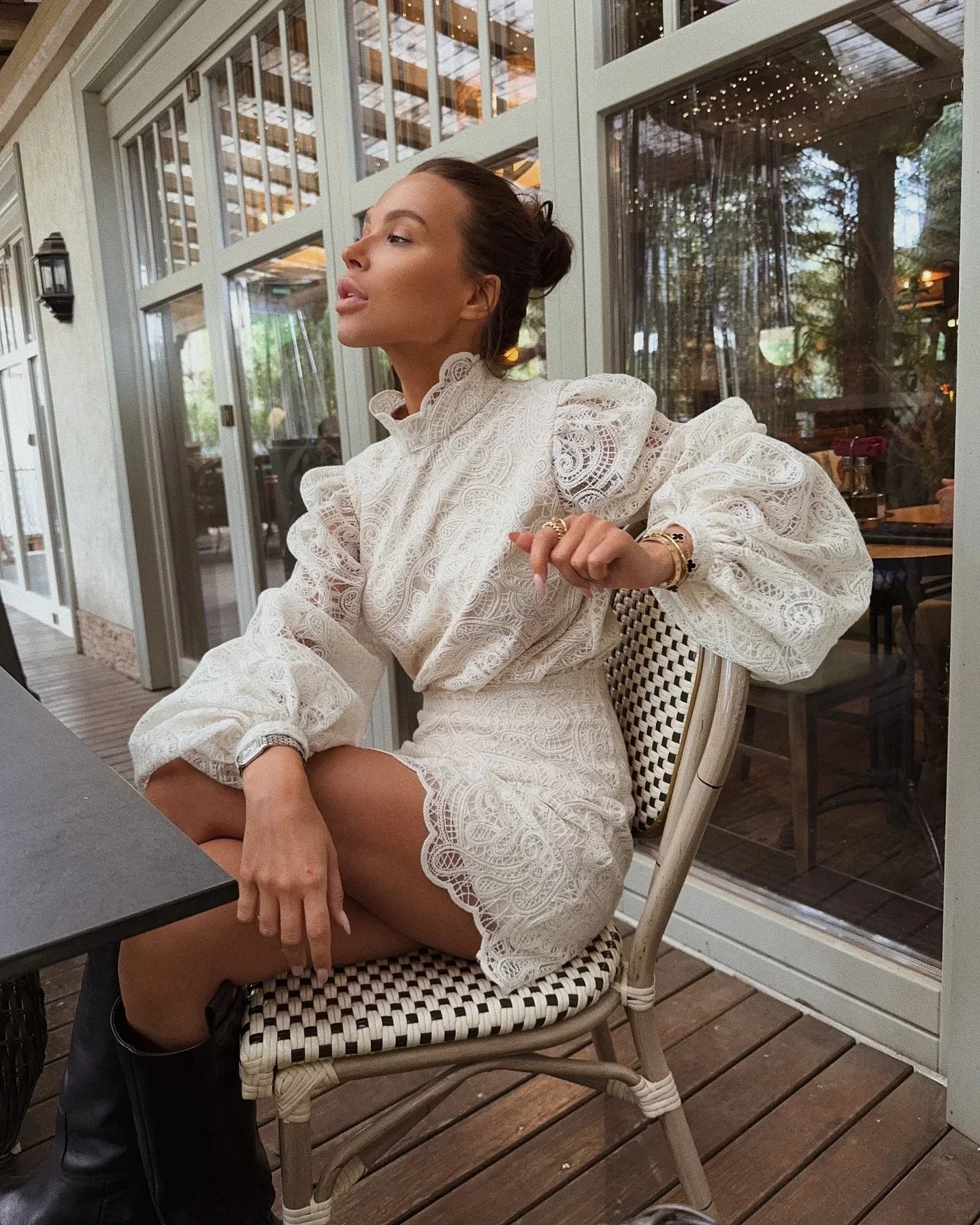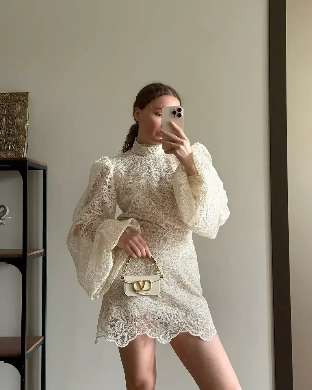 Lady Elegant Hollow Out Lace Short Dresses Trendy Long Sleeve High Neck Mini Vestidos 2025 New Chic Autumn Night Club Gown