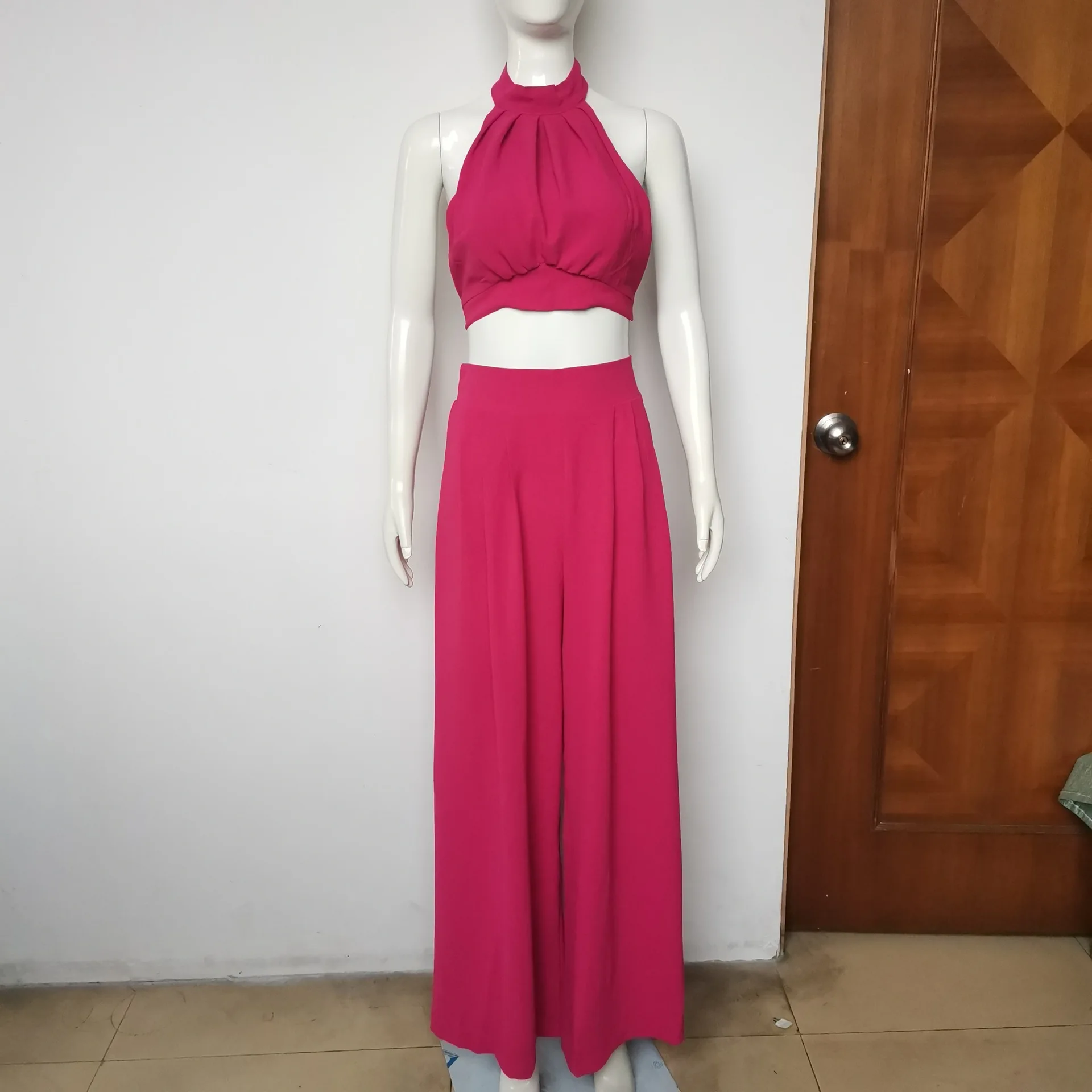 Lady Solid Two Piece Long Pant Suits Women 2023 Summer Halter Crop Top And High Waist Draped Wide Leg Pant Sets