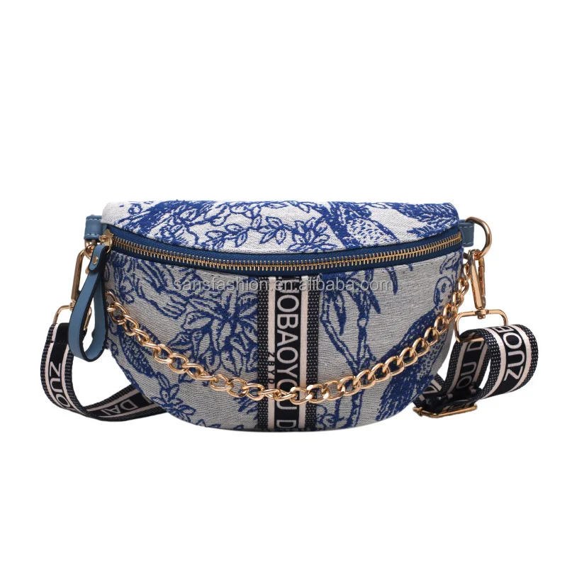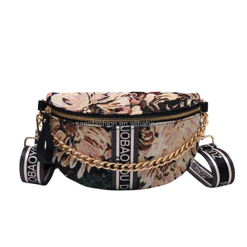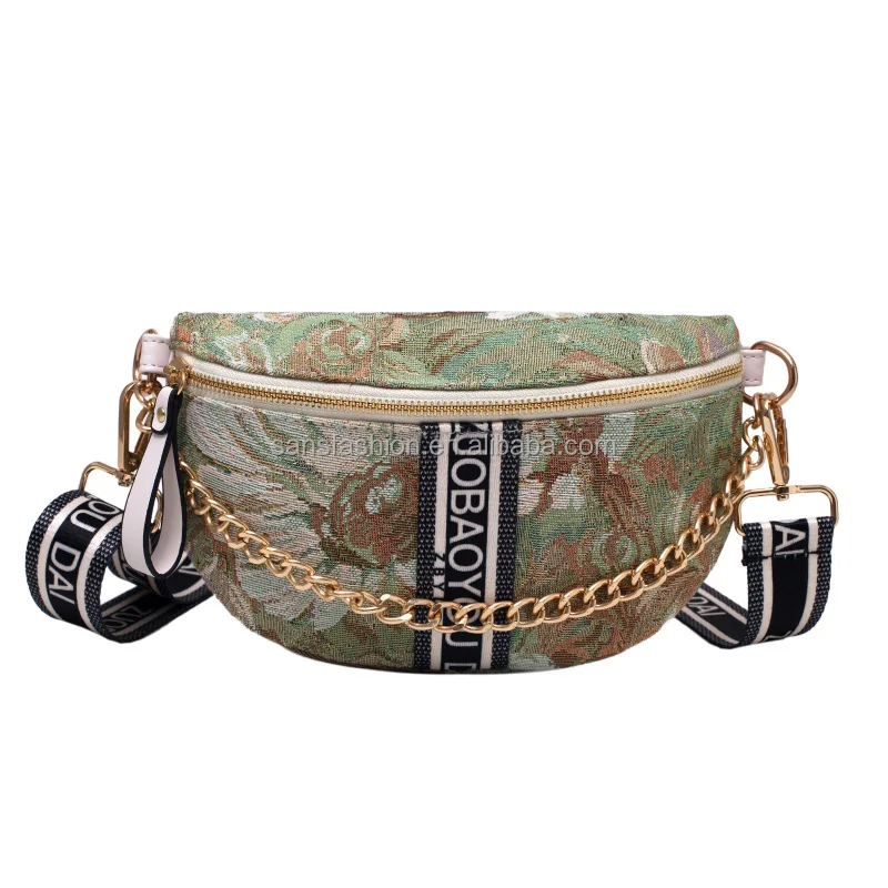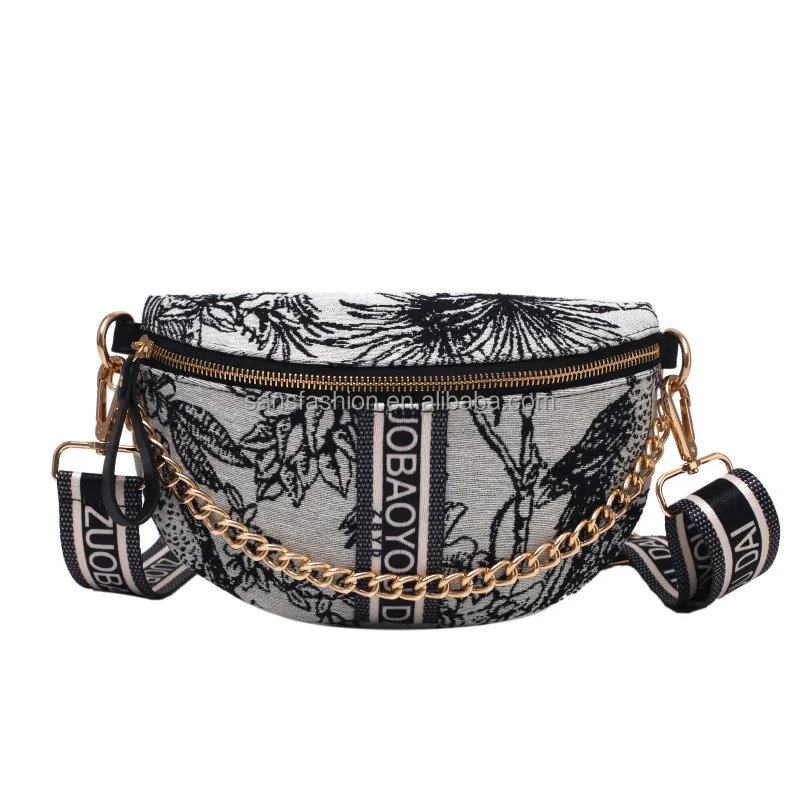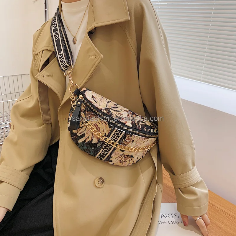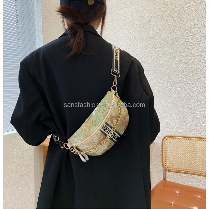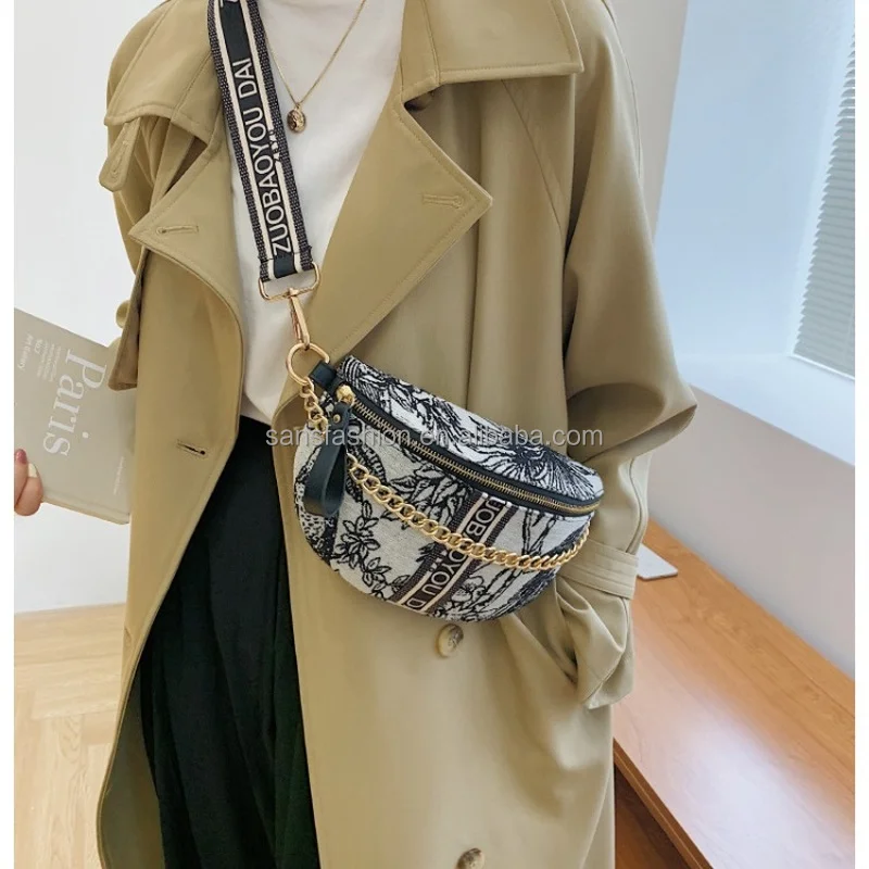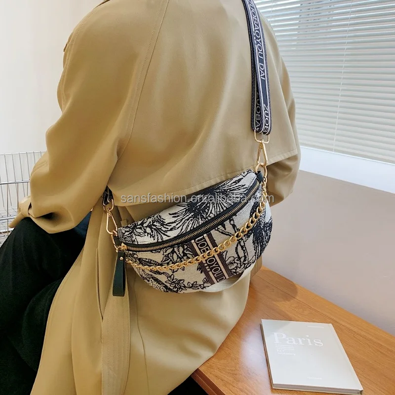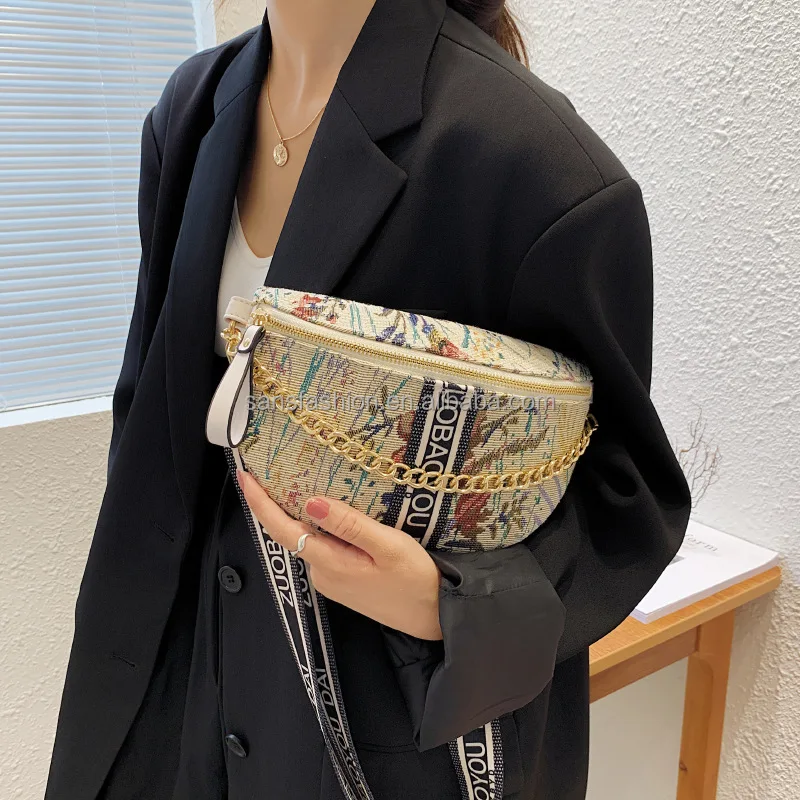 Landscape Painting Letter Printed Waist Bags For Women Wide Straps Canvas Fanny Pack Crossbody Bag Luxury Chain Female Handbags